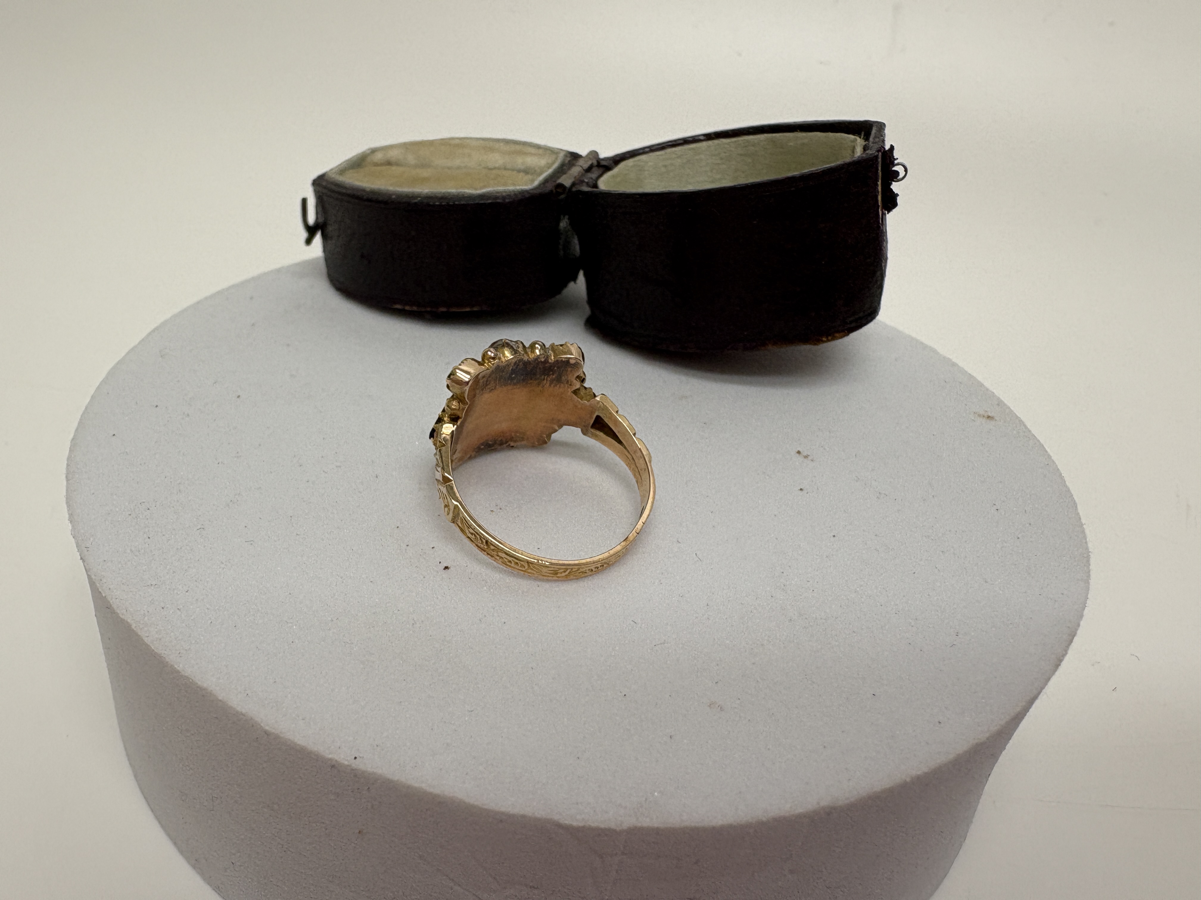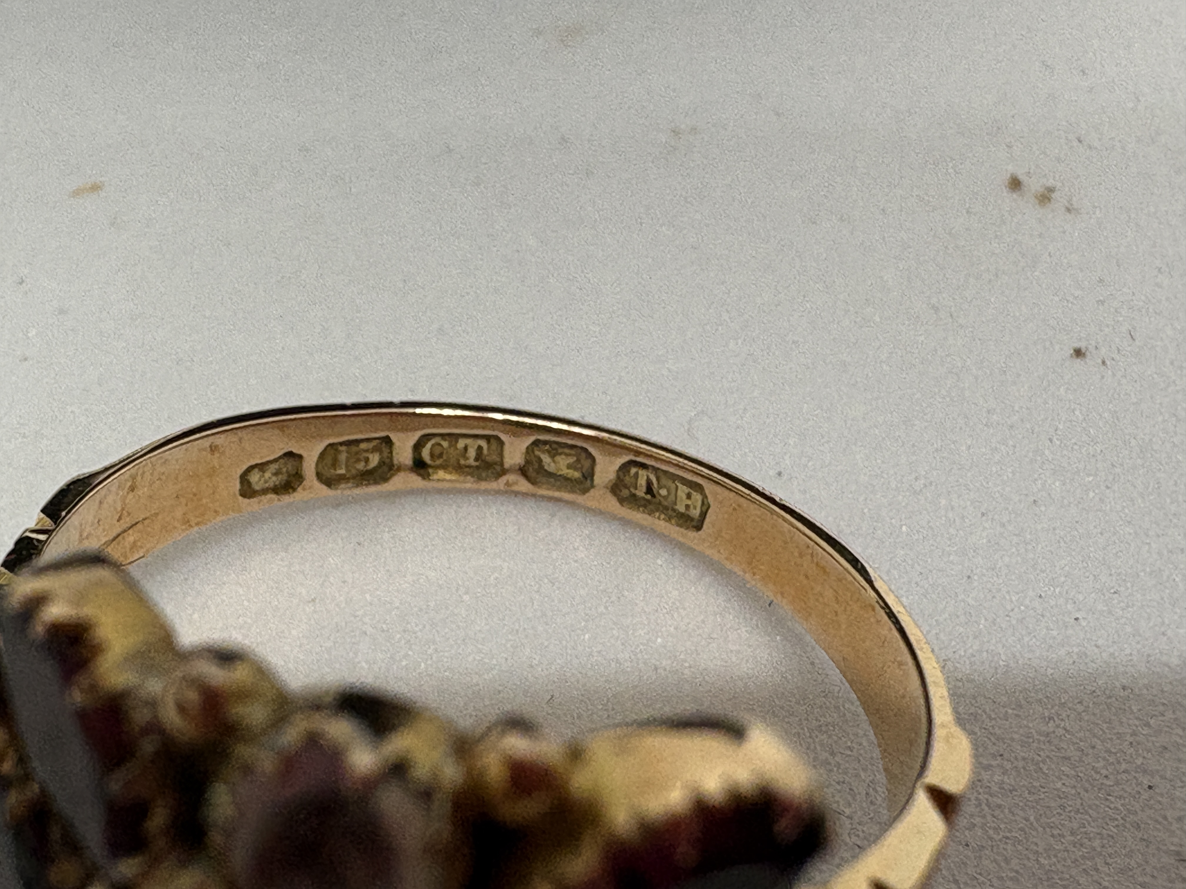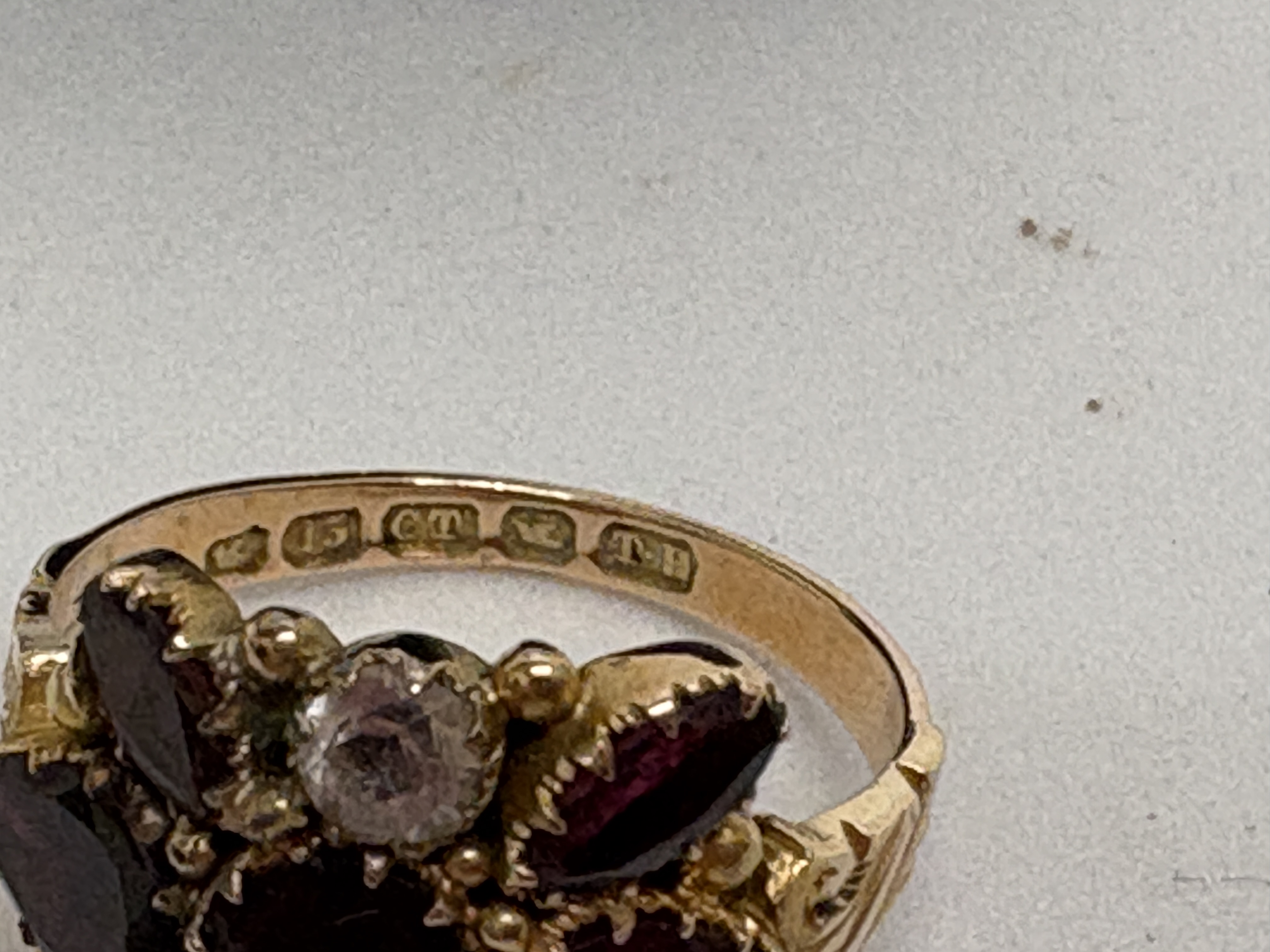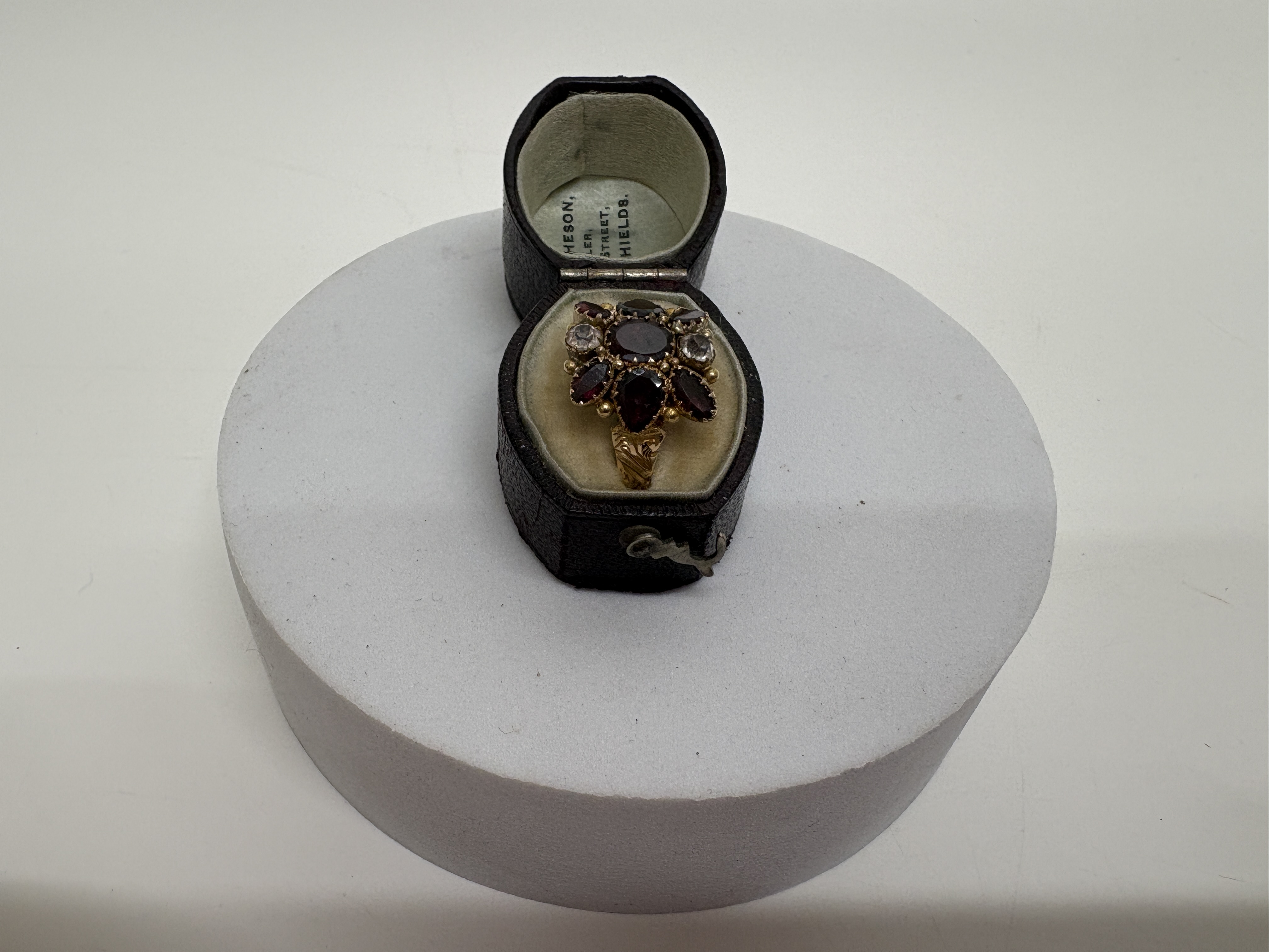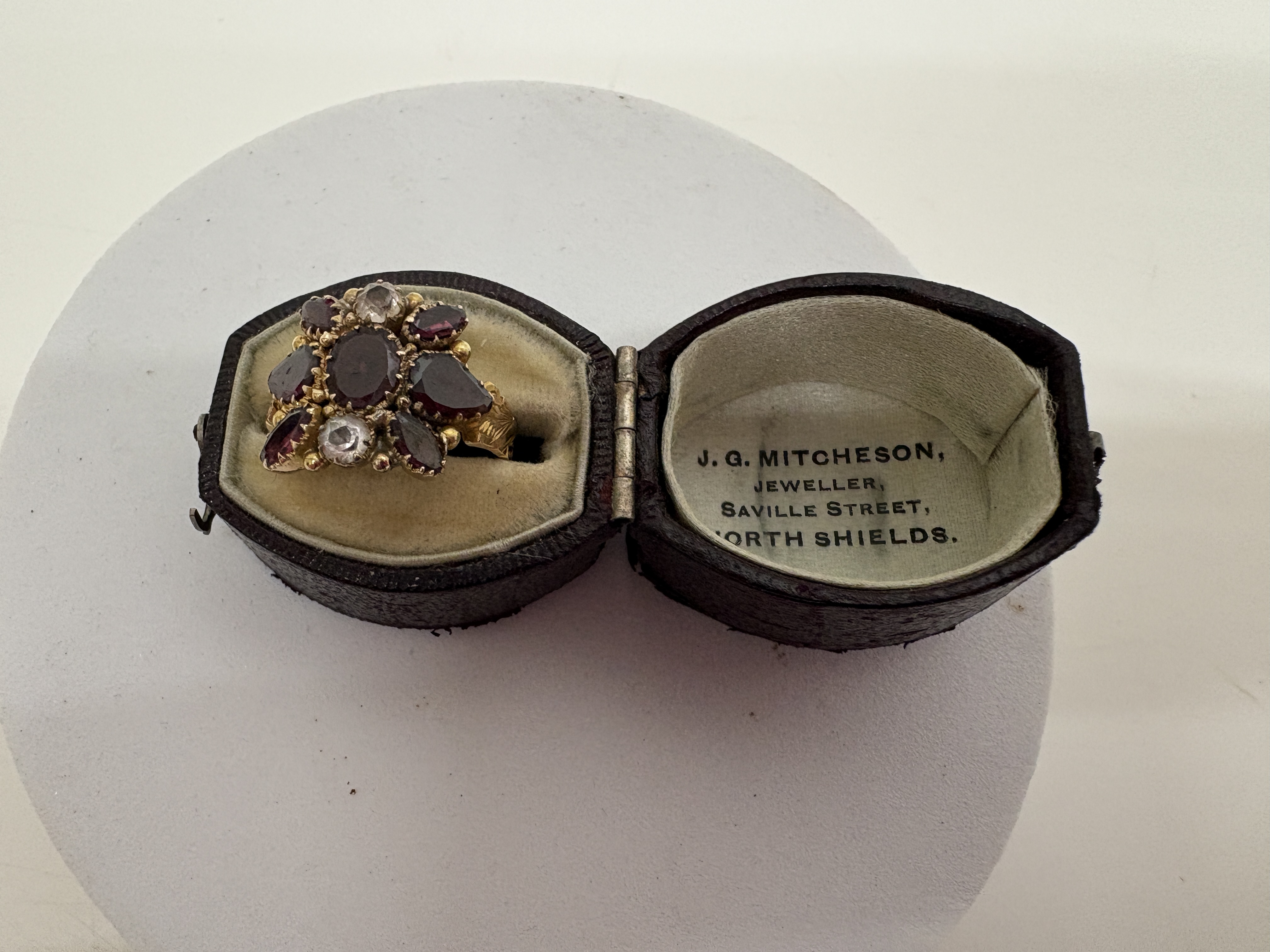 A late Victorian 15 carat yellow gold garnet and diamond cluster ring. The design features a central oval-cut deep red garnet, likely of the almandine variety, surrounded by a cluster of four pear-cut garnets and two round old-cut diamonds. The gemstones are held in individual claw settings within an ornate head featuring a beaded border. The ring is finished with decoratively carved and bifurcated shoulders. The interior of the band is fully hallmarked with the 15 and CT marks for 15 carat gold, the wheatsheaf town mark for Chester, and the maker’s mark T.H. This piece is presented in its original fitted leatherette and velvet retailer’s box from J. G. Mitcheson, Jeweller, Saville Street, North Shields. Size: Not specified. Weight: Not specified.