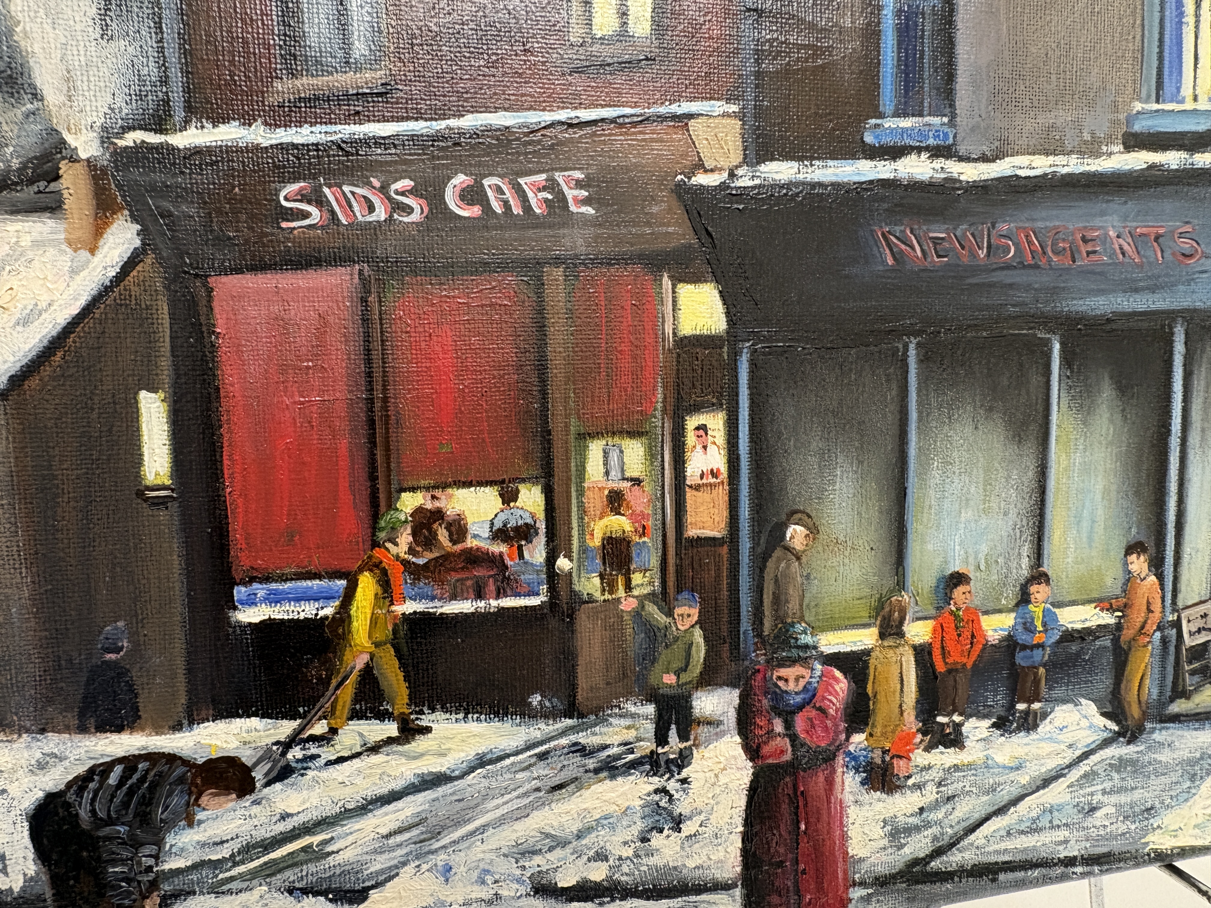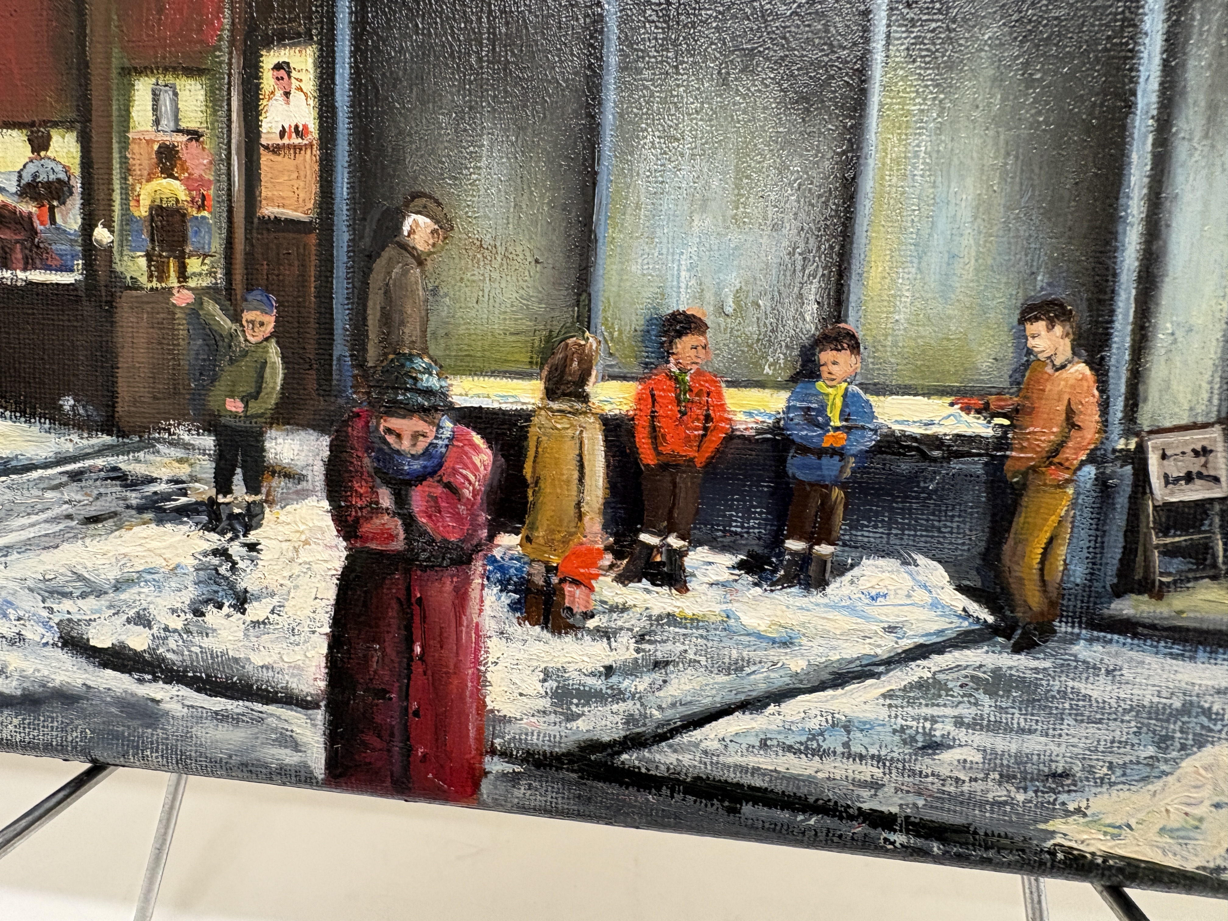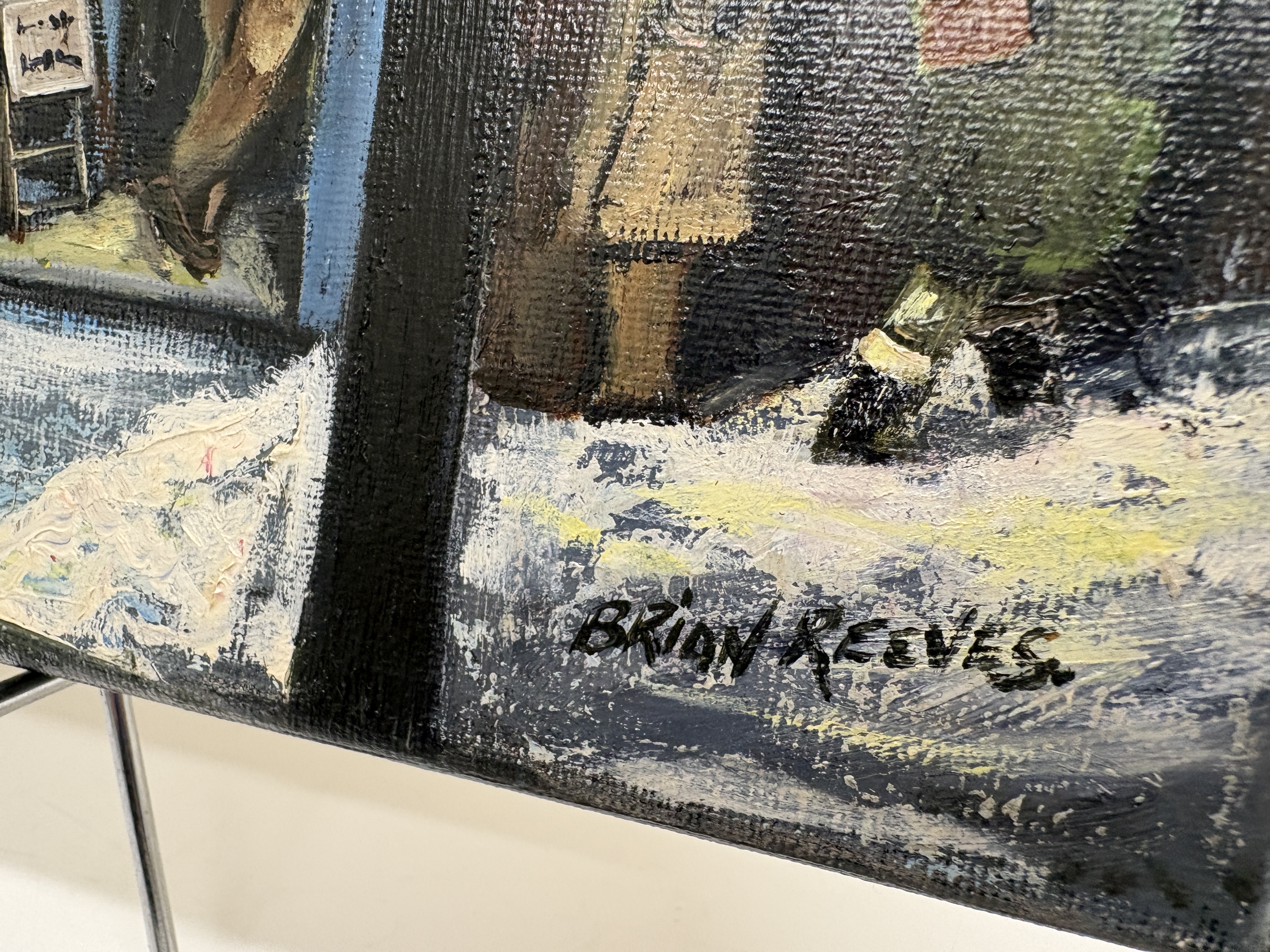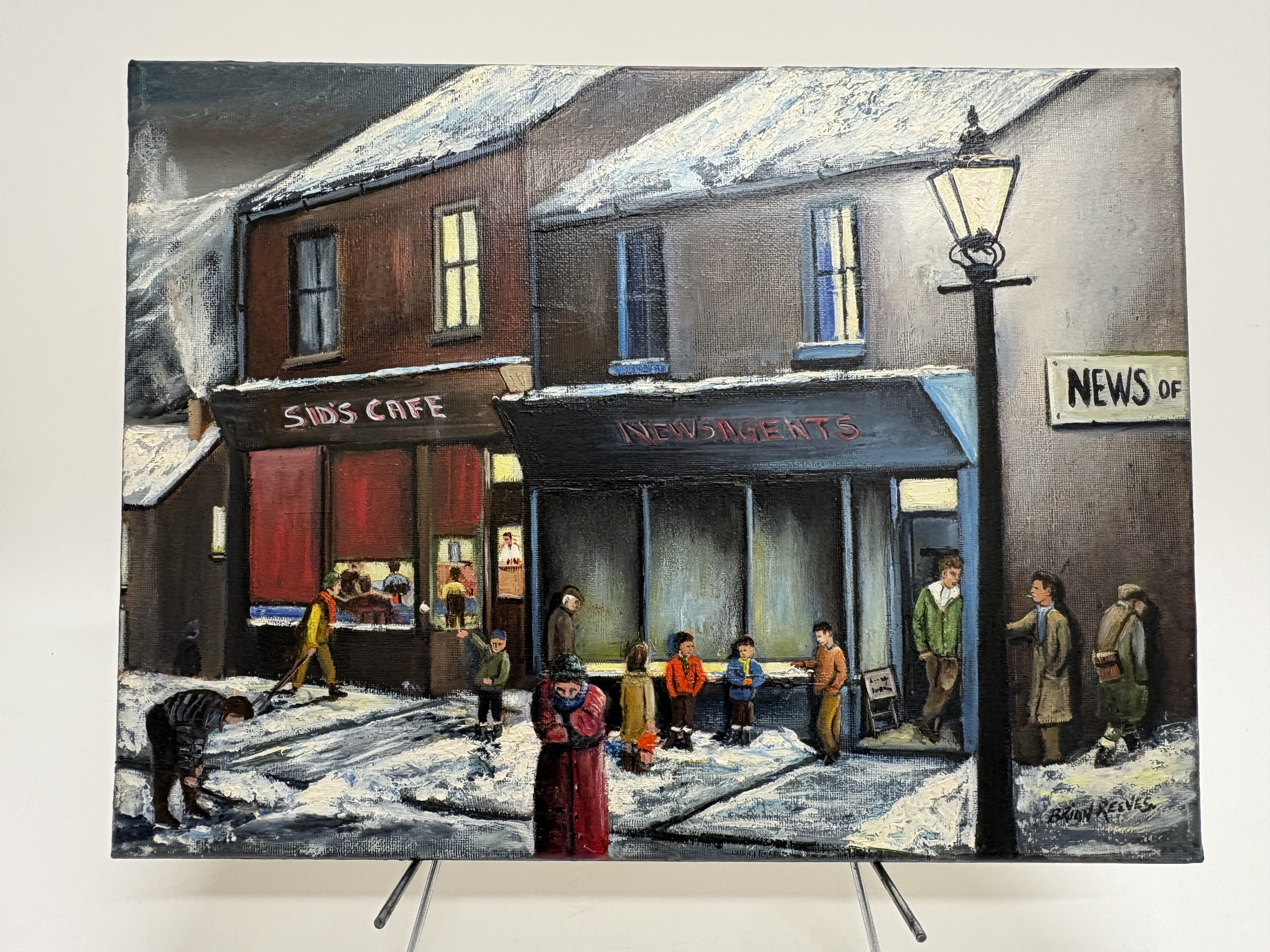 Brian Reeves (Welsh, contemporary). An oil on canvas titled”Waiting for Dad. The work depicts a family patiently waiting for the man of the house . The composition is rendered in a social realist style, sharing visual affinities with the works of Bob Barker and Phil George, featuring expressive brushwork and significant impasto used to define the texture of the snow. The painting is signed BRIAN REEVES in black to the lower right corner. To the verso, the canvas is titled in pencil CAFE STILL OPEN, signed and dated 2012. Both the canvas reverse and the wooden stretcher bars bear multiple ink stamps reading WELSH ARTIST BRIAN REEVES. A printed biographical flyer for the artist is stapled to the reverse. The item is an unframed, gallery-wrapped canvas.