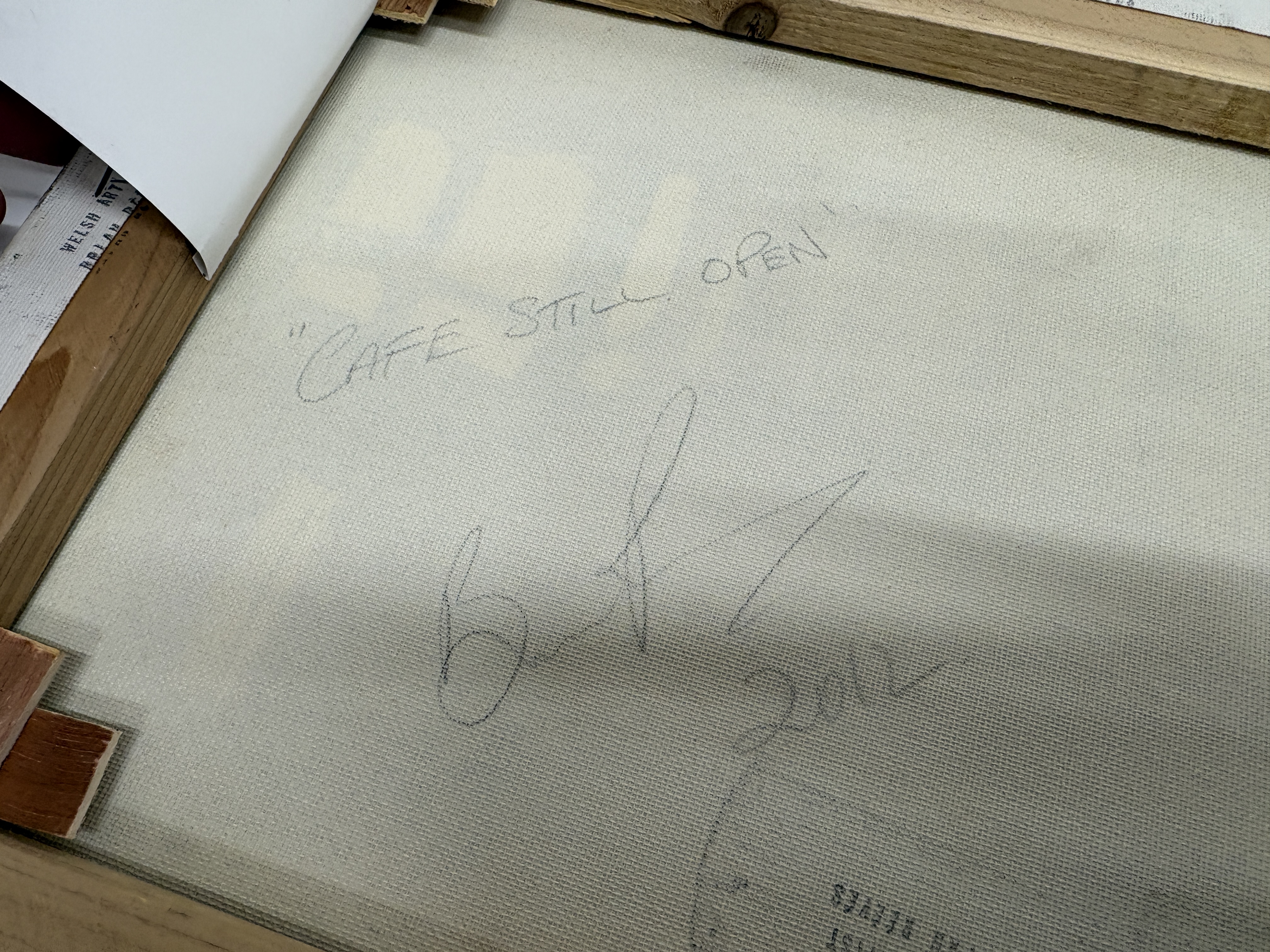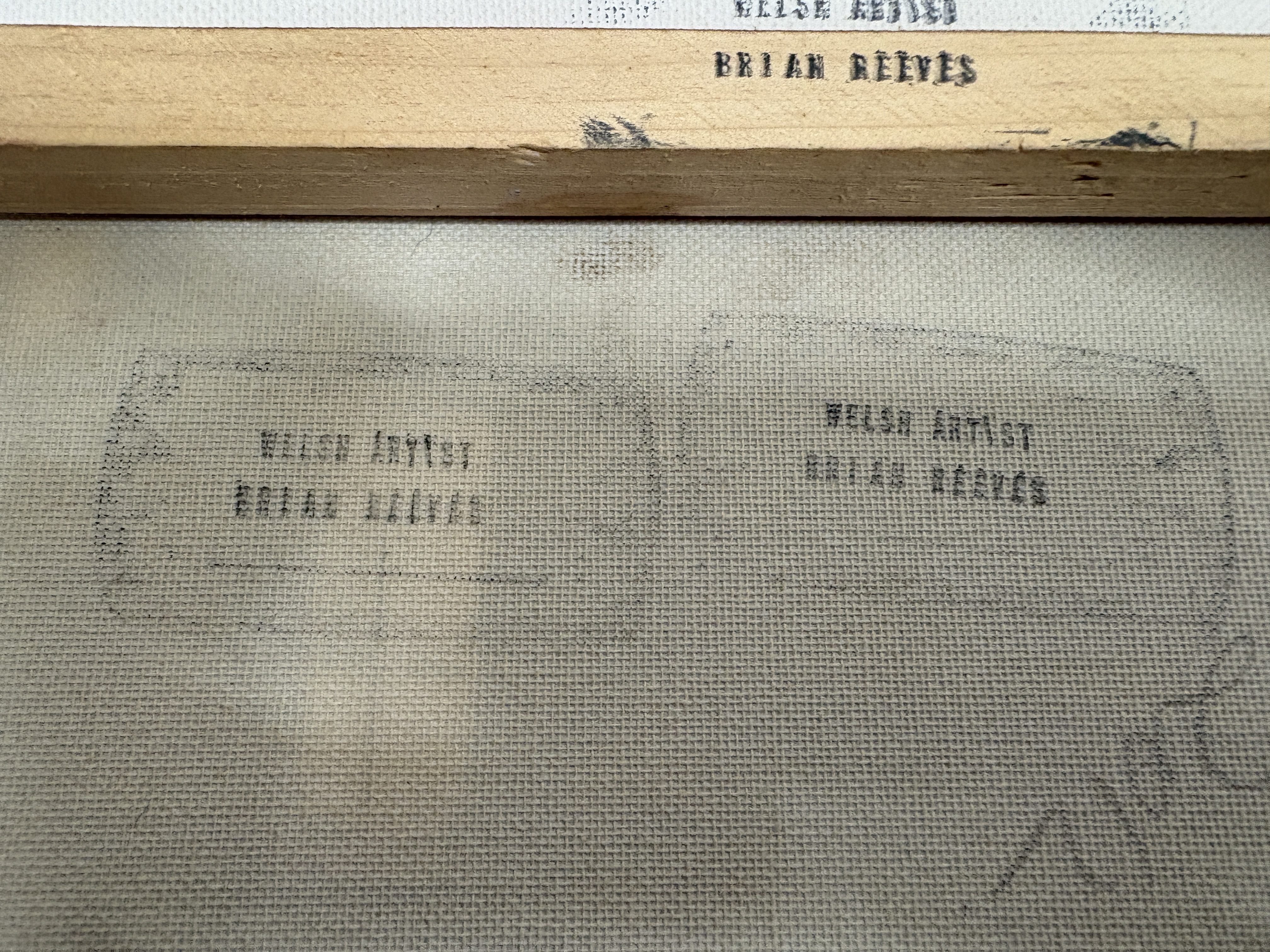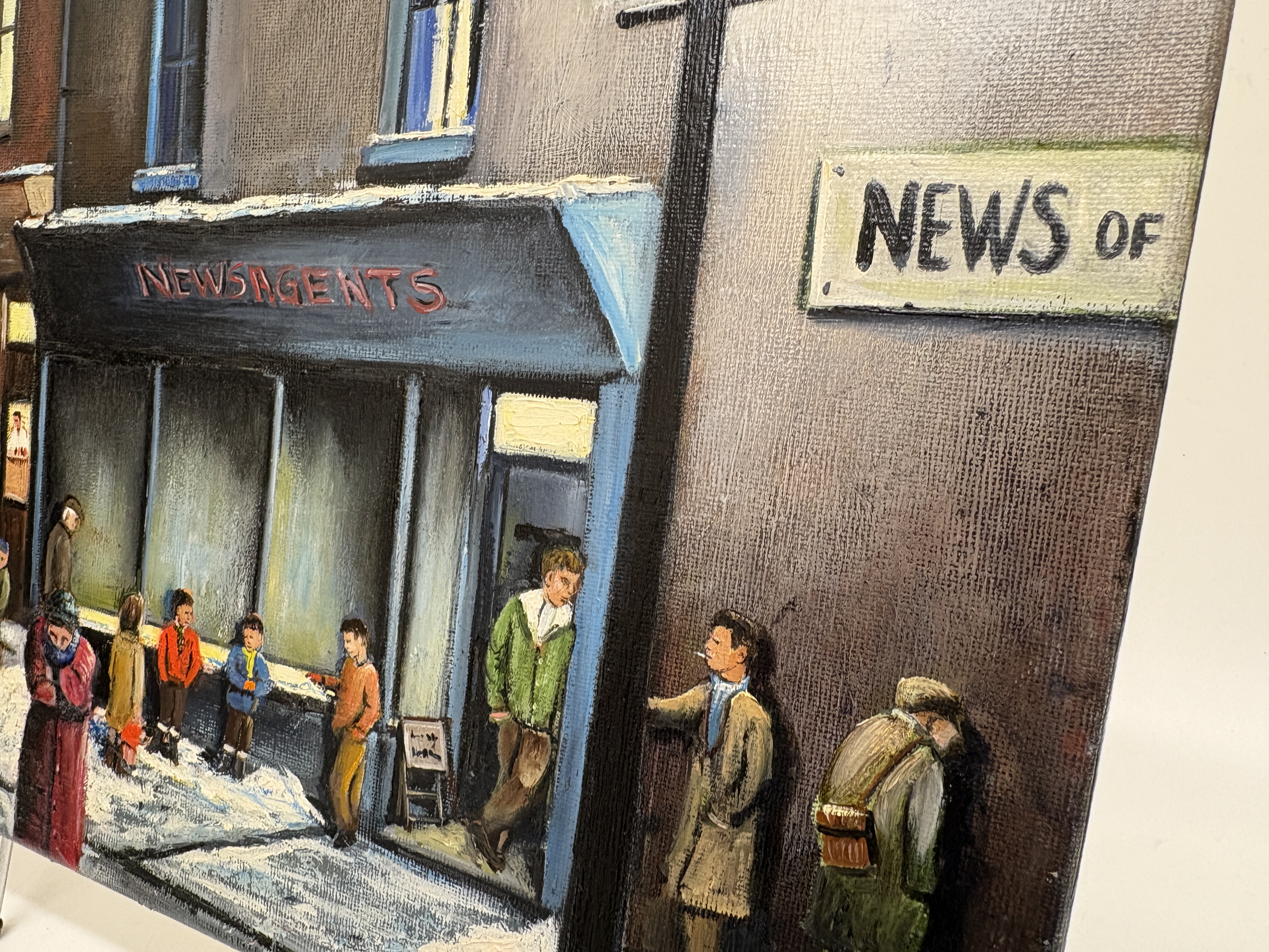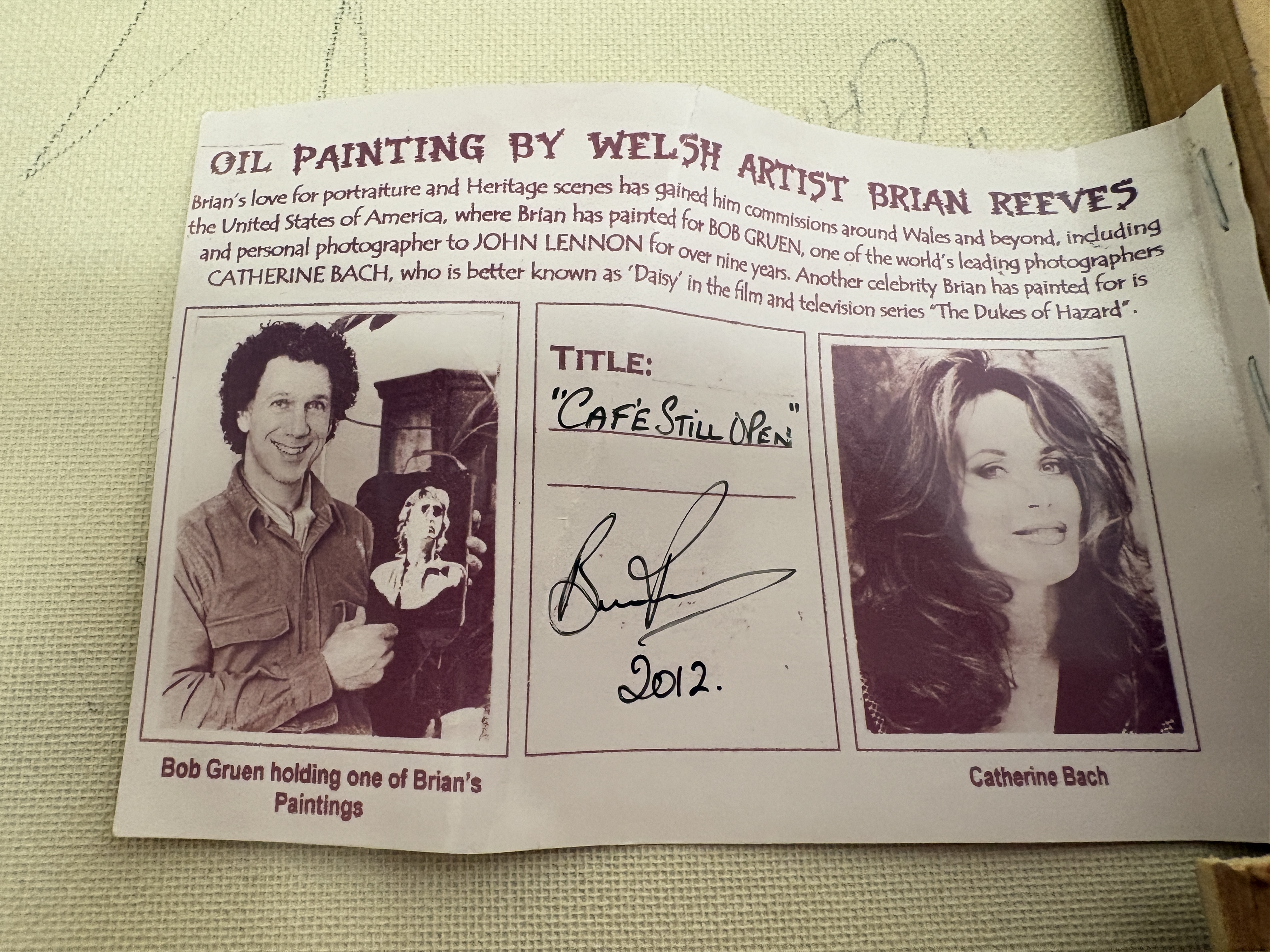 Brian Reeves (Welsh, contemporary). An oil on canvas titled”Waiting for Dad. The work depicts a family patiently waiting for the man of the house . The composition is rendered in a social realist style, sharing visual affinities with the works of Bob Barker and Phil George, featuring expressive brushwork and significant impasto used to define the texture of the snow. The painting is signed BRIAN REEVES in black to the lower right corner. To the verso, the canvas is titled in pencil CAFE STILL OPEN, signed and dated 2012. Both the canvas reverse and the wooden stretcher bars bear multiple ink stamps reading WELSH ARTIST BRIAN REEVES. A printed biographical flyer for the artist is stapled to the reverse. The item is an unframed, gallery-wrapped canvas.