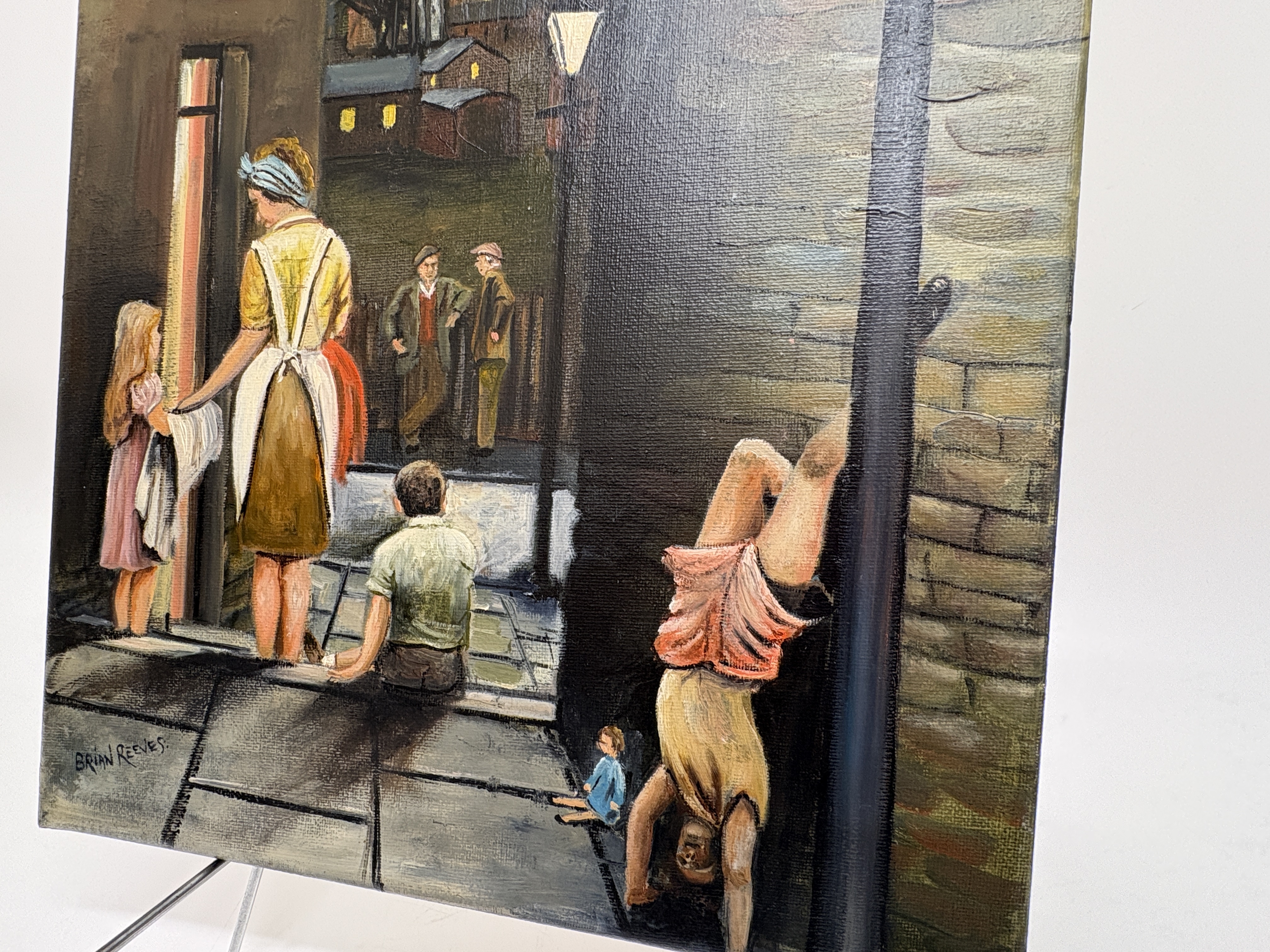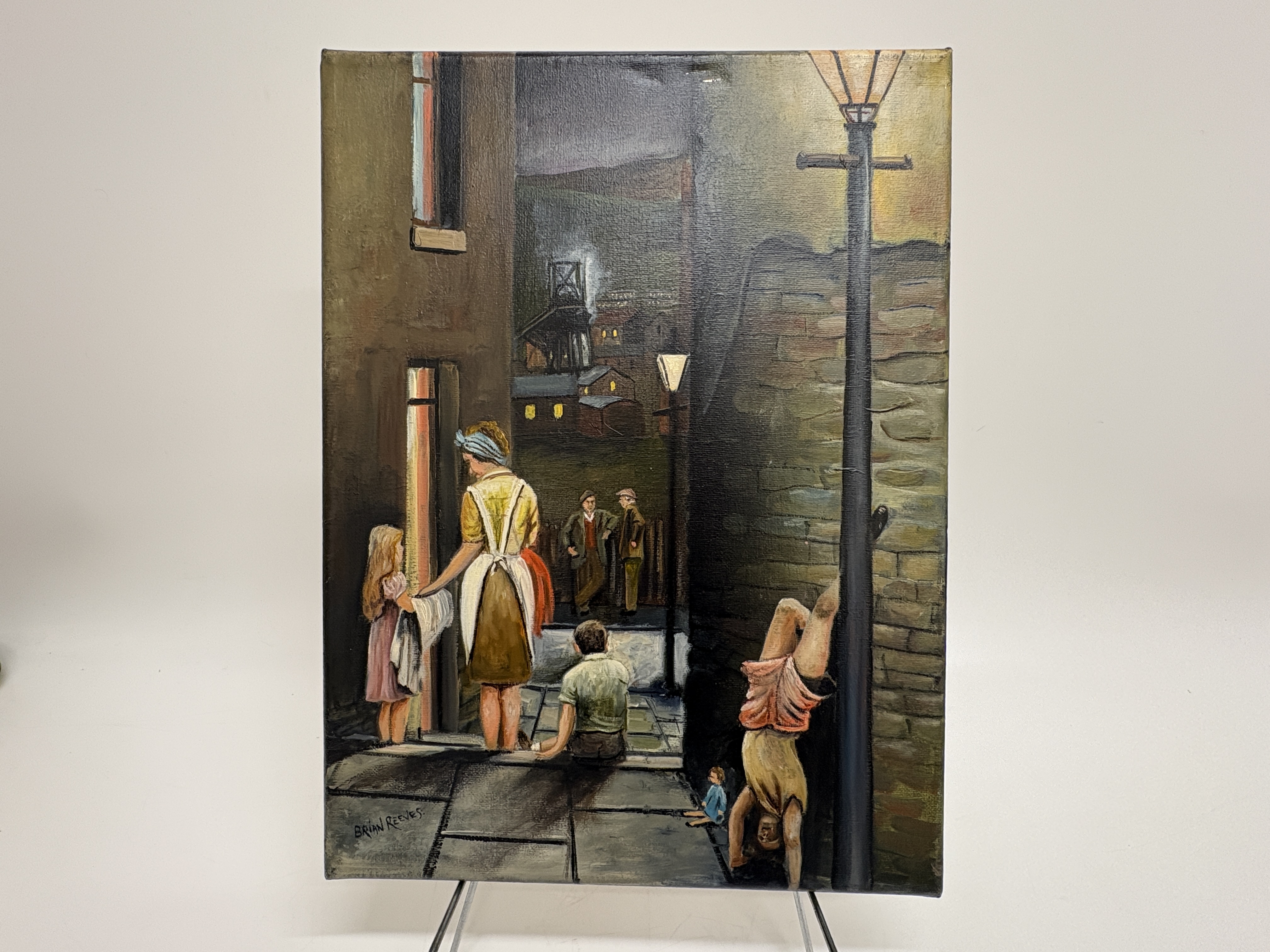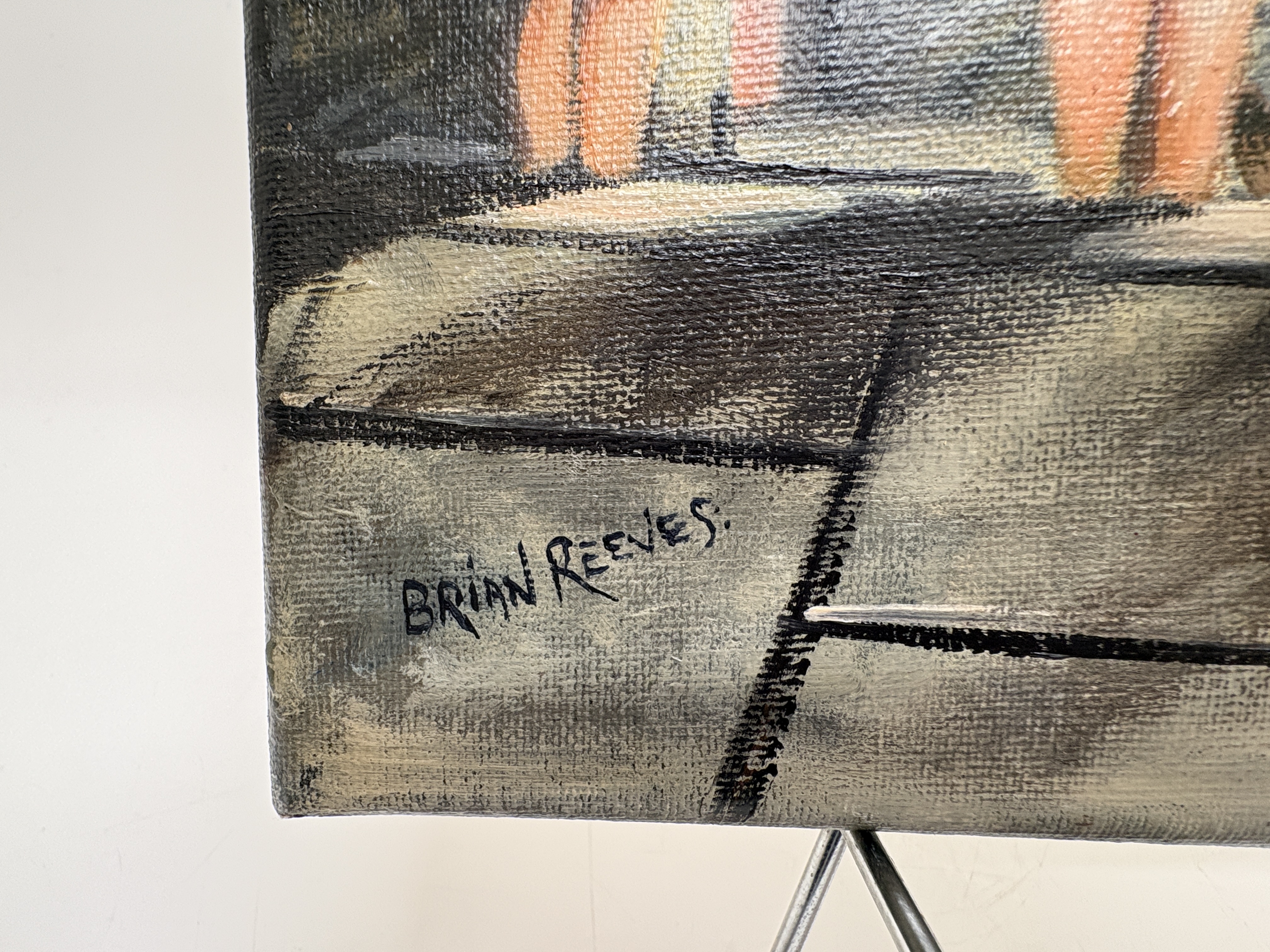 Brian Reeves (Welsh, contemporary). An oil on canvas. The composition is rendered in a social realist style, sharing visual affinities with the works of Bob Barker and Phil George, featuring expressive brushwork and significant impasto used to define the texture of the snow. The painting is signed BRIAN REEVES in black to the lower right corner. To the verso, the canvas is titled in pencil CAFE STILL OPEN, signed and dated 2012. Both the canvas reverse and the wooden stretcher bars bear multiple ink stamps reading WELSH ARTIST BRIAN REEVES. A printed biographical flyer for the artist is stapled to the reverse. The item is an unframed, gallery-wrapped canvas.