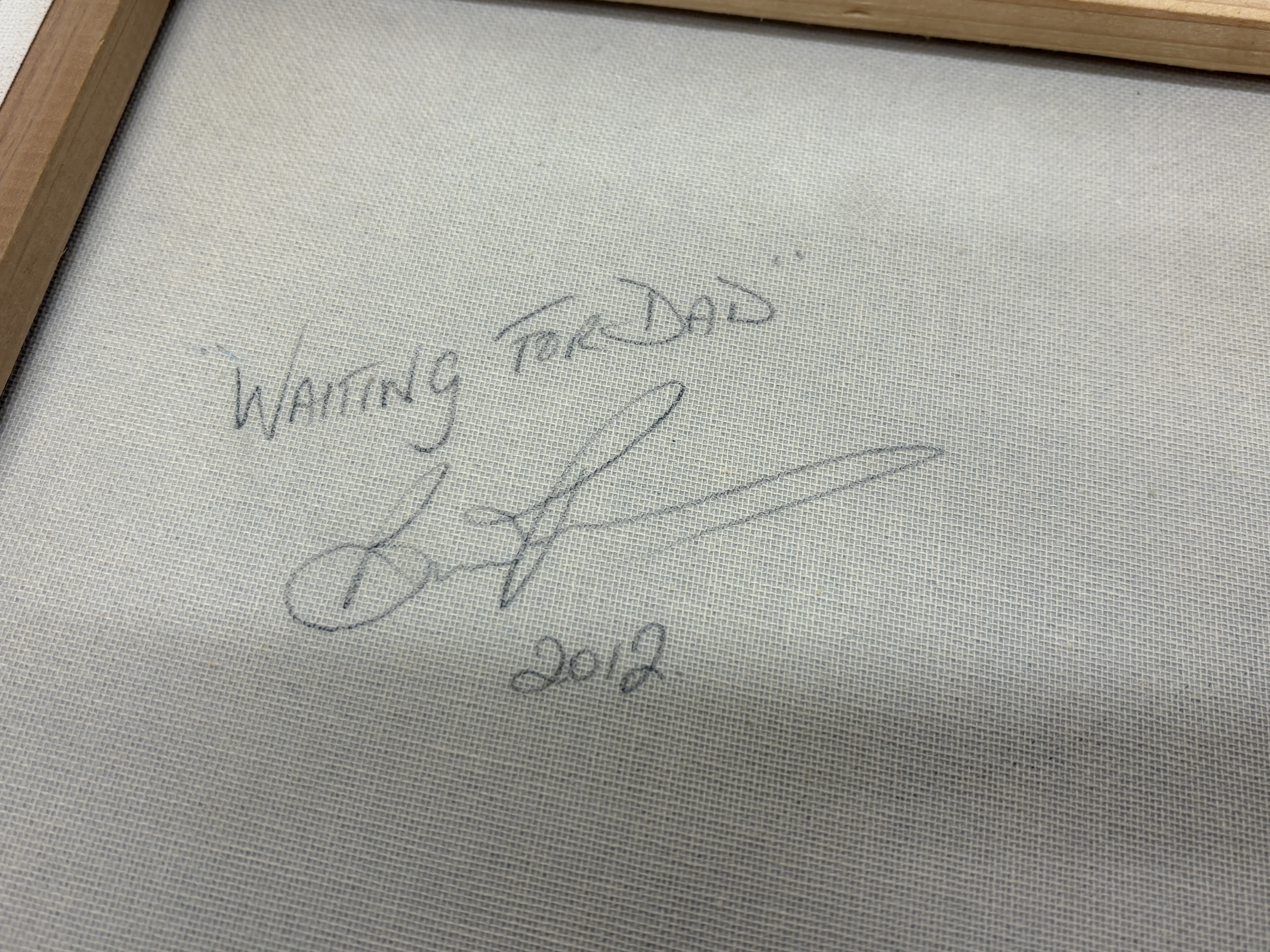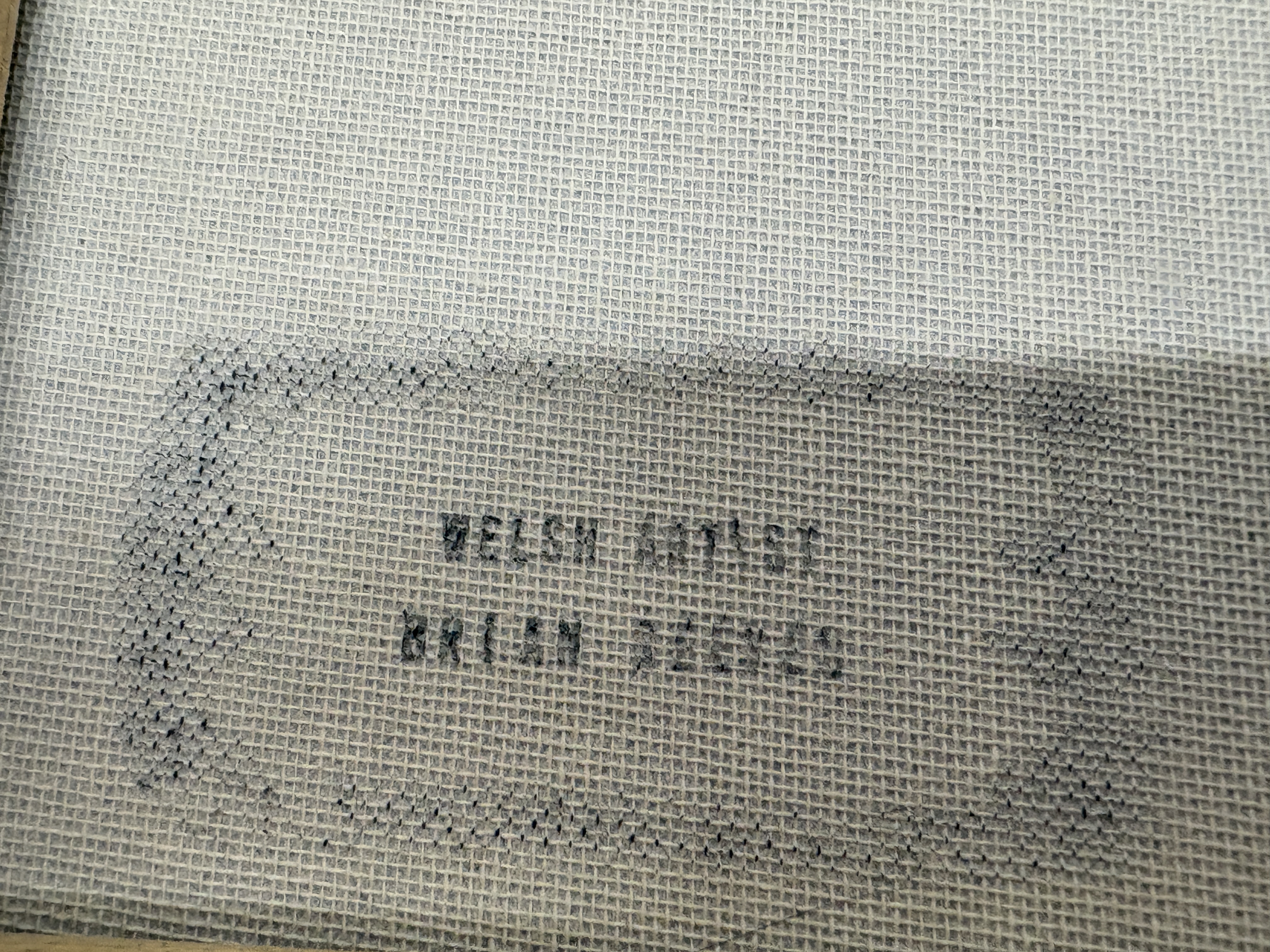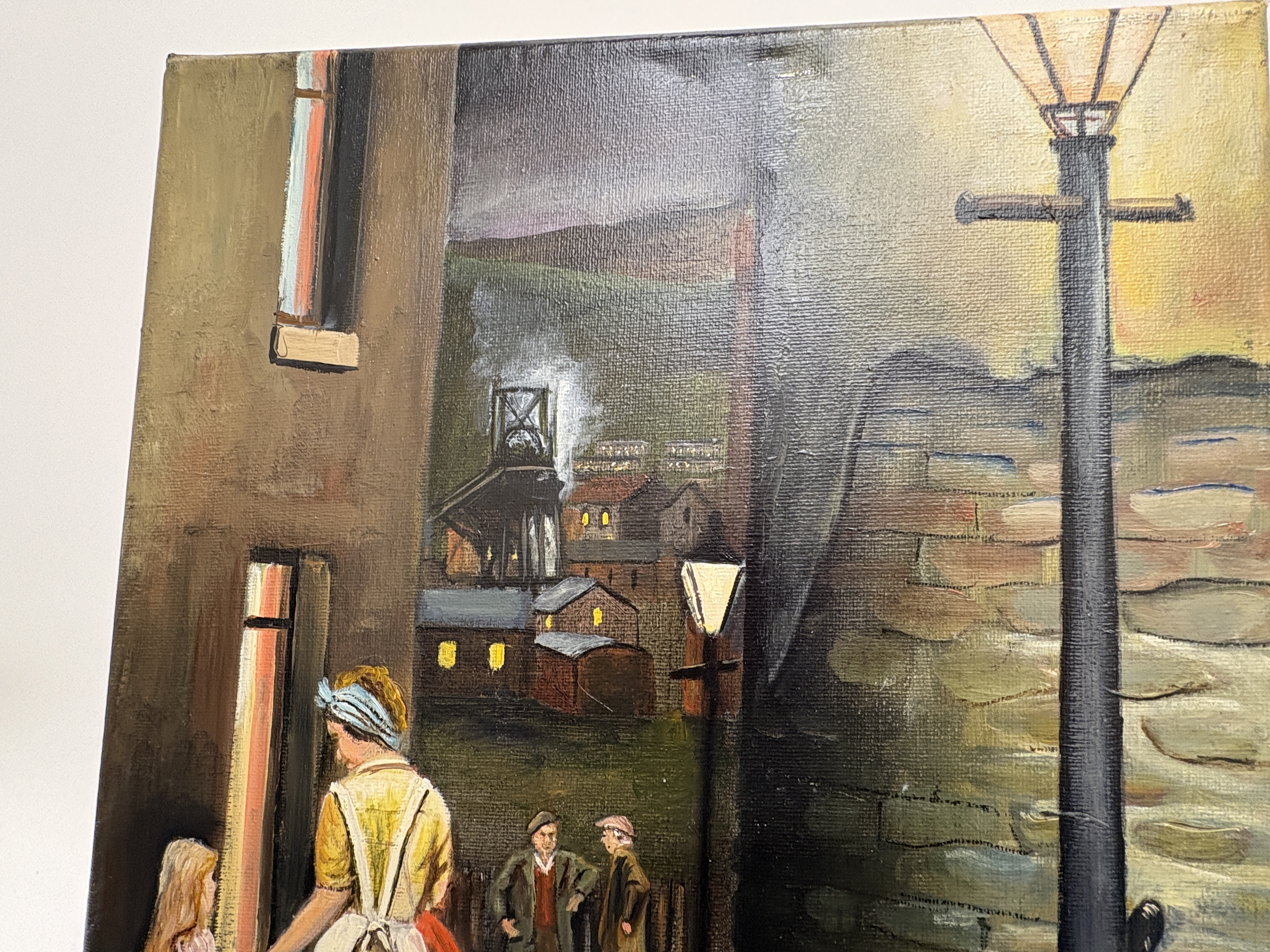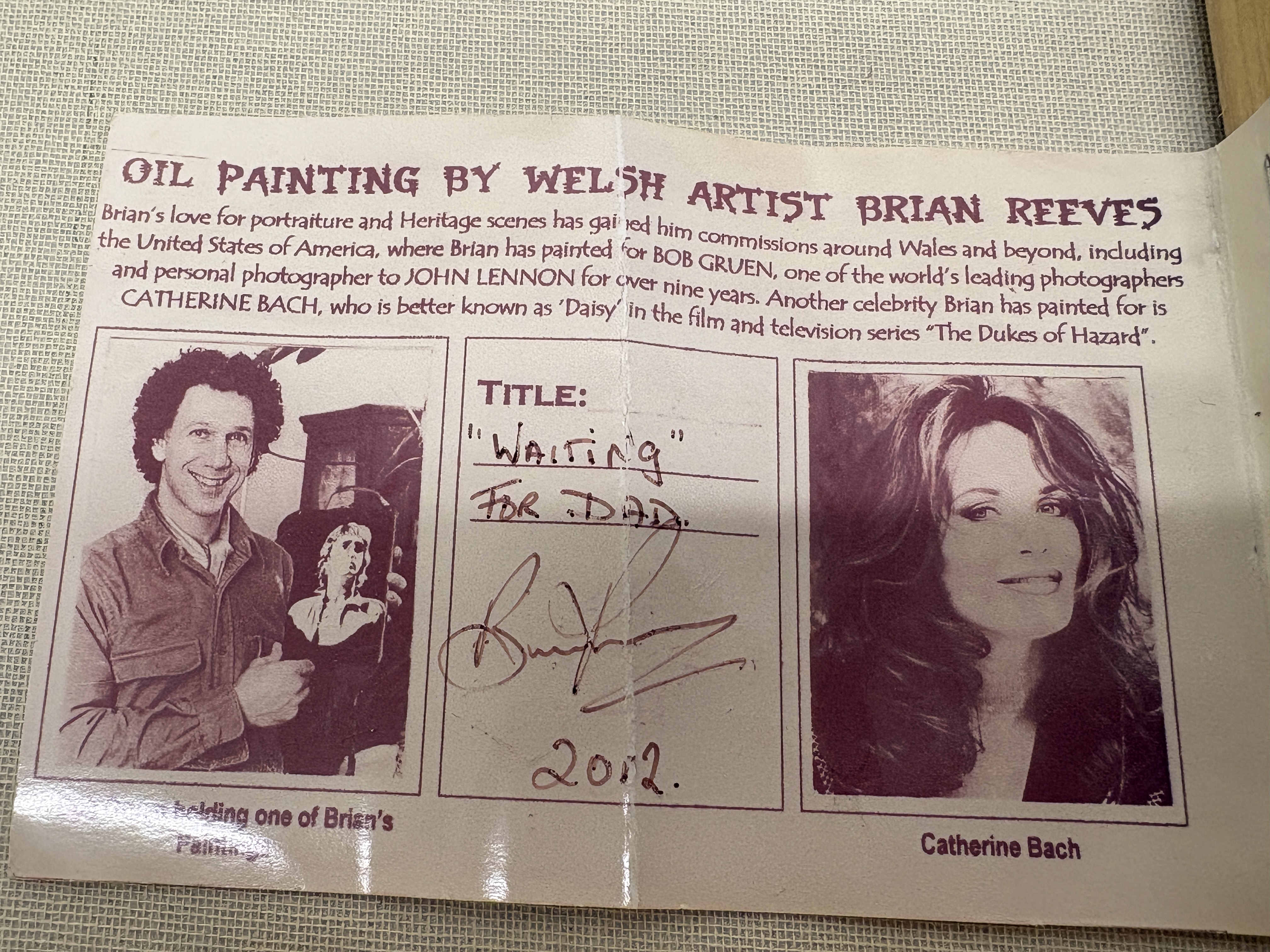 Brian Reeves (Welsh, contemporary). An oil on canvas. The composition is rendered in a social realist style, sharing visual affinities with the works of Bob Barker and Phil George, featuring expressive brushwork and significant impasto used to define the texture of the snow. The painting is signed BRIAN REEVES in black to the lower right corner. To the verso, the canvas is titled in pencil CAFE STILL OPEN, signed and dated 2012. Both the canvas reverse and the wooden stretcher bars bear multiple ink stamps reading WELSH ARTIST BRIAN REEVES. A printed biographical flyer for the artist is stapled to the reverse. The item is an unframed, gallery-wrapped canvas.