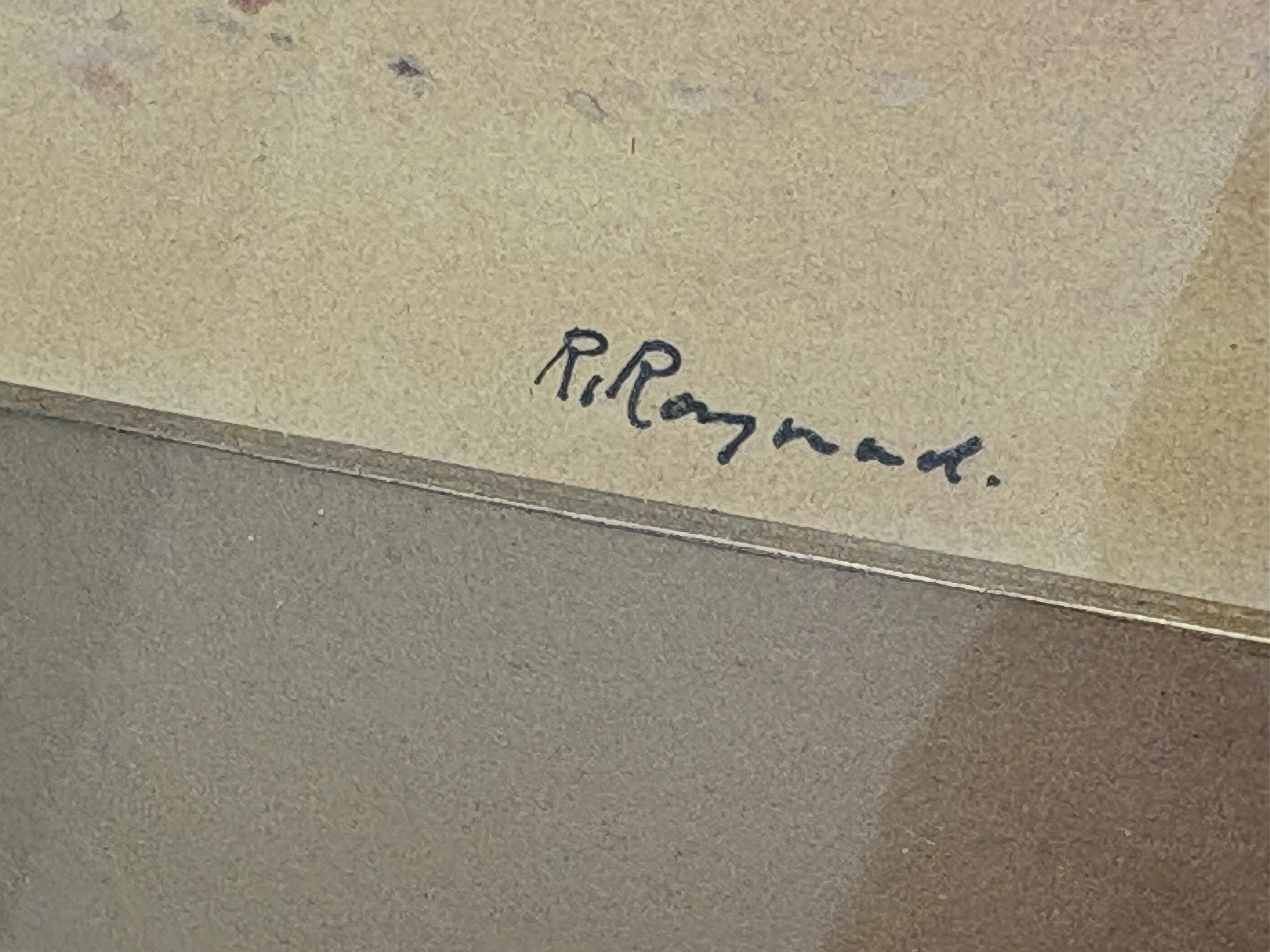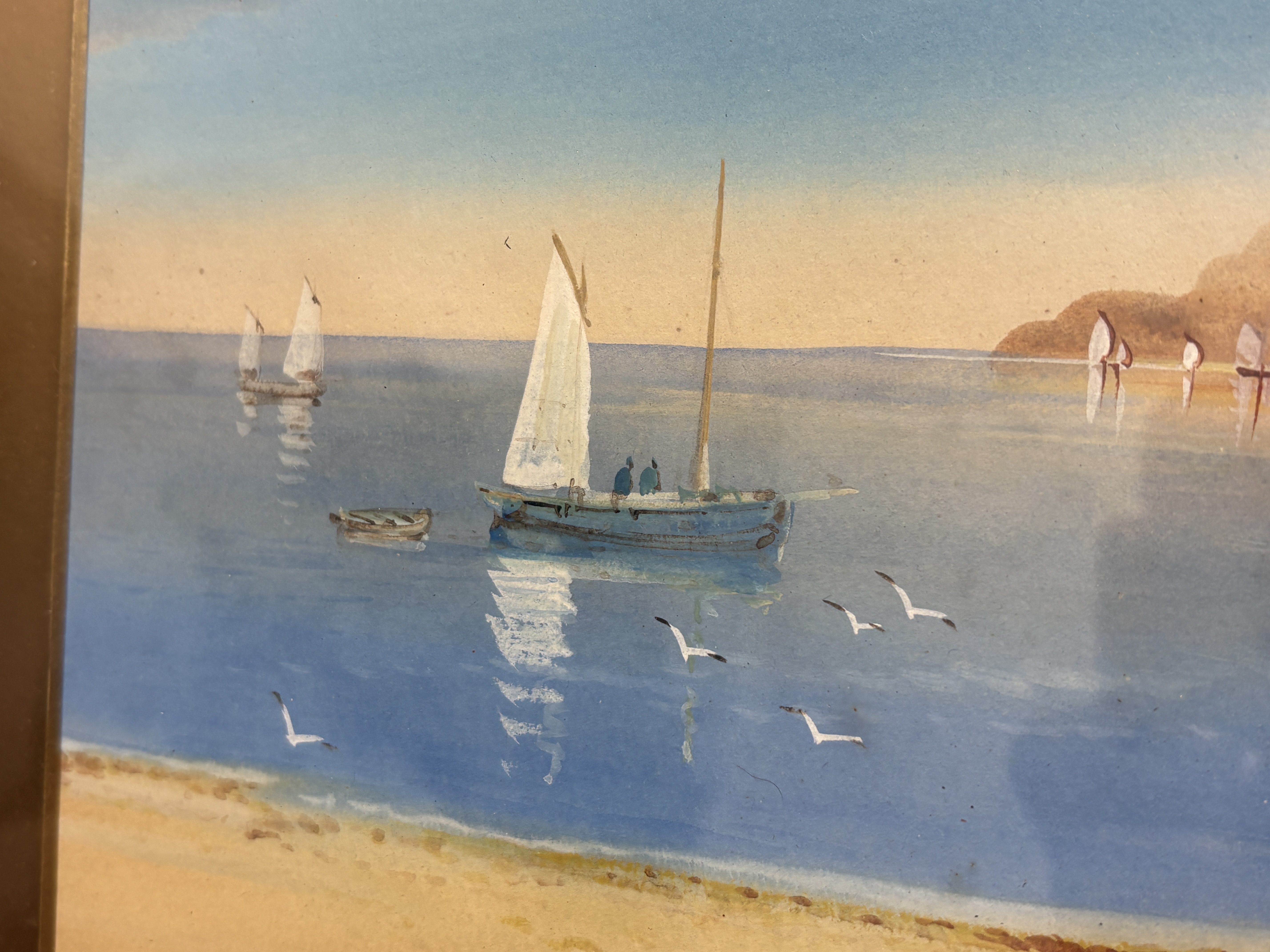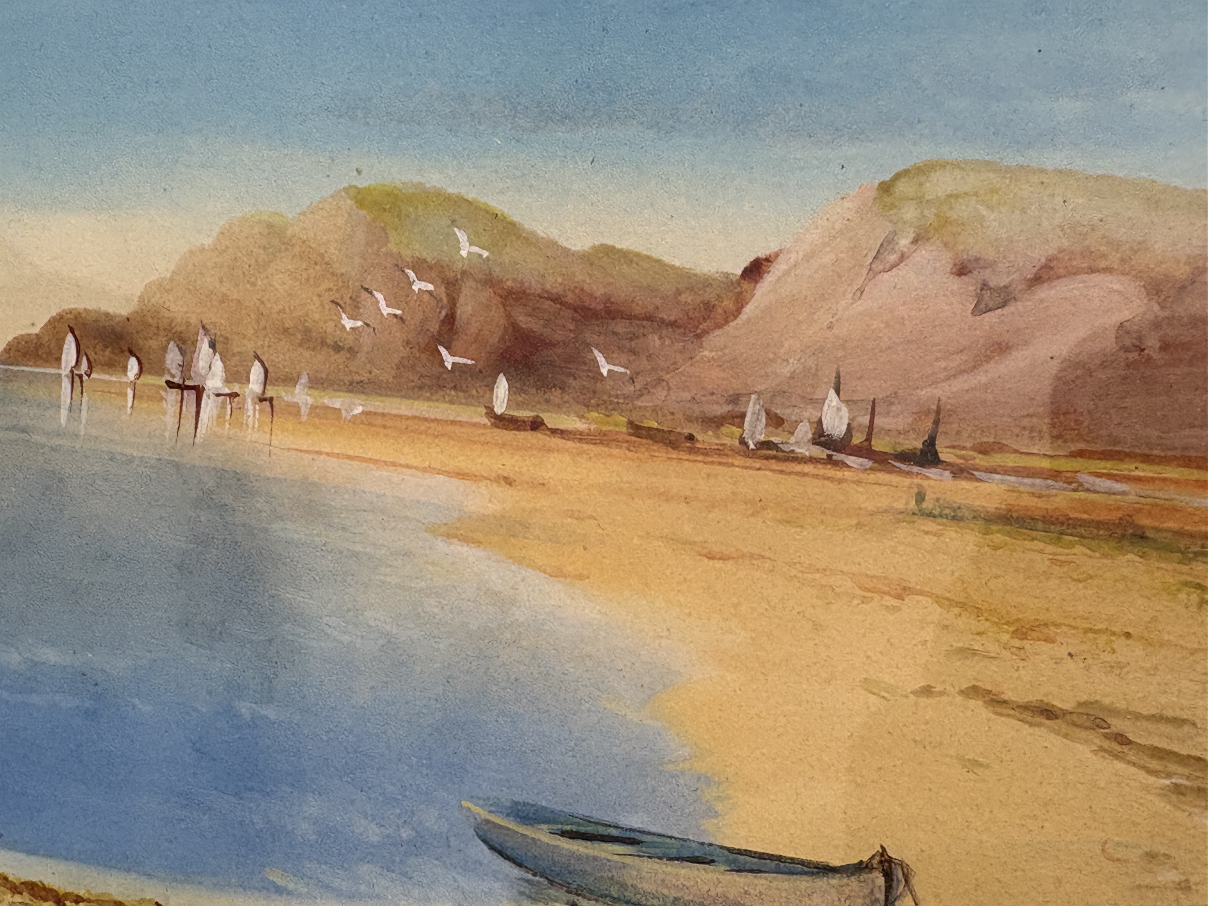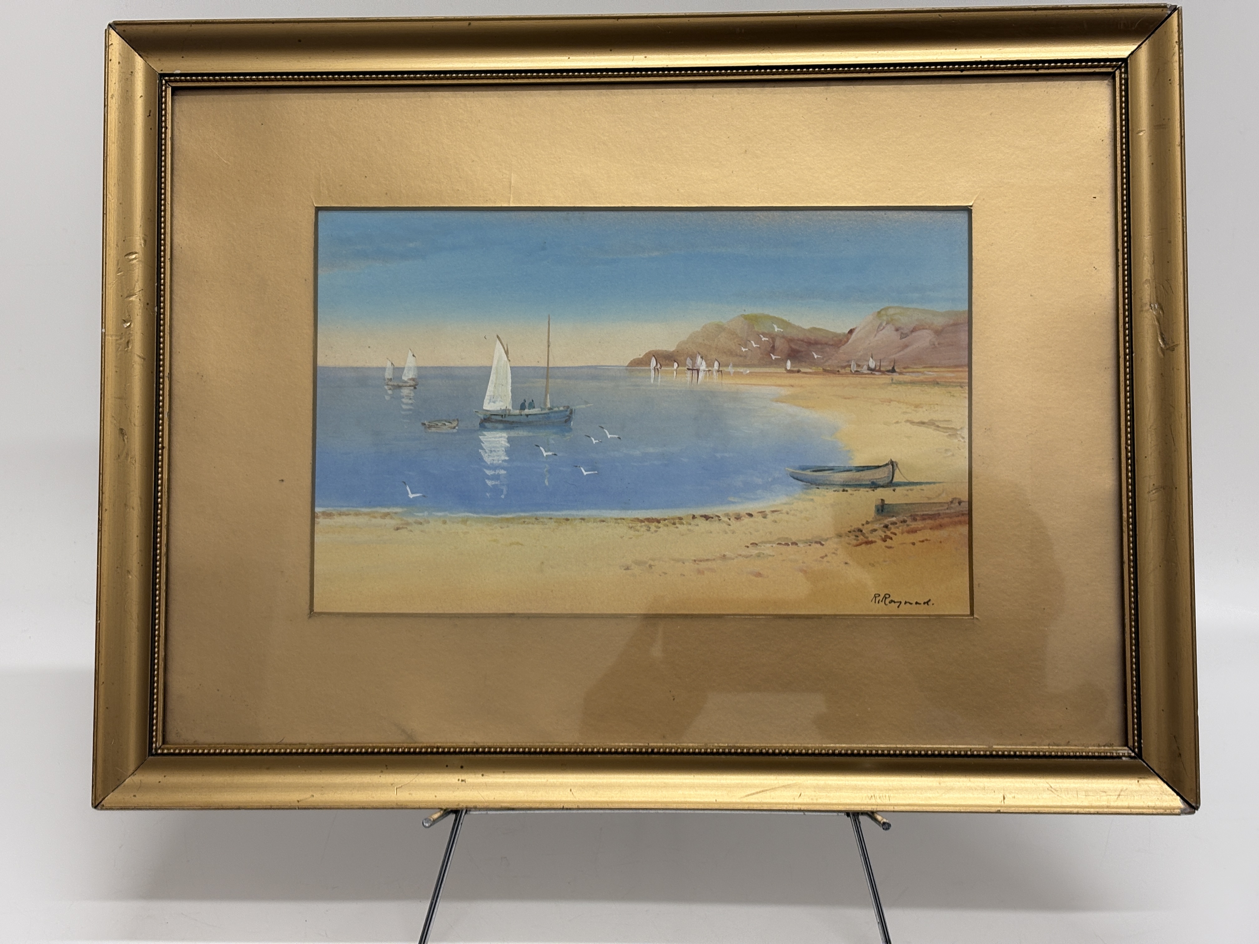 A coastal landscape executed in watercolour with gouache highlights on paper. The composition depicts several sailing vessels in calm waters near a sandy shoreline, populated by gulls and set against a backdrop of rolling hills under a soft sky. The work is rendered in a traditional early 20th-century style. It is signed R.Raymond. in the lower right corner. The piece is presented in a gold-coloured card mount within a gilt-effect wooden frame featuring a beaded inner border.