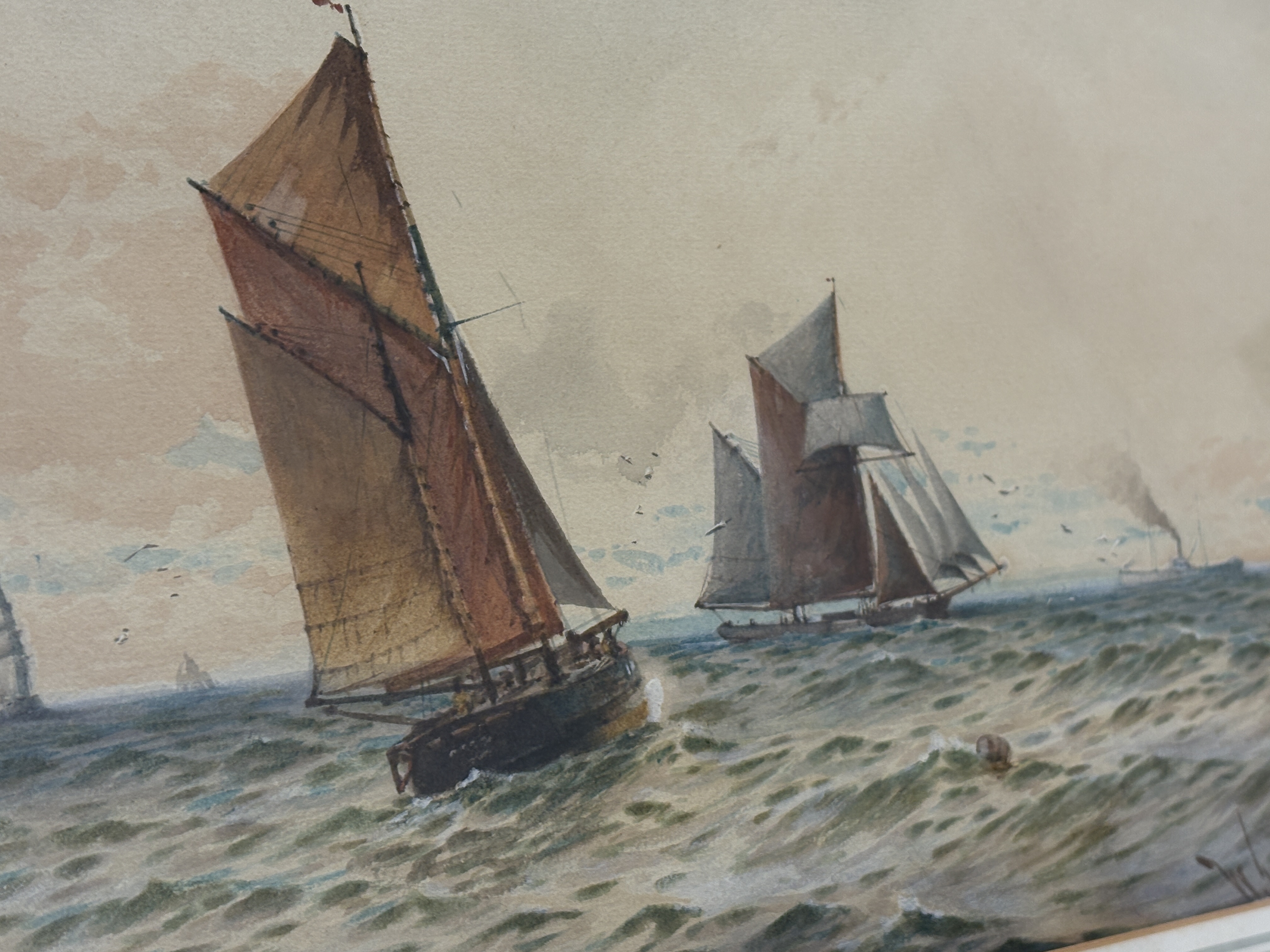 This maritime scene is executed in watercolour with gouache highlights on paper, depicting gaff-rigged sailing vessels and a distant steamer navigating a choppy sea under a hazy sky. The work is rendered in a realist style characteristic of early 20th-century British maritime art. The painting is signed in the lower right W.T.N. Boyce and dated 1909. It is presented in a gilt-wood frame with a multi-lined wash mount.
