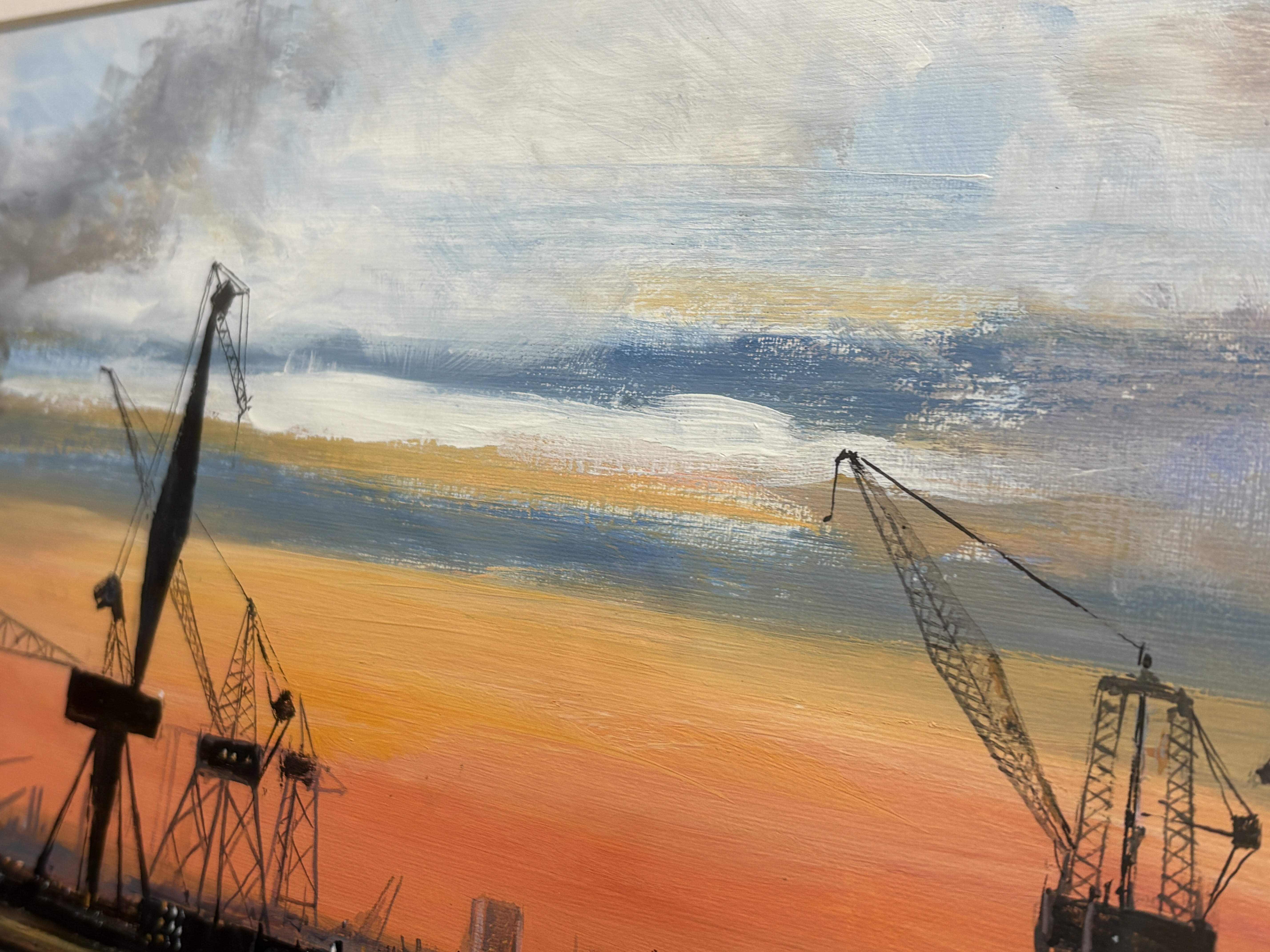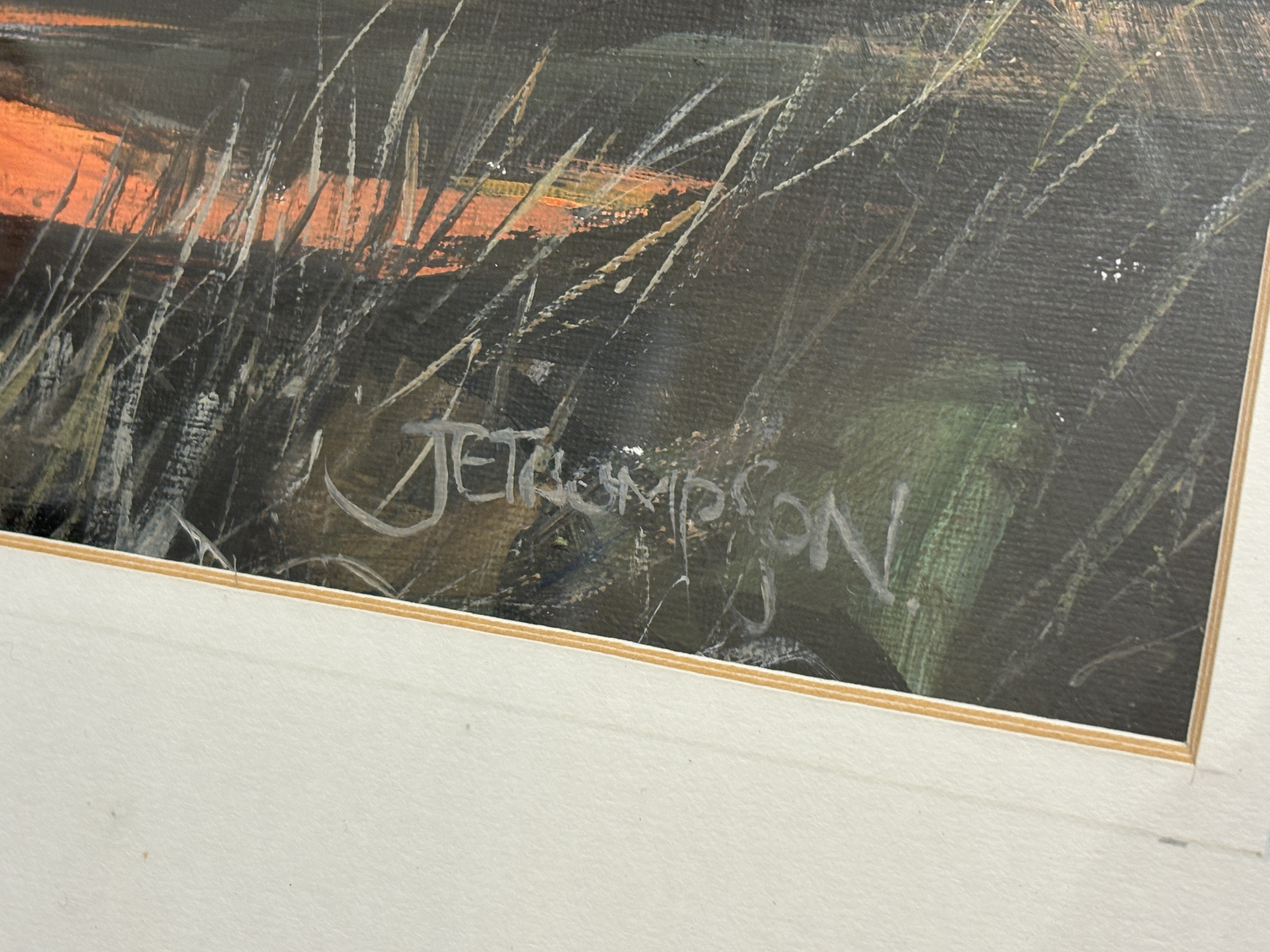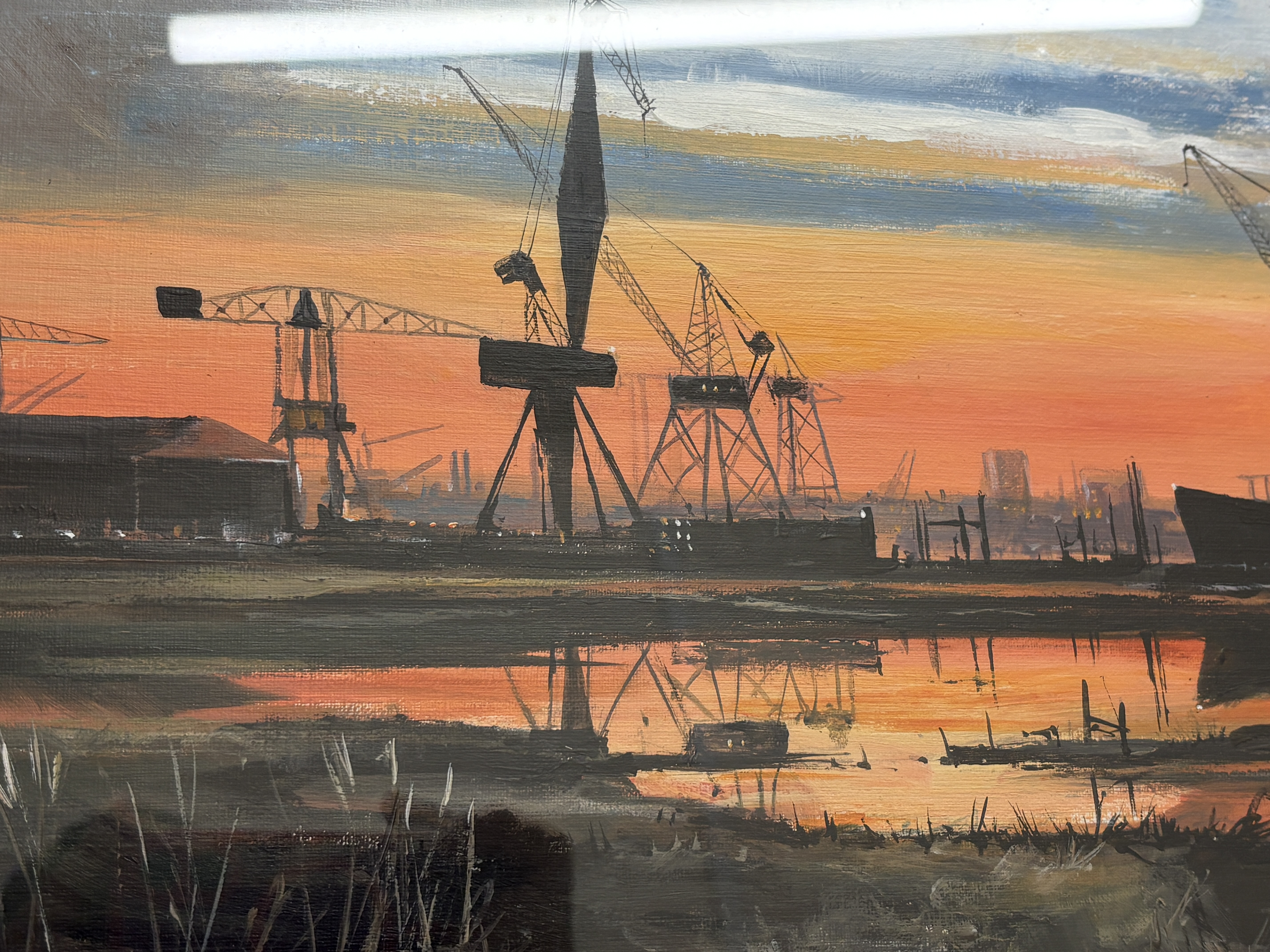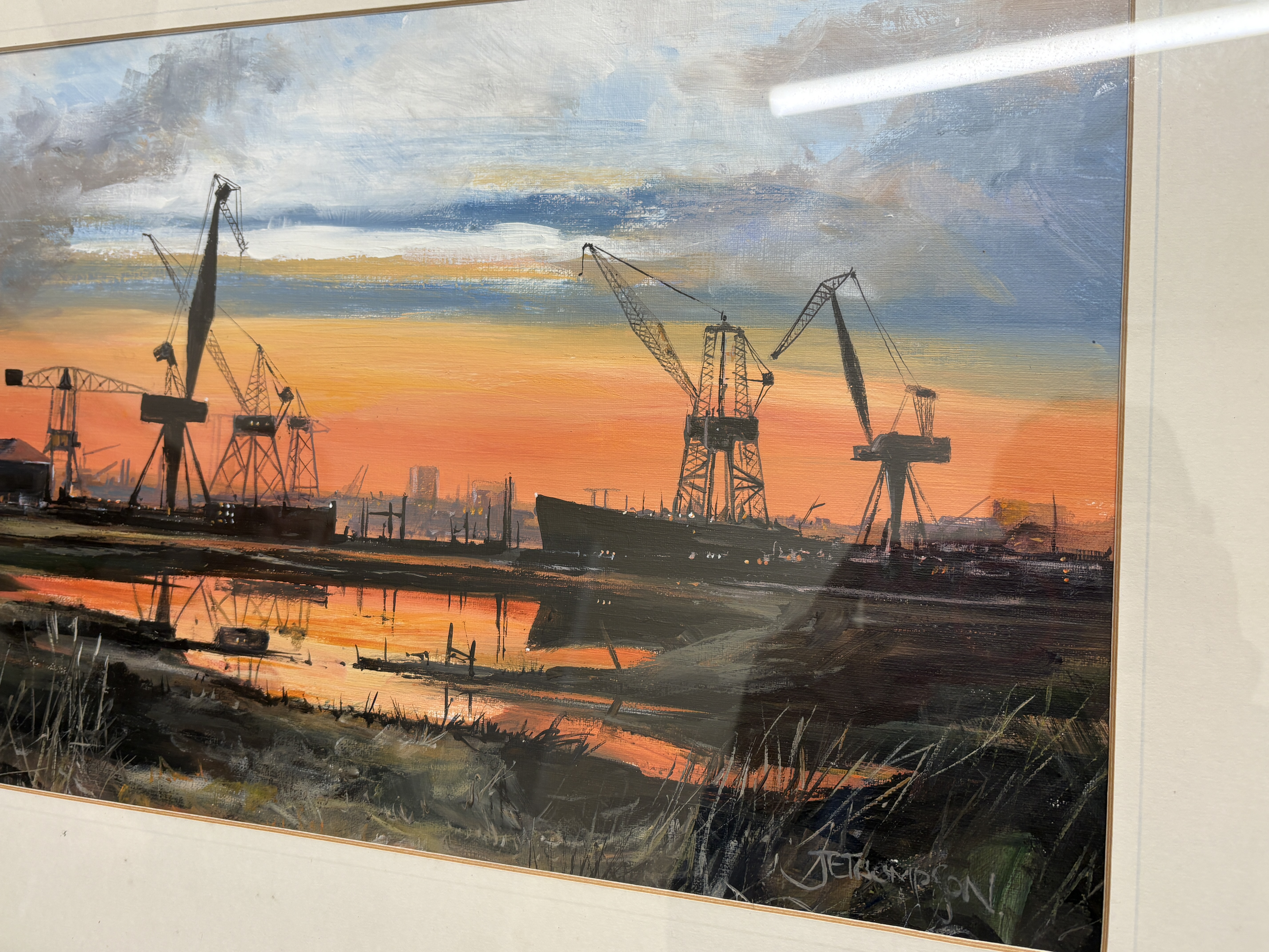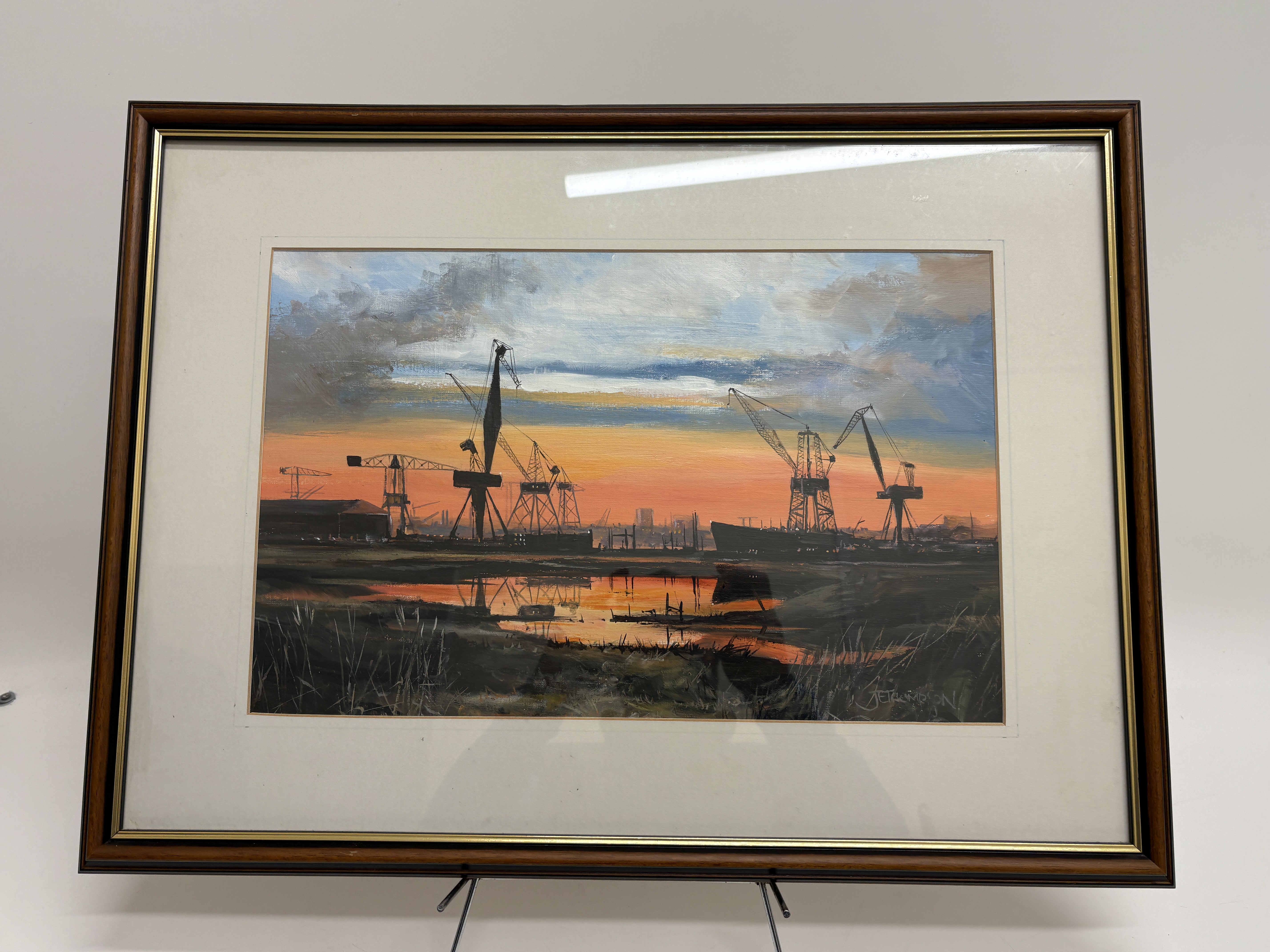 Now a retired Trawler man from Blyth J.E. Thompson has produced this depicting an atmospheric Wallsend dockland scene at sunset. The composition features silhouetted dockside cranes and buildings set against a vibrant sky of orange, yellow, and cooling blue tones. The foreground is composed of marshy reeds and a central body of water that reflects the intense colours of the sky and the dark industrial forms. The work is executed with expressive and textured brushwork, demonstrating a focus on light and silhouetted forms characteristic of late 20th-century British industrial realism. The painting is signed J E THOMPSON in the lower right corner. It is housed in a modern dark wood frame with a gilt-effect inner slip and a cream mount, presented behind glass.