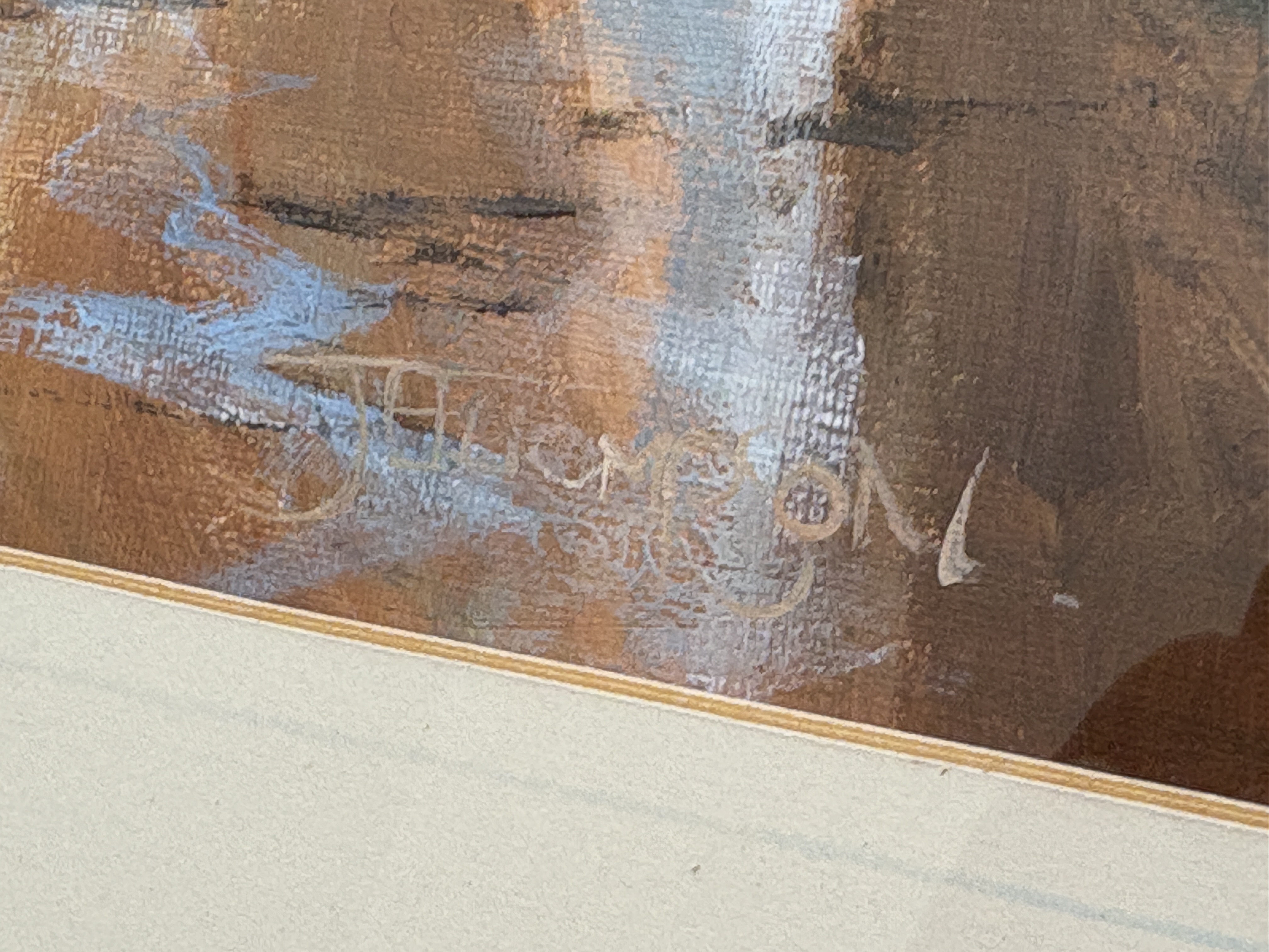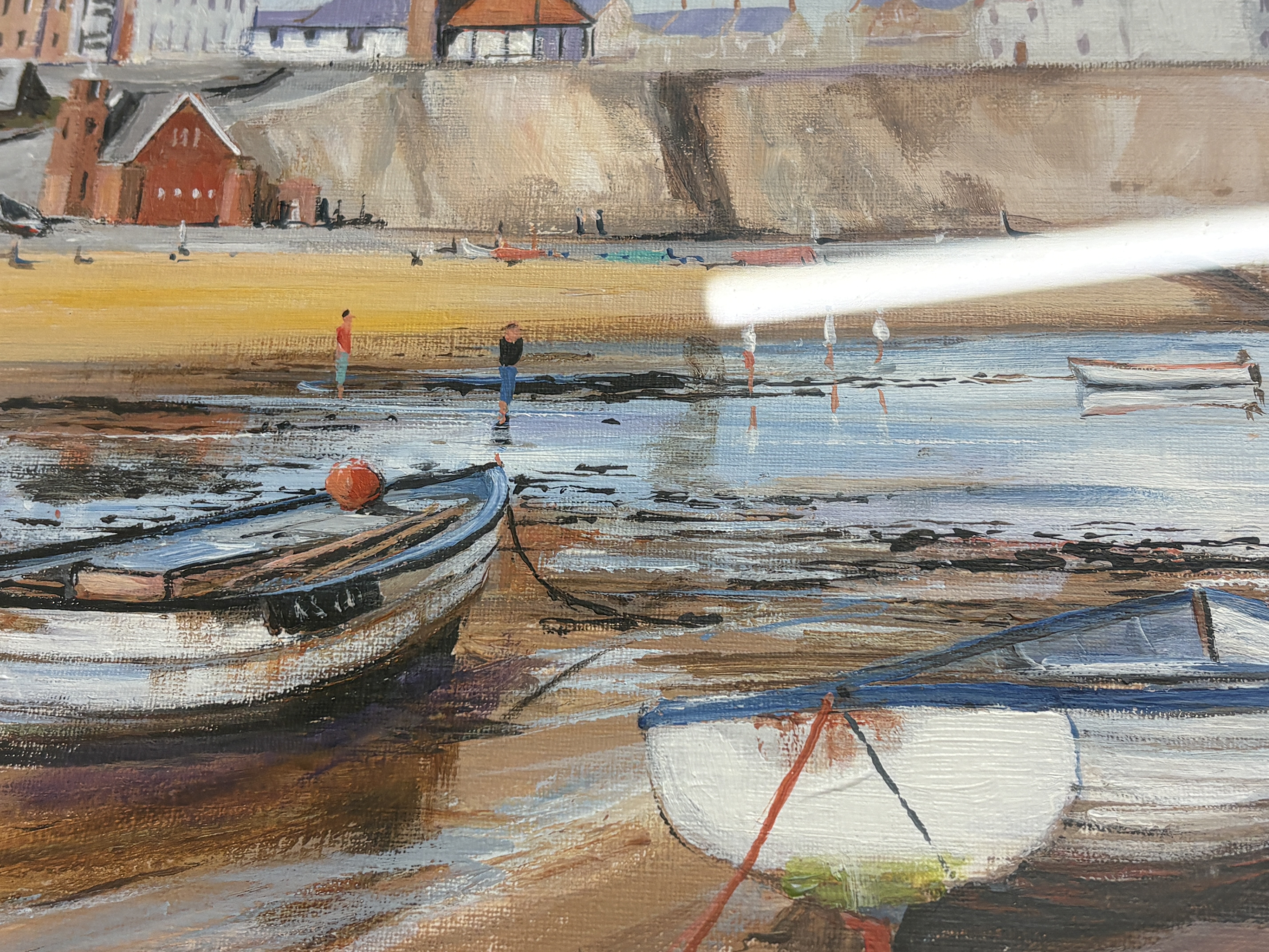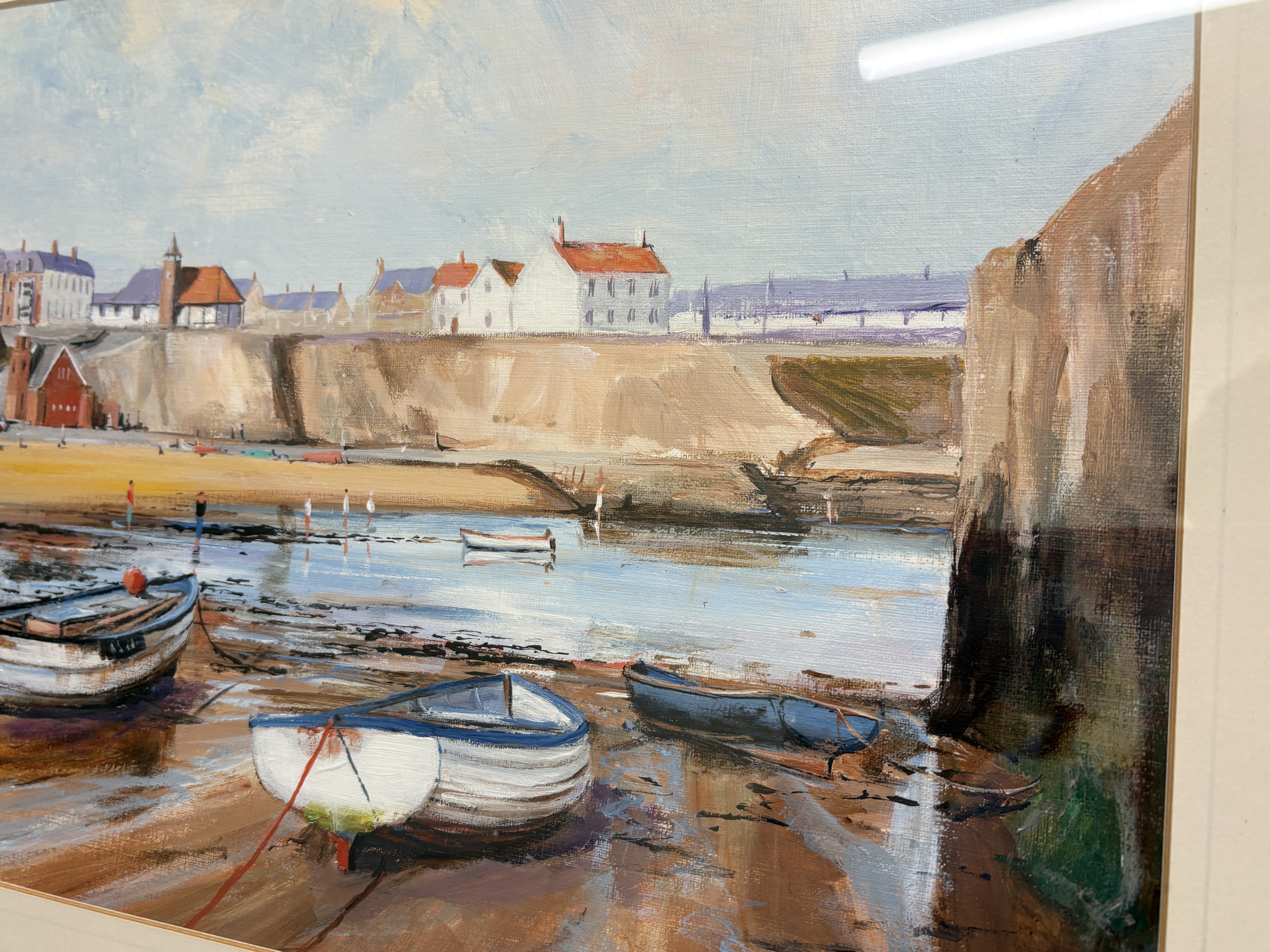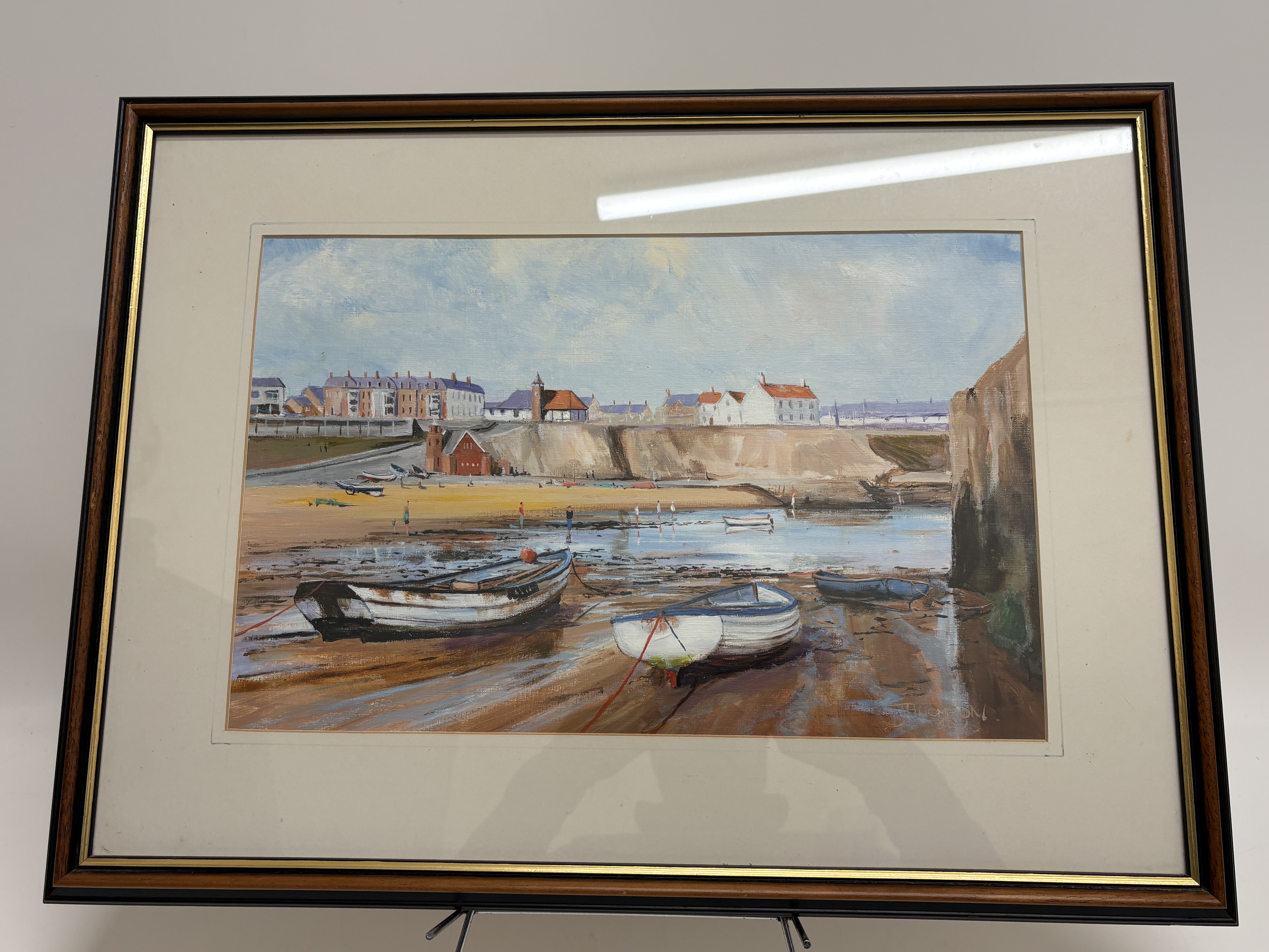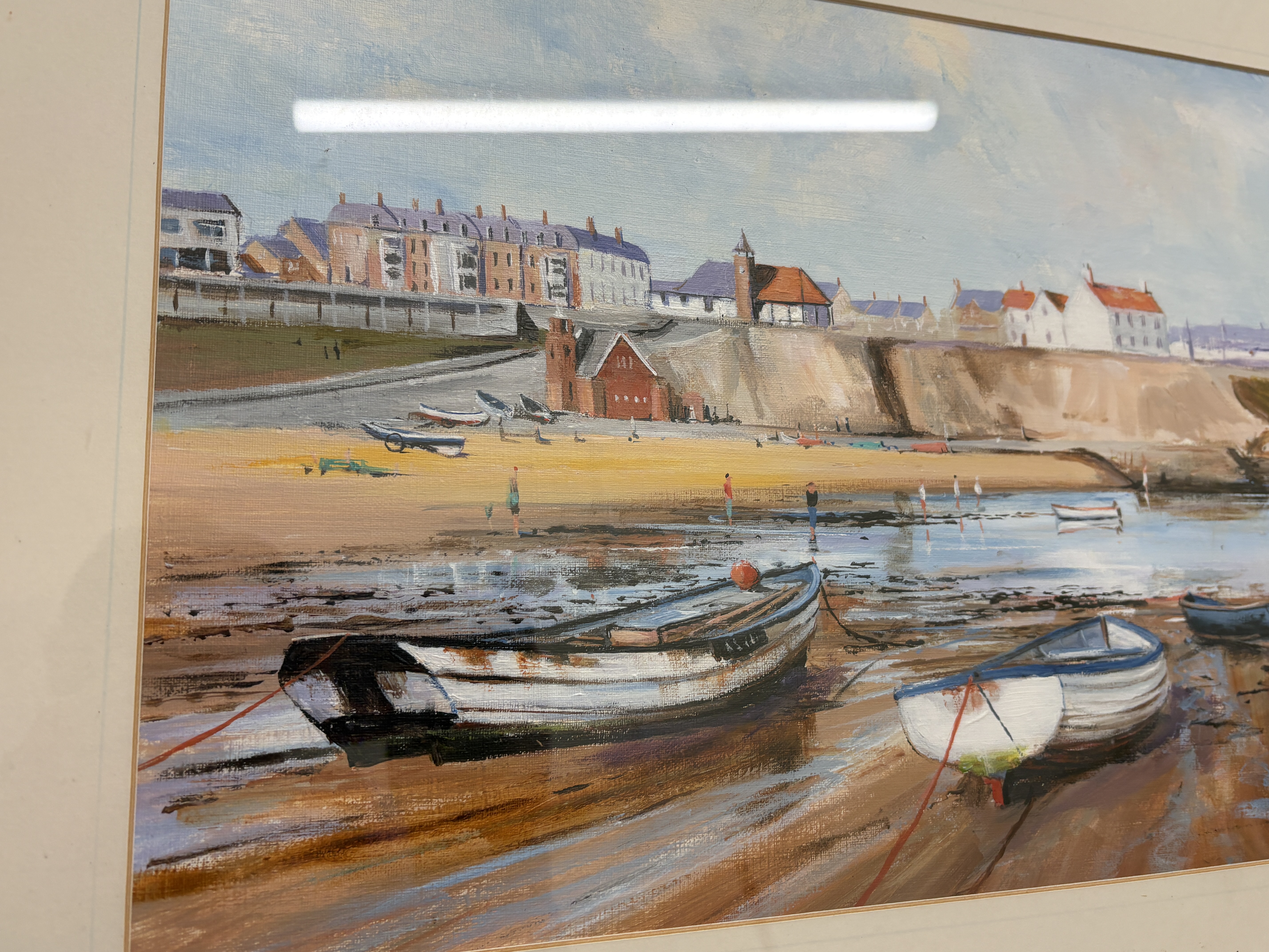 Now a retired Trawler man from Blyth J.E. Thompson has produced cullercoates bay costal scene, signed in the lower right corner. The scene depicts the beach at Cullercoats at low tide, with traditional fishing cobles resting on the sand in the foreground. Small figures are visible walking along the shoreline. The background features the distinctive architectural skyline of Cullercoats, including the Watch House and a row of townhouses situated atop the seawall and cliffs. The painting is presented in a cream-coloured mount and a dark wood frame with a gilt inner slip.