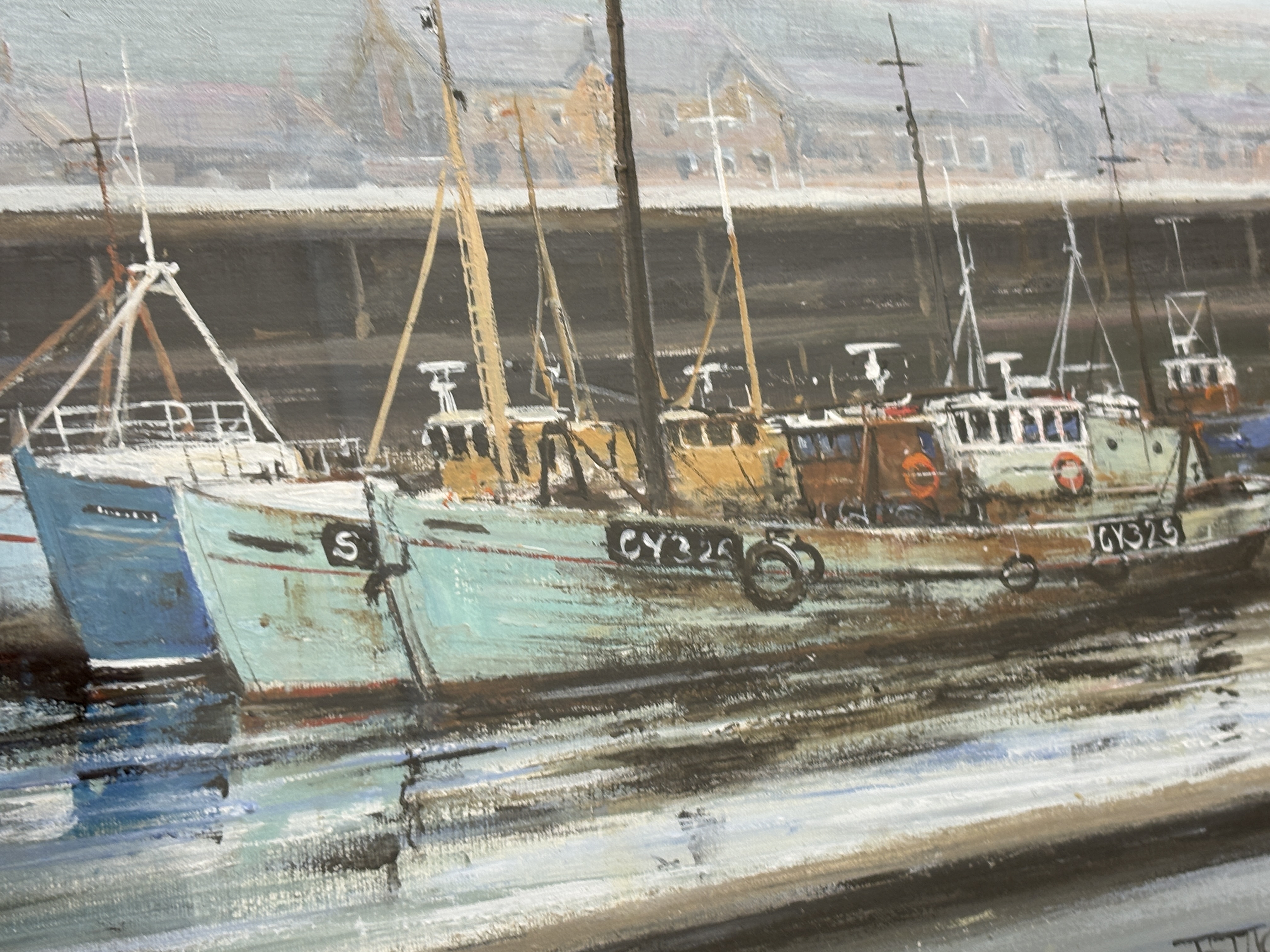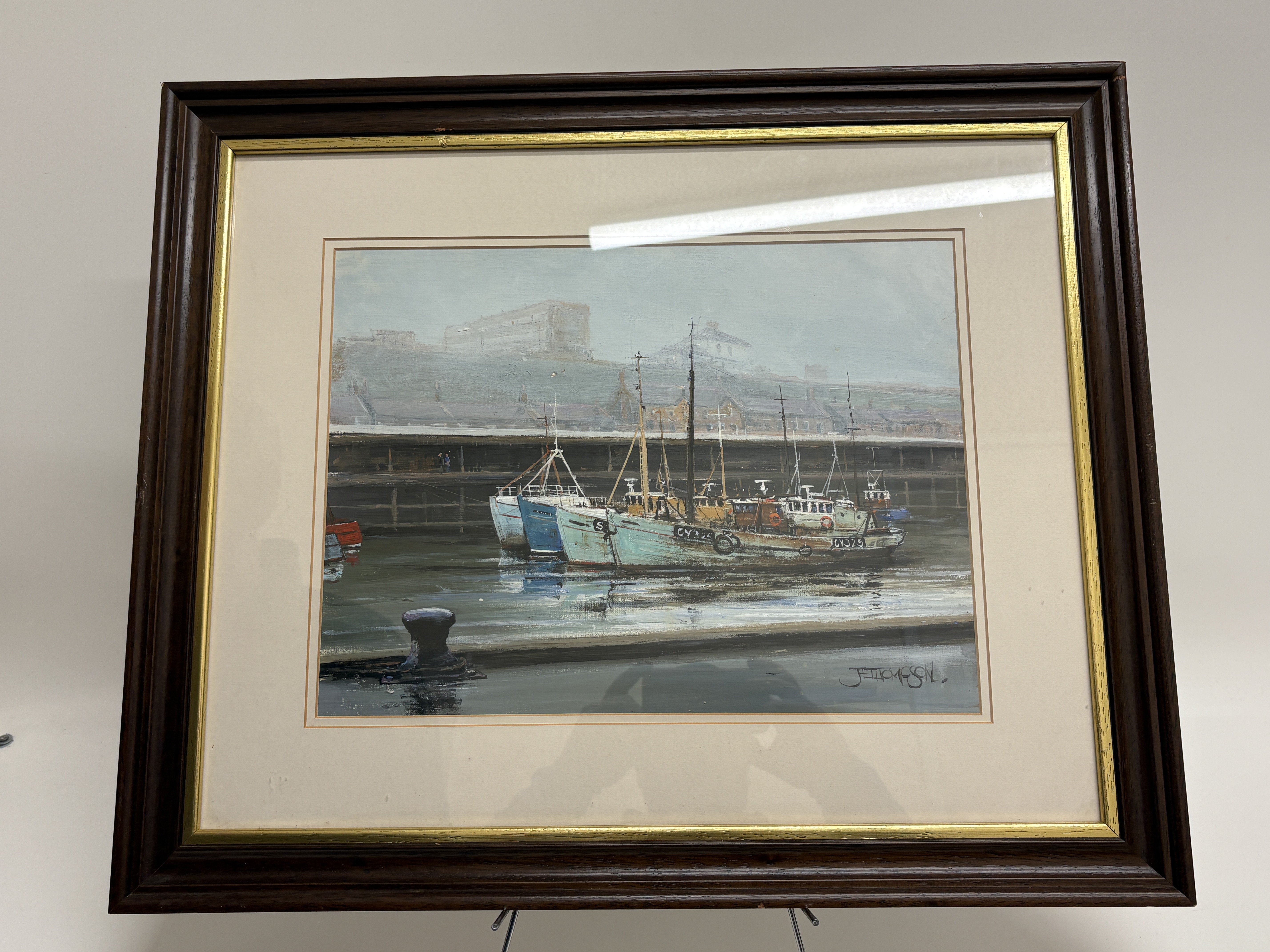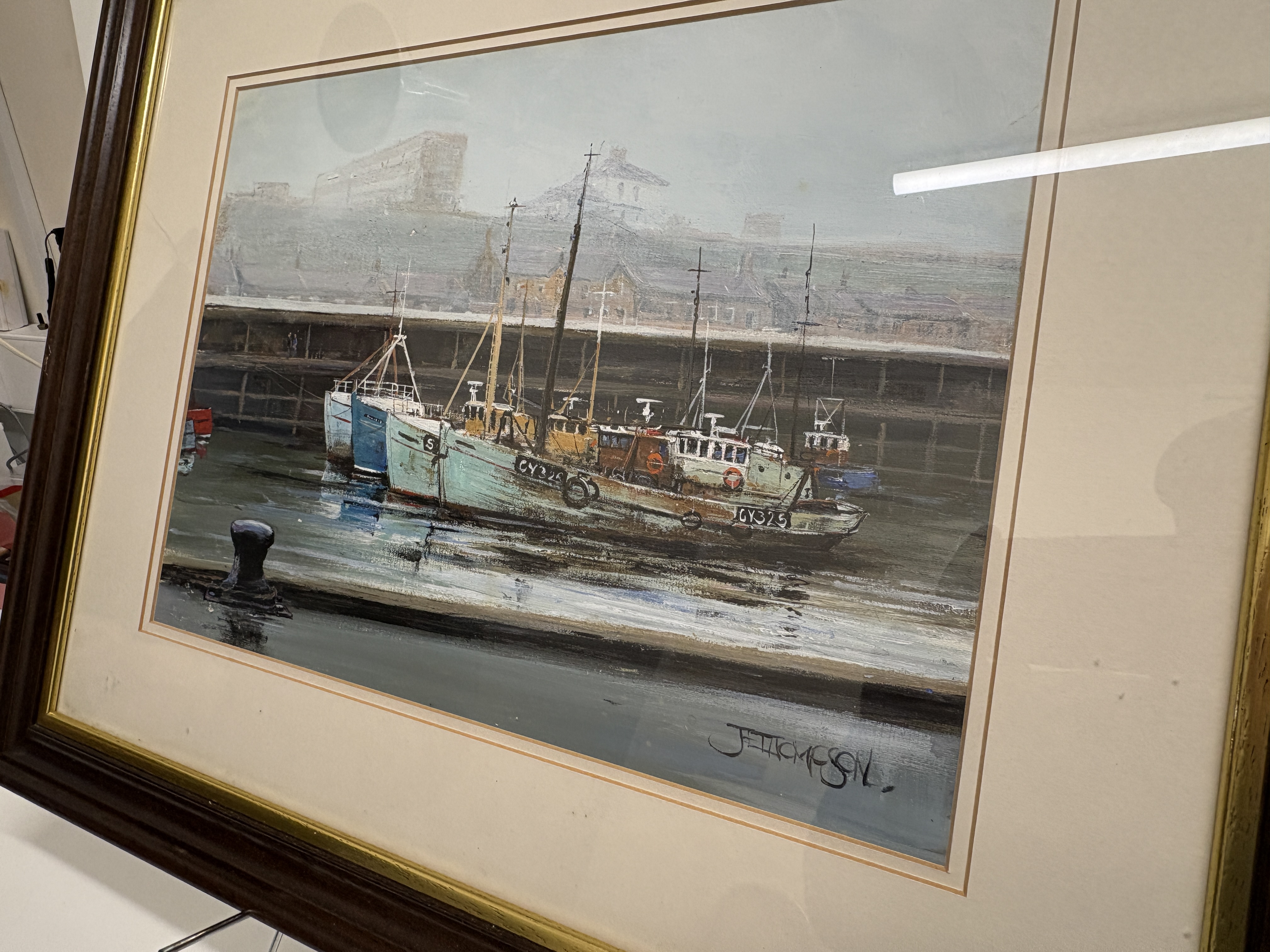 Now a retired Trawler man from Blyth J.E. Thompson has produced this depicting a harbour scene. The composition features several fishing trawlers, including vessels with the registrations GY326 and GY325, moored alongside a dock. The work is executed in an impressionistic maritime style. The artist captures atmospheric light, using thick white highlights to define the vessels and their reflections. The background depicts the industrial architecture of the dockside under a muted sky. The painting is signed in a stylized hand J.T. THOMPSON. in the lower right corner. It is housed in a dark wood frame with a gilt inner slip and a cream-coloured mount.