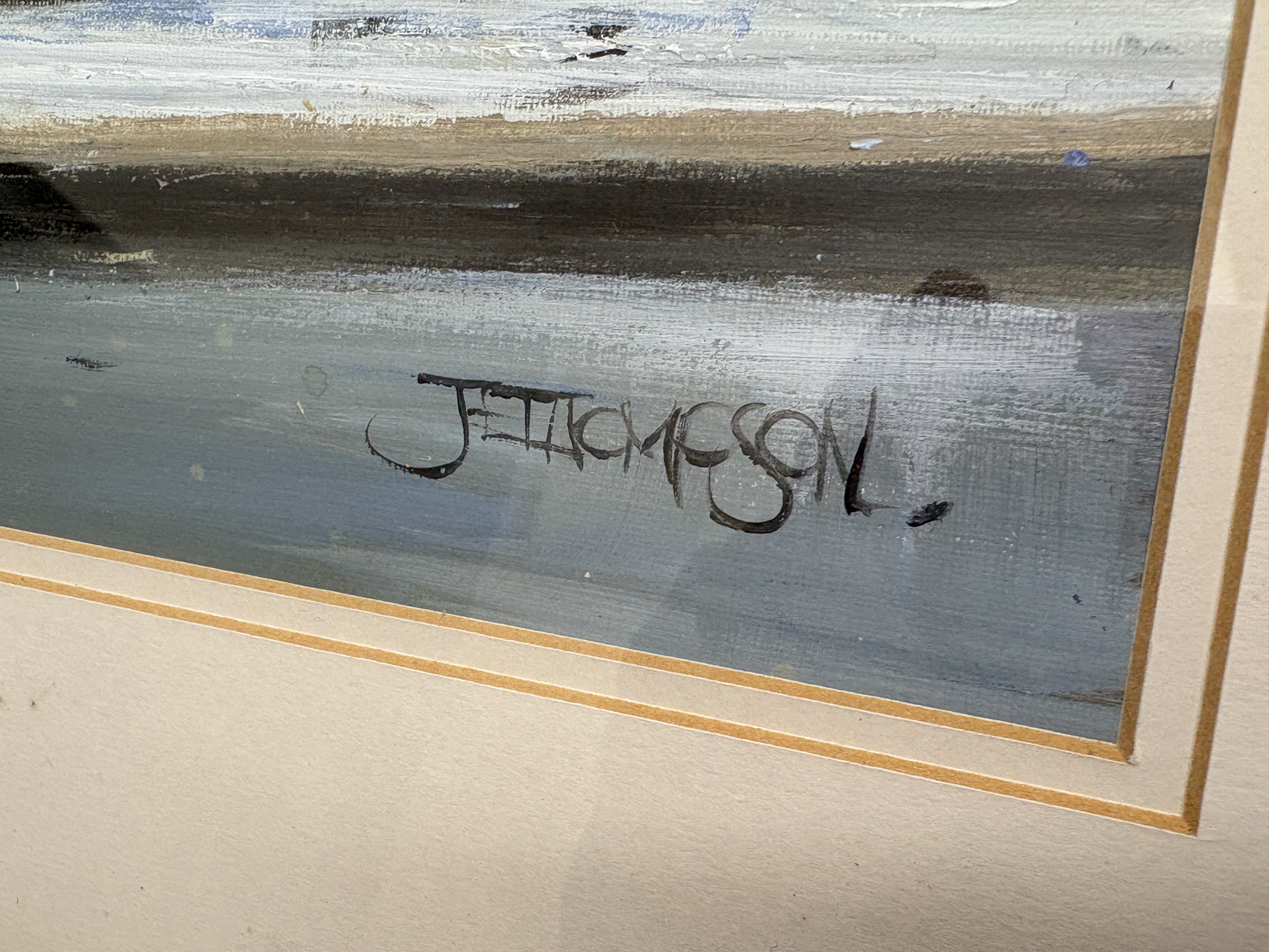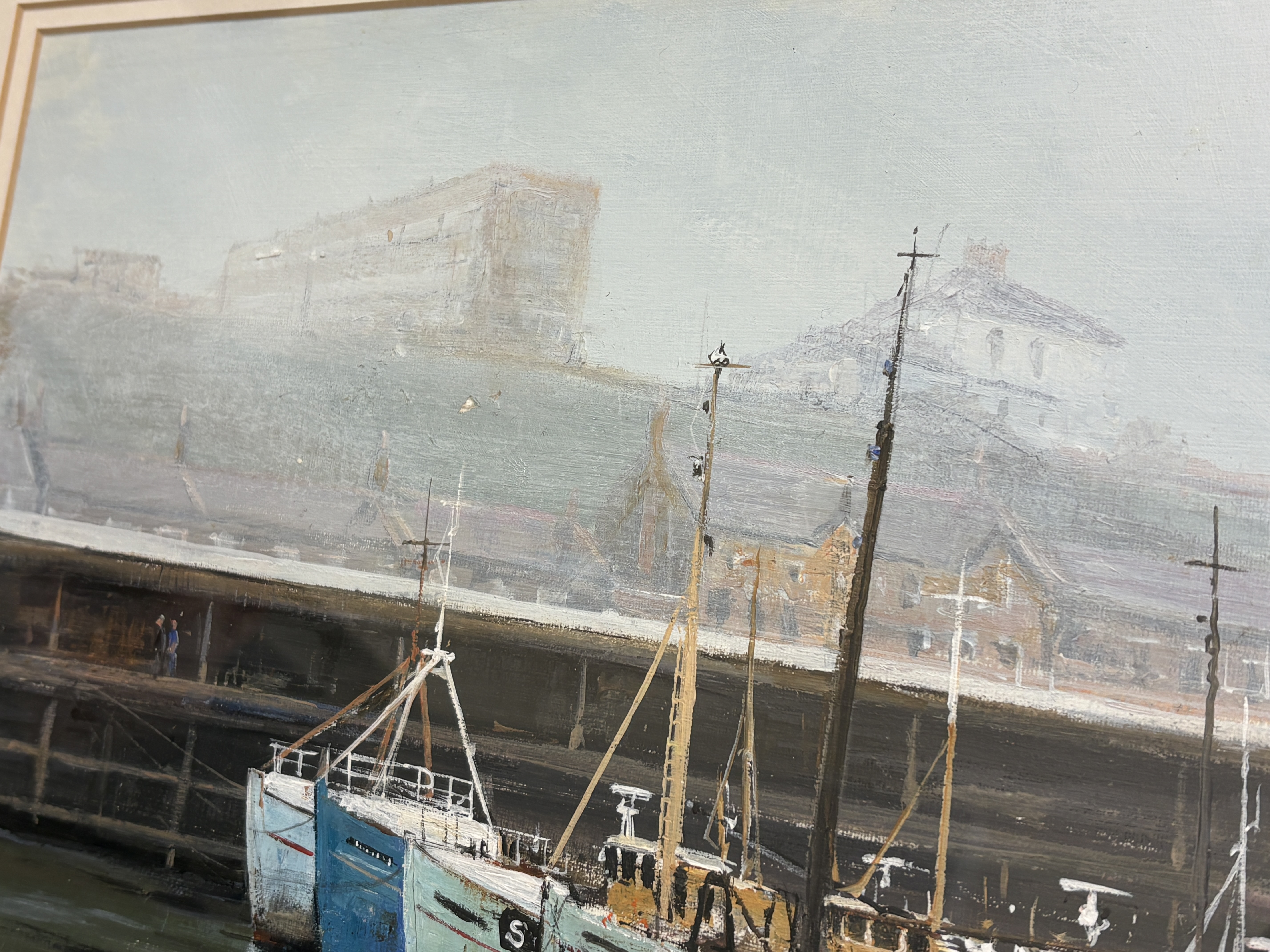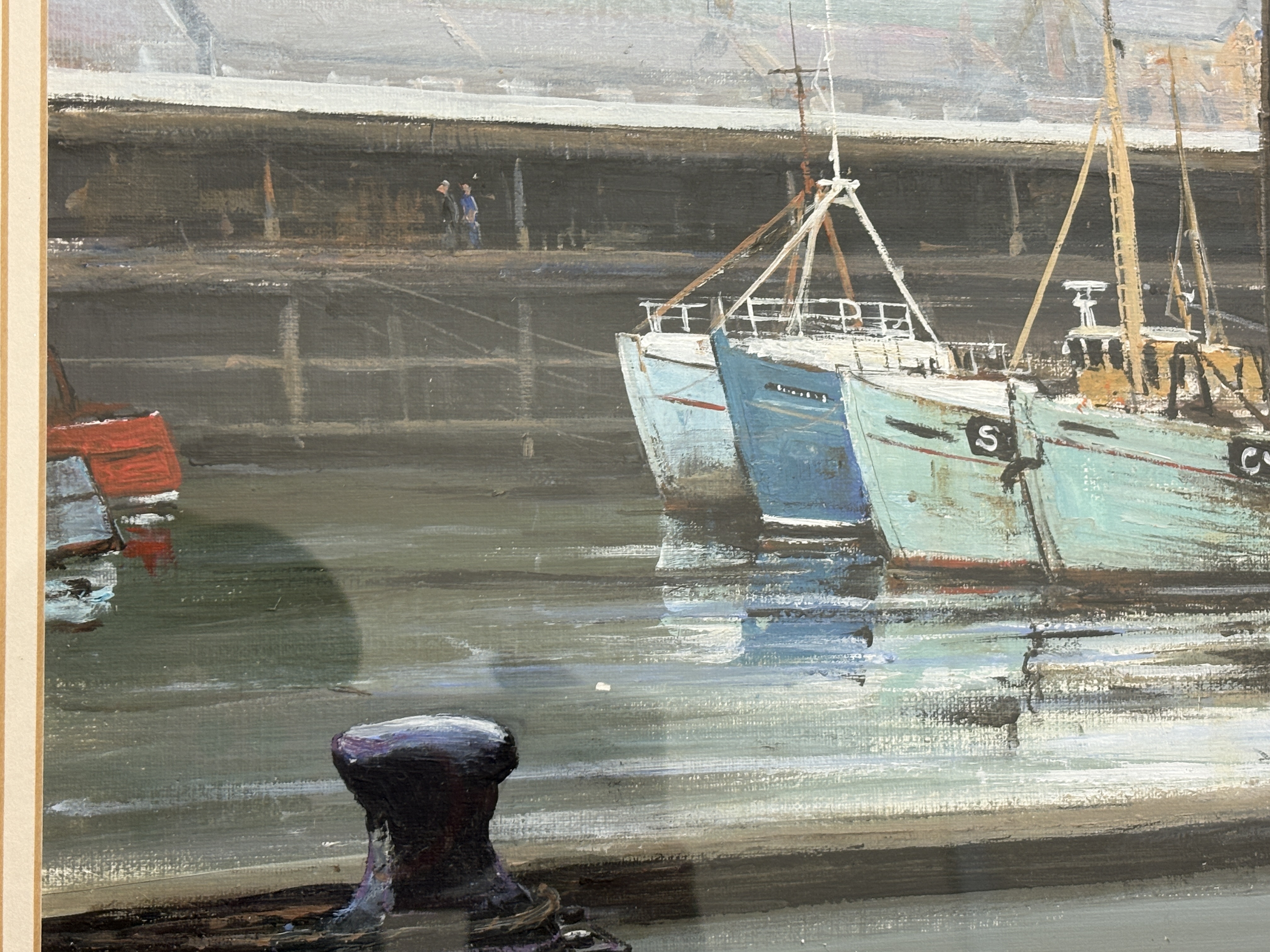 Now a retired Trawler man from Blyth J.E. Thompson has produced this depicting a harbour scene. The composition features several fishing trawlers, including vessels with the registrations GY326 and GY325, moored alongside a dock. The work is executed in an impressionistic maritime style. The artist captures atmospheric light, using thick white highlights to define the vessels and their reflections. The background depicts the industrial architecture of the dockside under a muted sky. The painting is signed in a stylized hand J.T. THOMPSON. in the lower right corner. It is housed in a dark wood frame with a gilt inner slip and a cream-coloured mount.