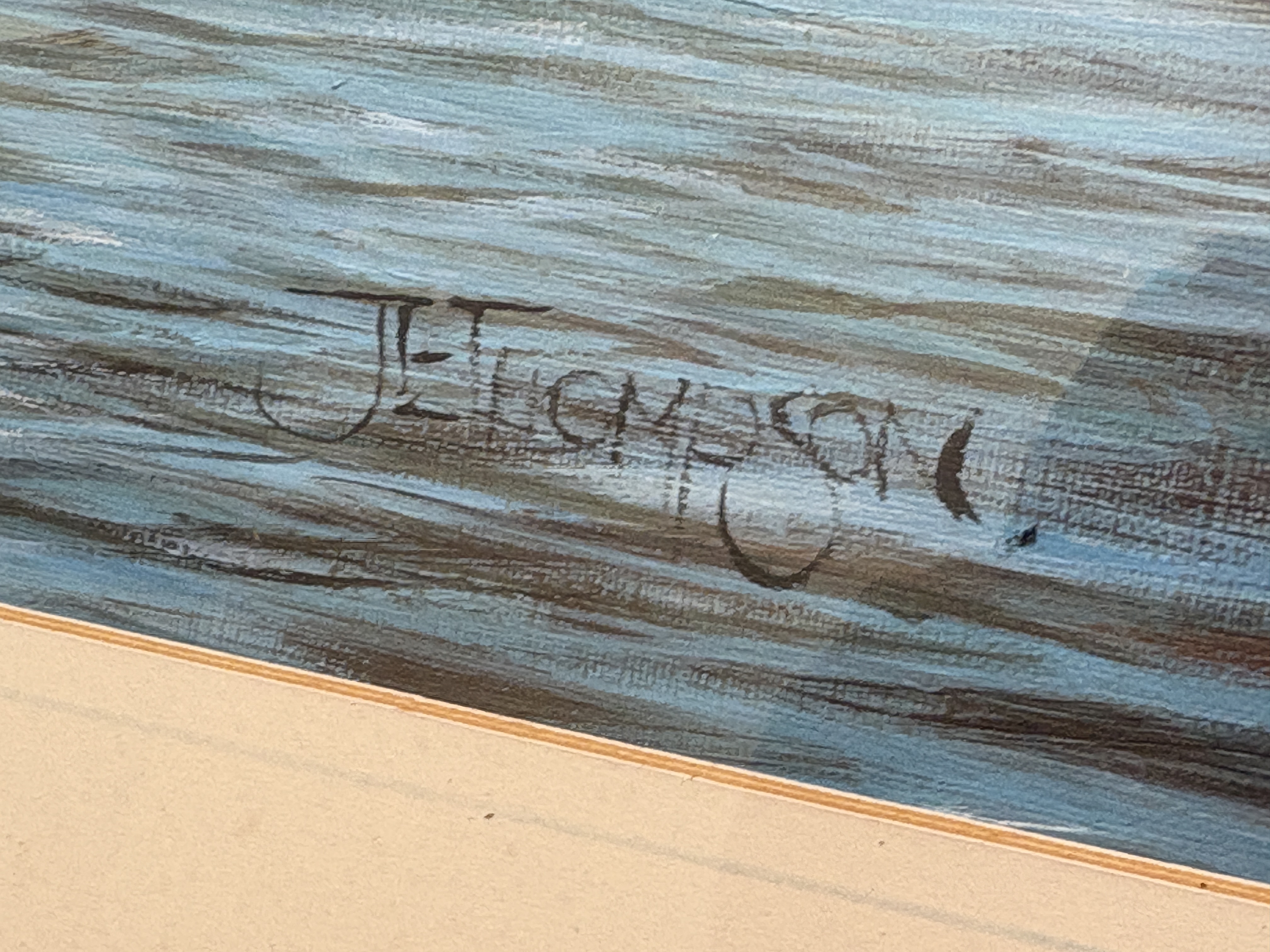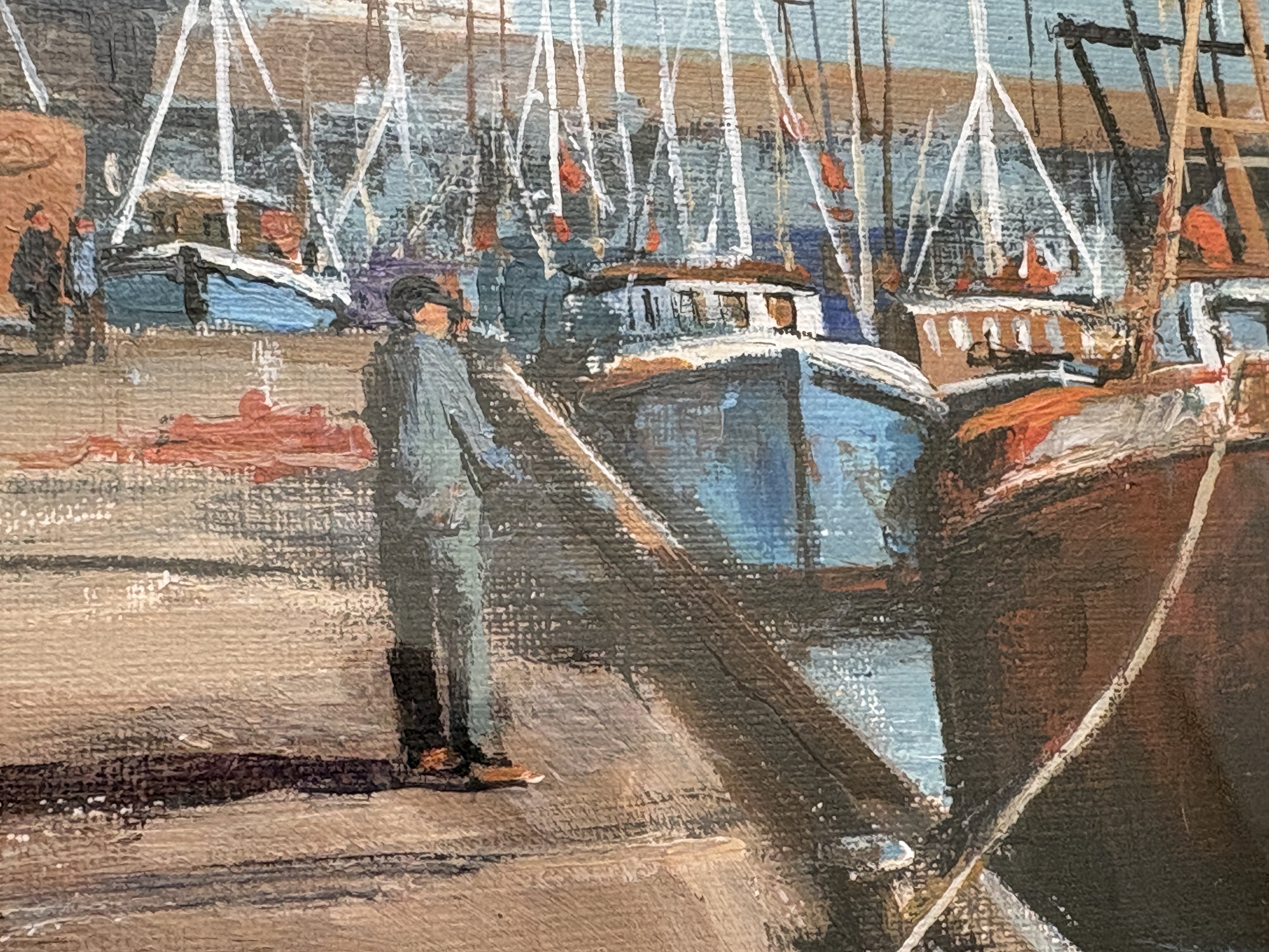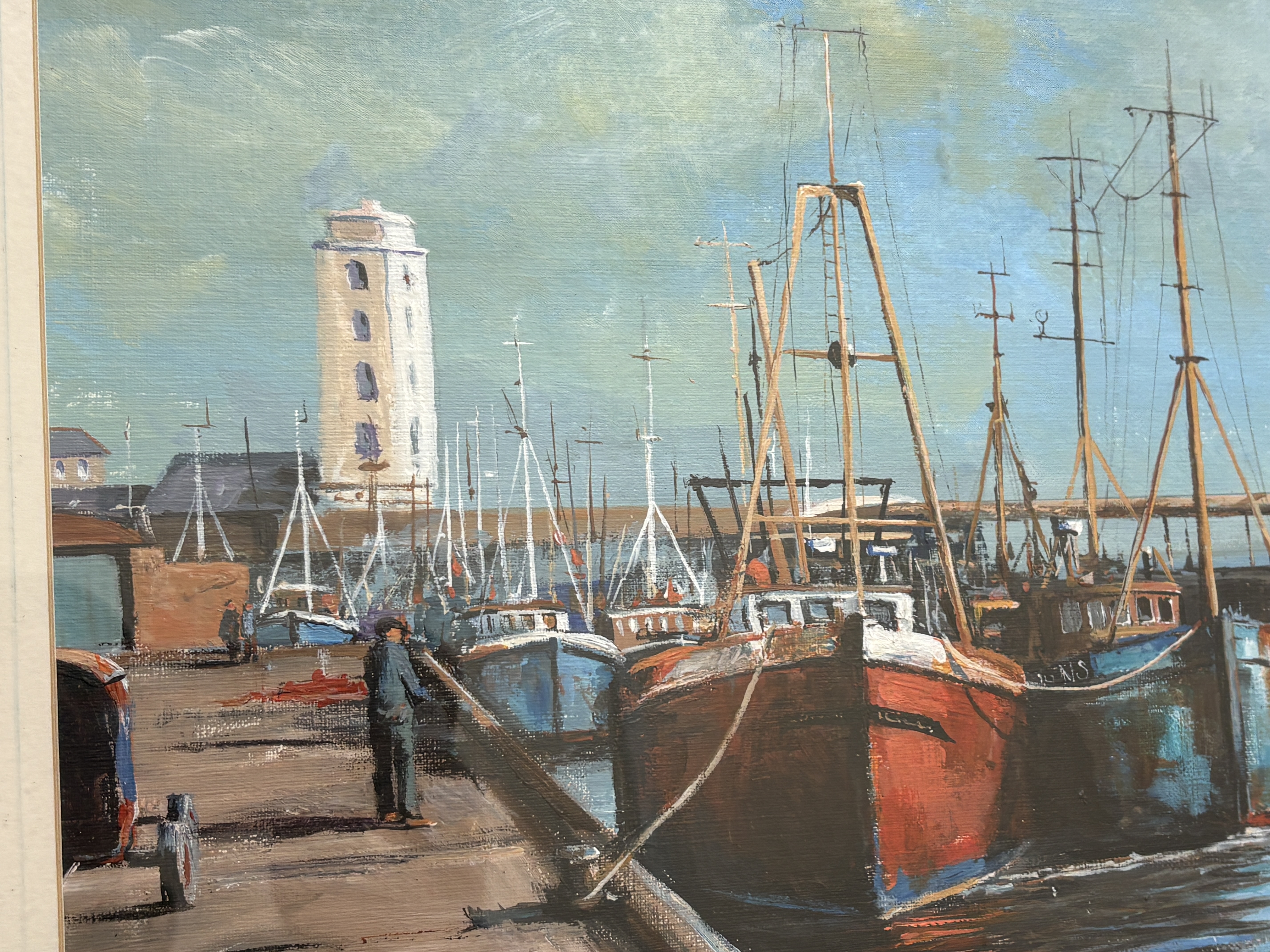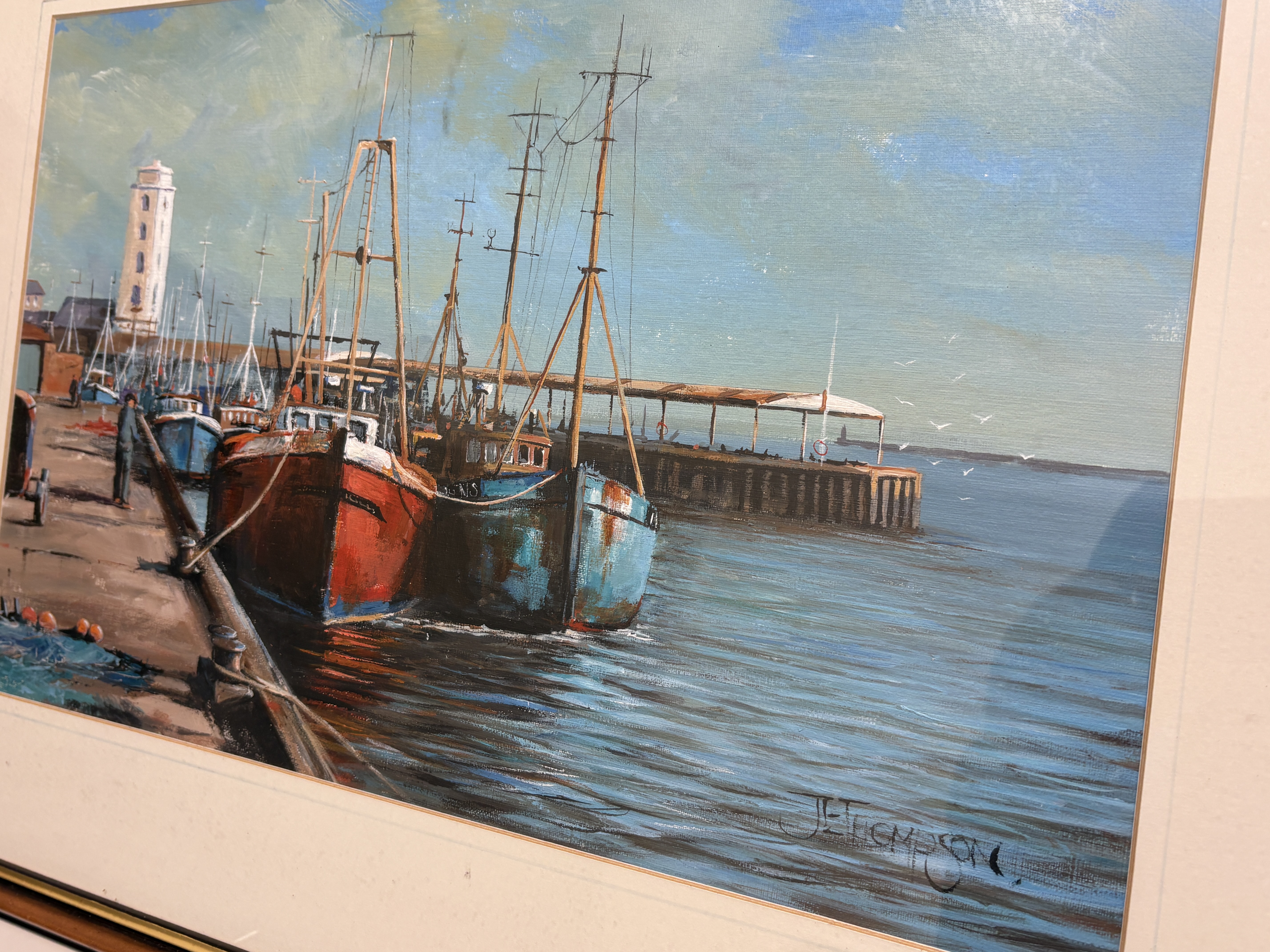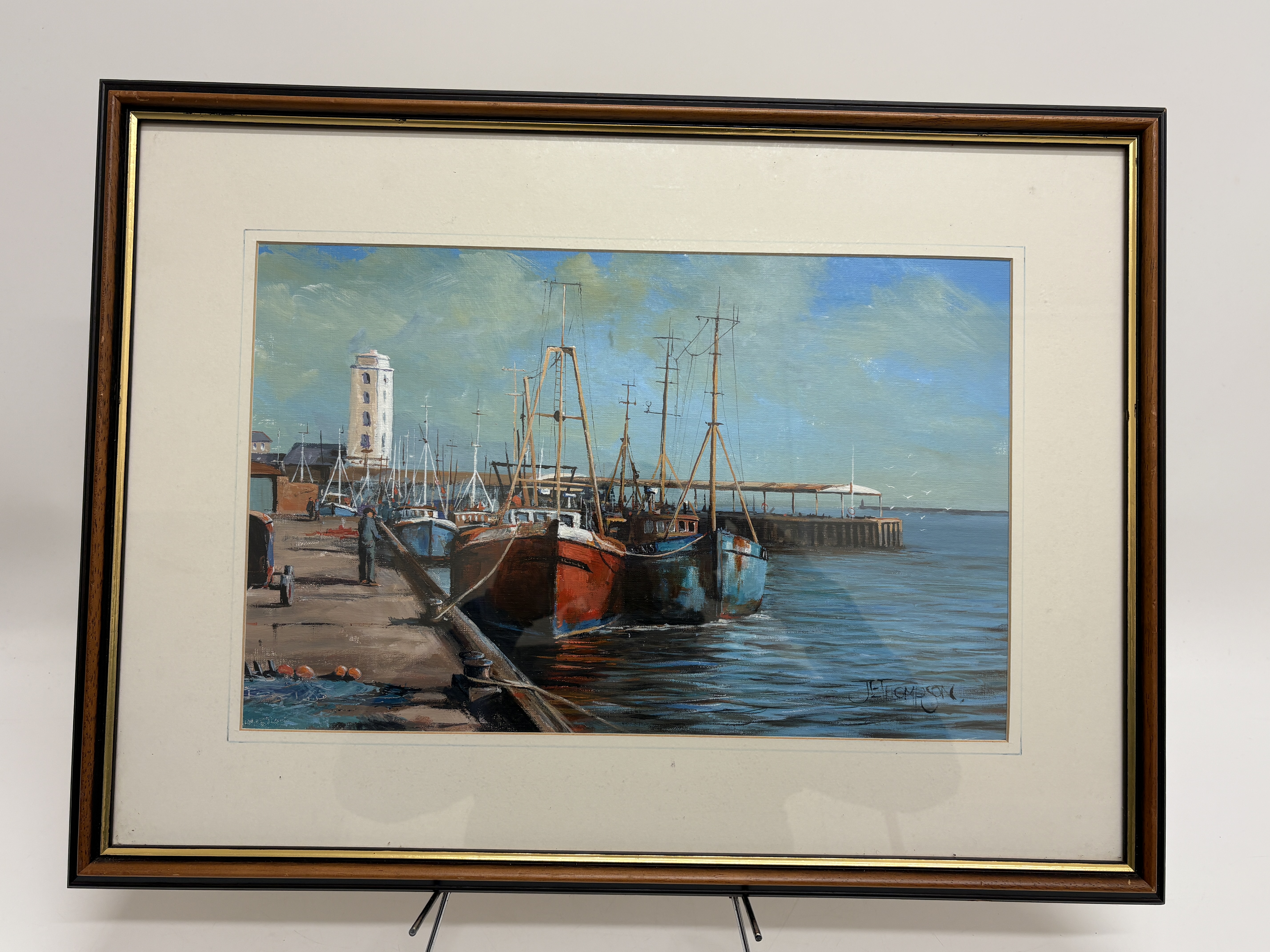 Now a retired Trawler man from Blyth J.E. Thompson has produced this depicting a North Shields Fish Quay harbour scene. The composition features several fishing trawlers, moored alongside a dock. The work is executed in an impressionistic maritime style. The artist captures atmospheric light, highlights to define the vessels and their reflections. The background depicts the industrial architecture of the dockside under a muted sky. The painting is signed by J.E. THOMPSON. in the lower right corner. It is housed in a dark wood frame with a gilt inner slip and a cream-coloured mount.