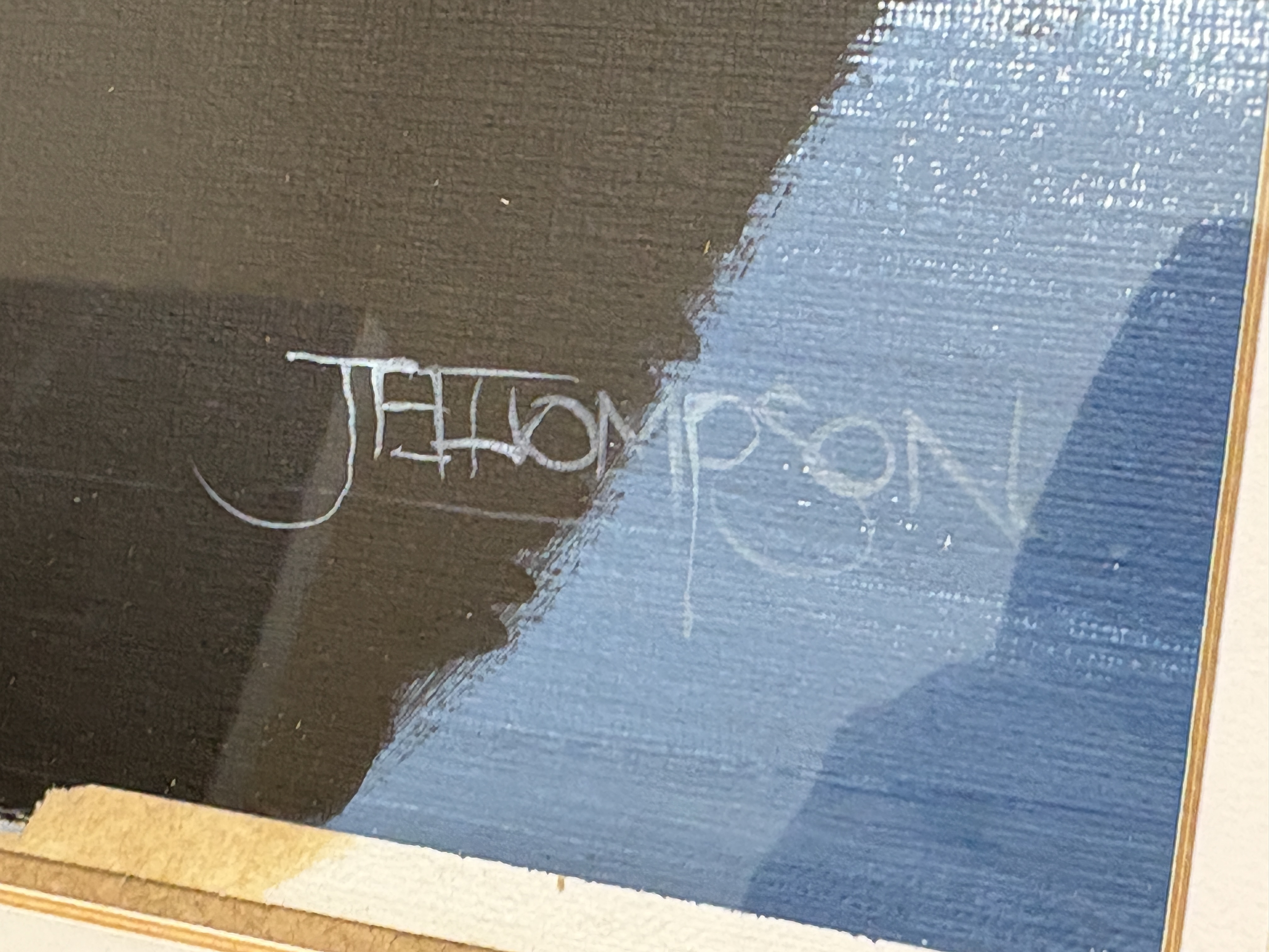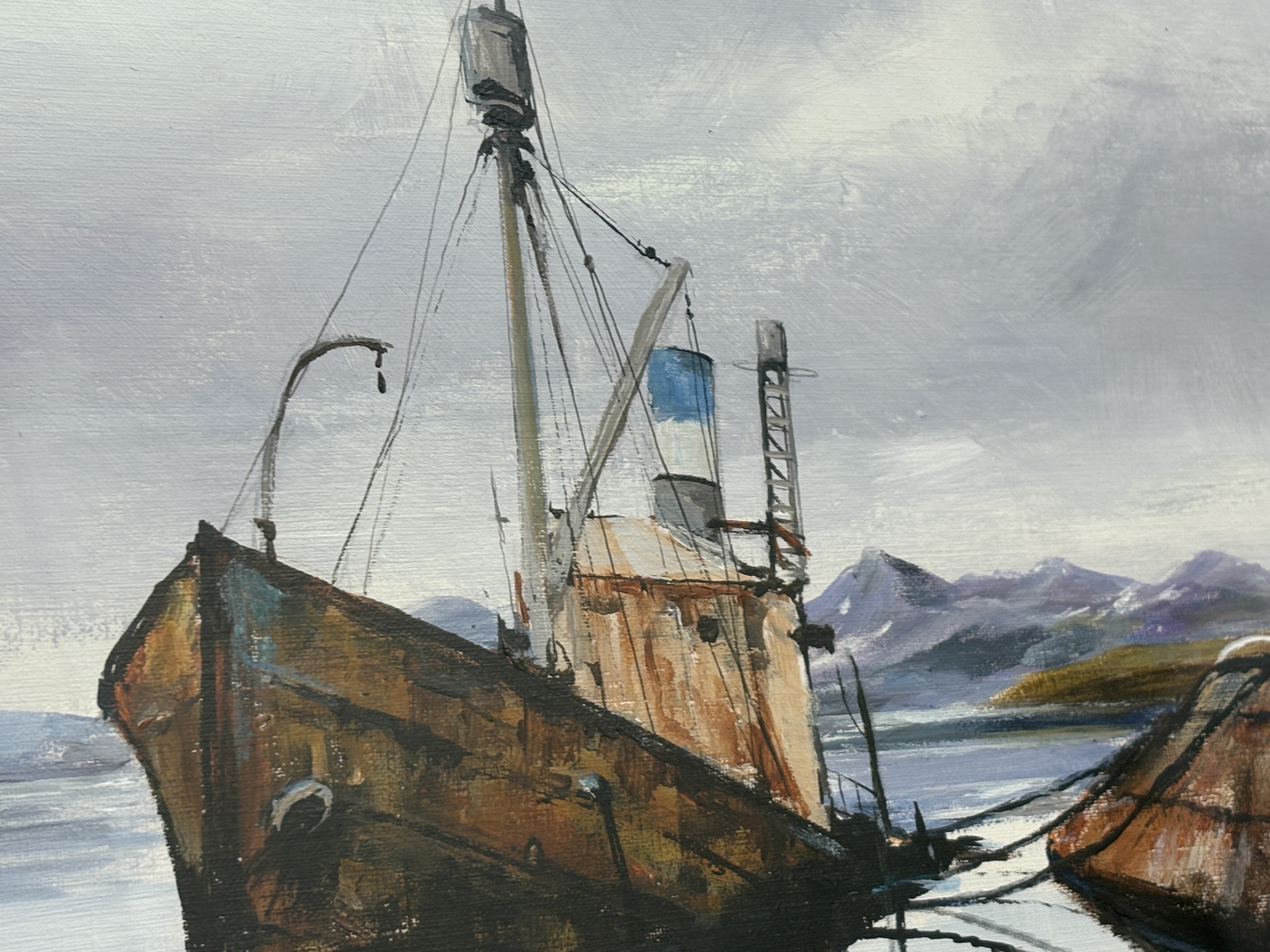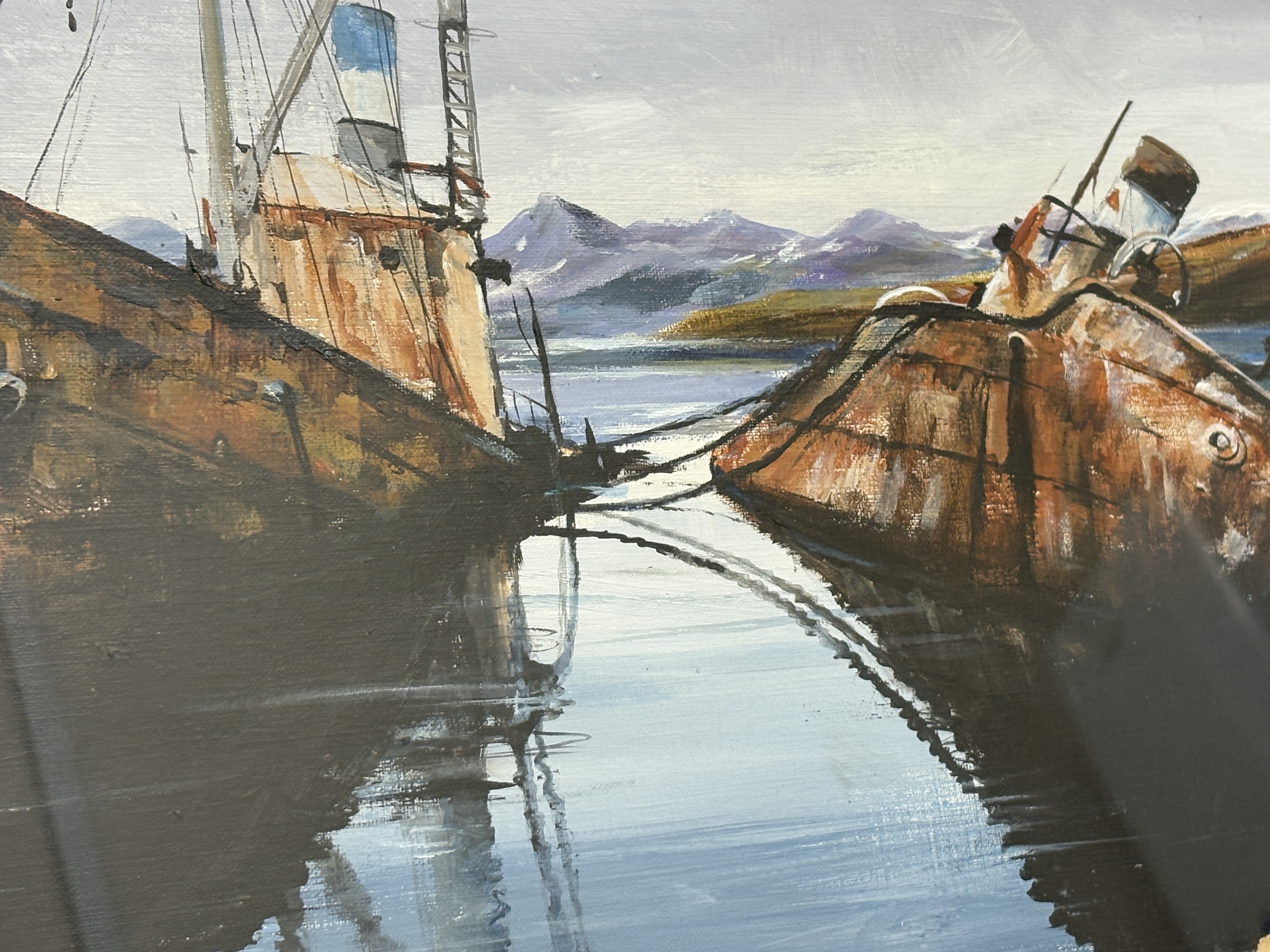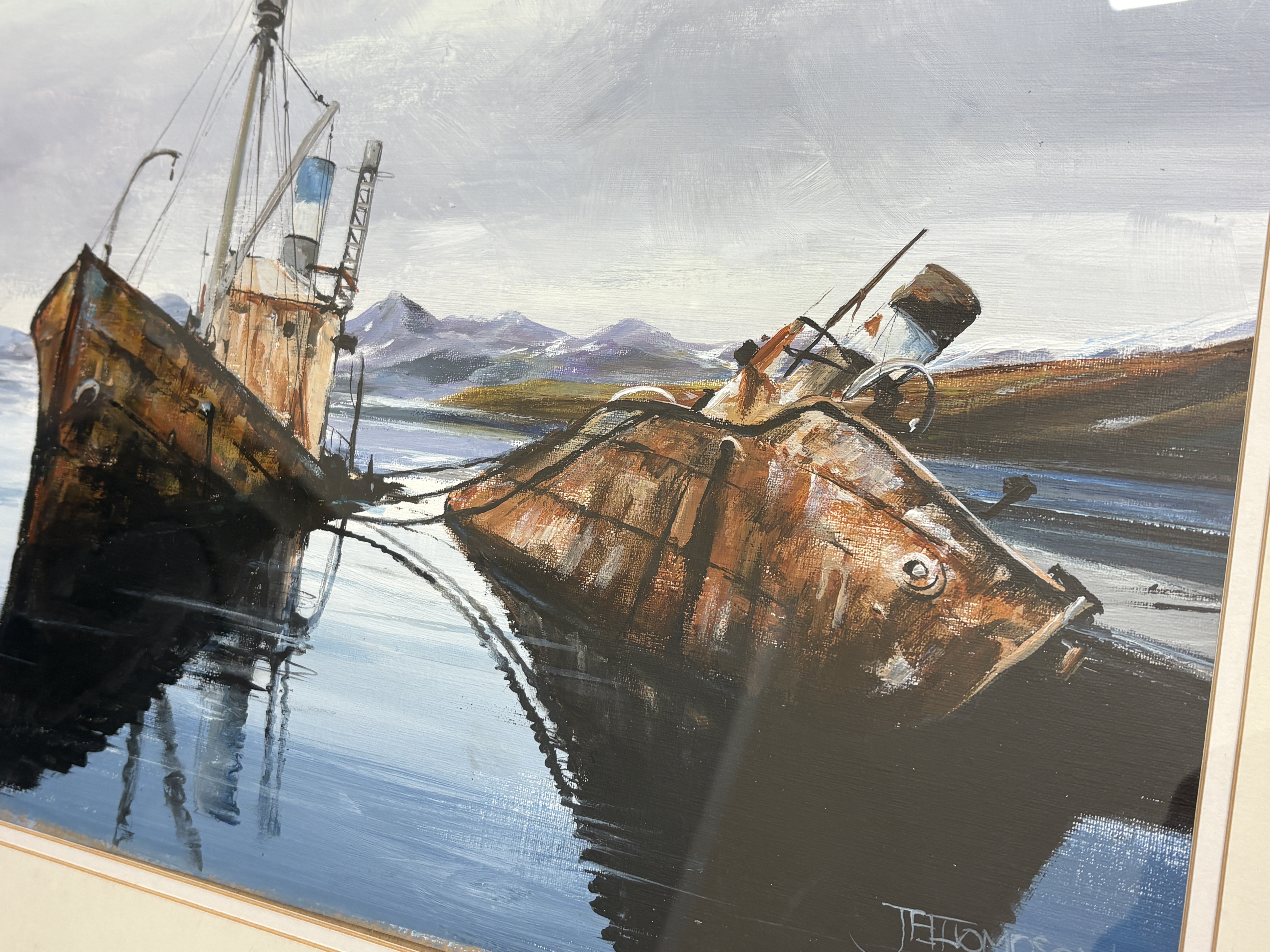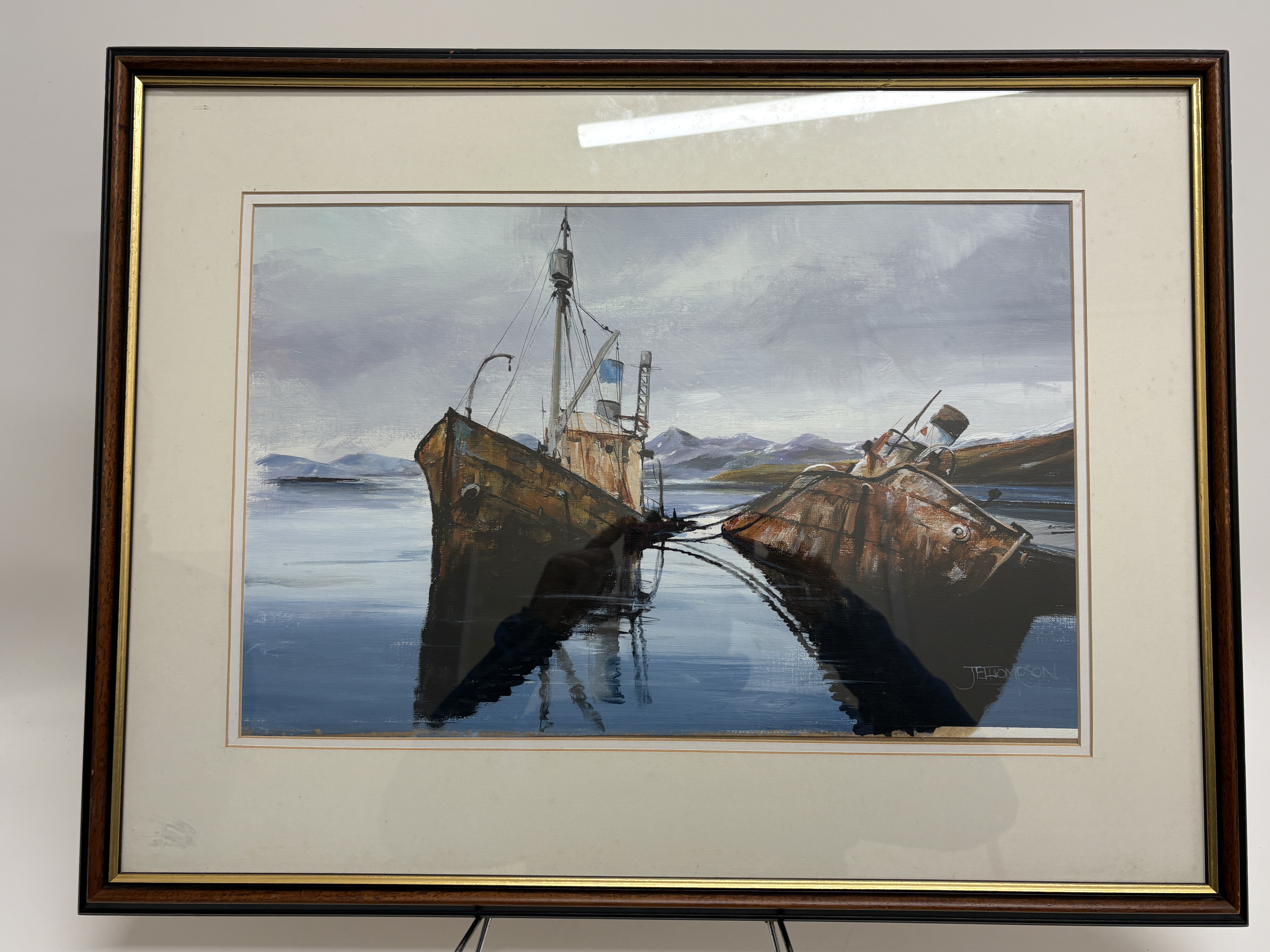 Now a retired Trawler man from Blyth J.E. Thompson has produced this artwork which depicts two rusted, decommissioned ships, moored together in a calm bay with a backdrop of snow-dusted mountains. The composition uses a palette of earthy rust tones and ochres for the vessels, contrasted with cool blues and greys for the water and sky. The signature is J, E, Thompson. The artwork is presented in a cream mount within a dark wood frame featuring a gilt inner slip.