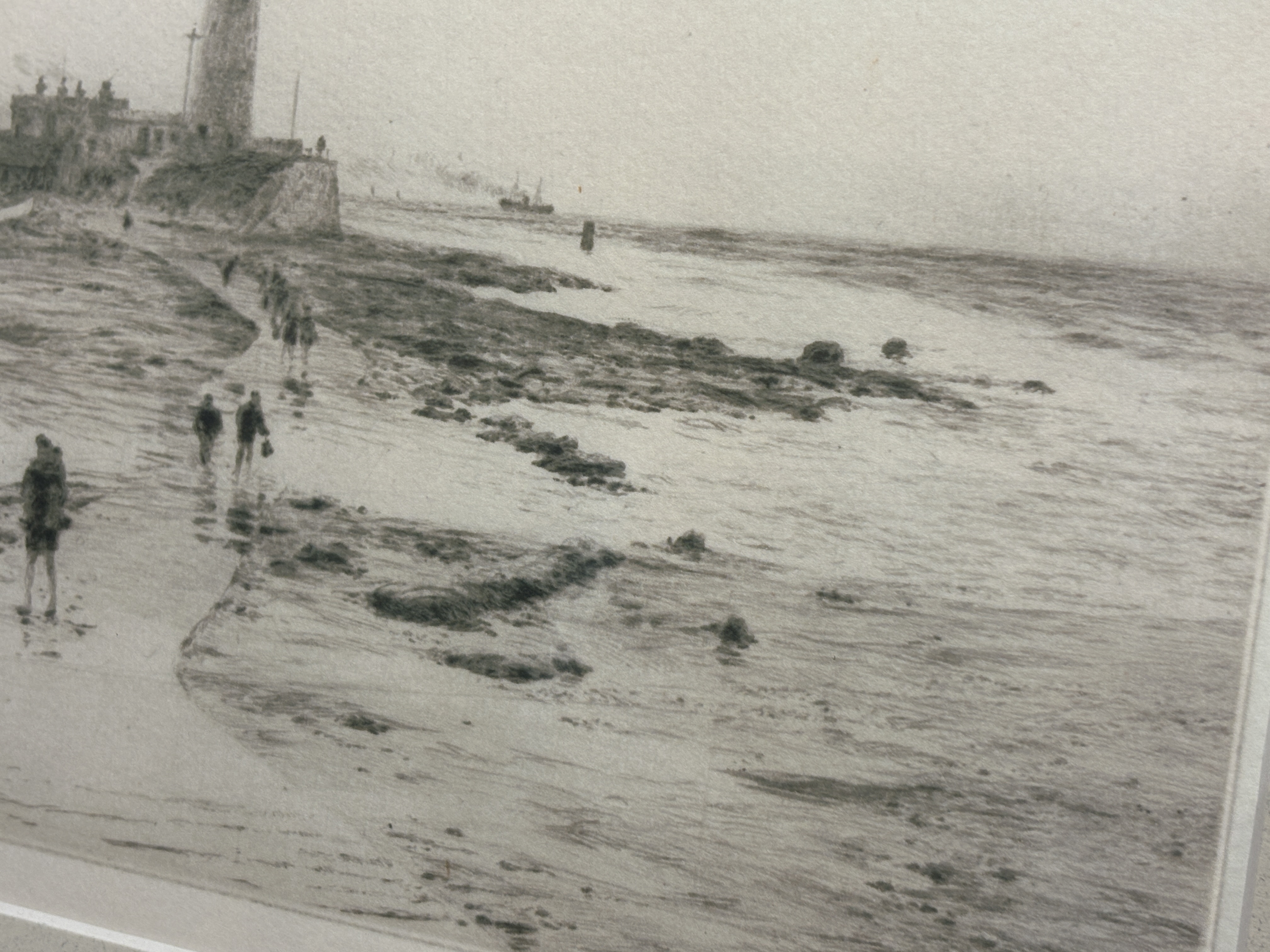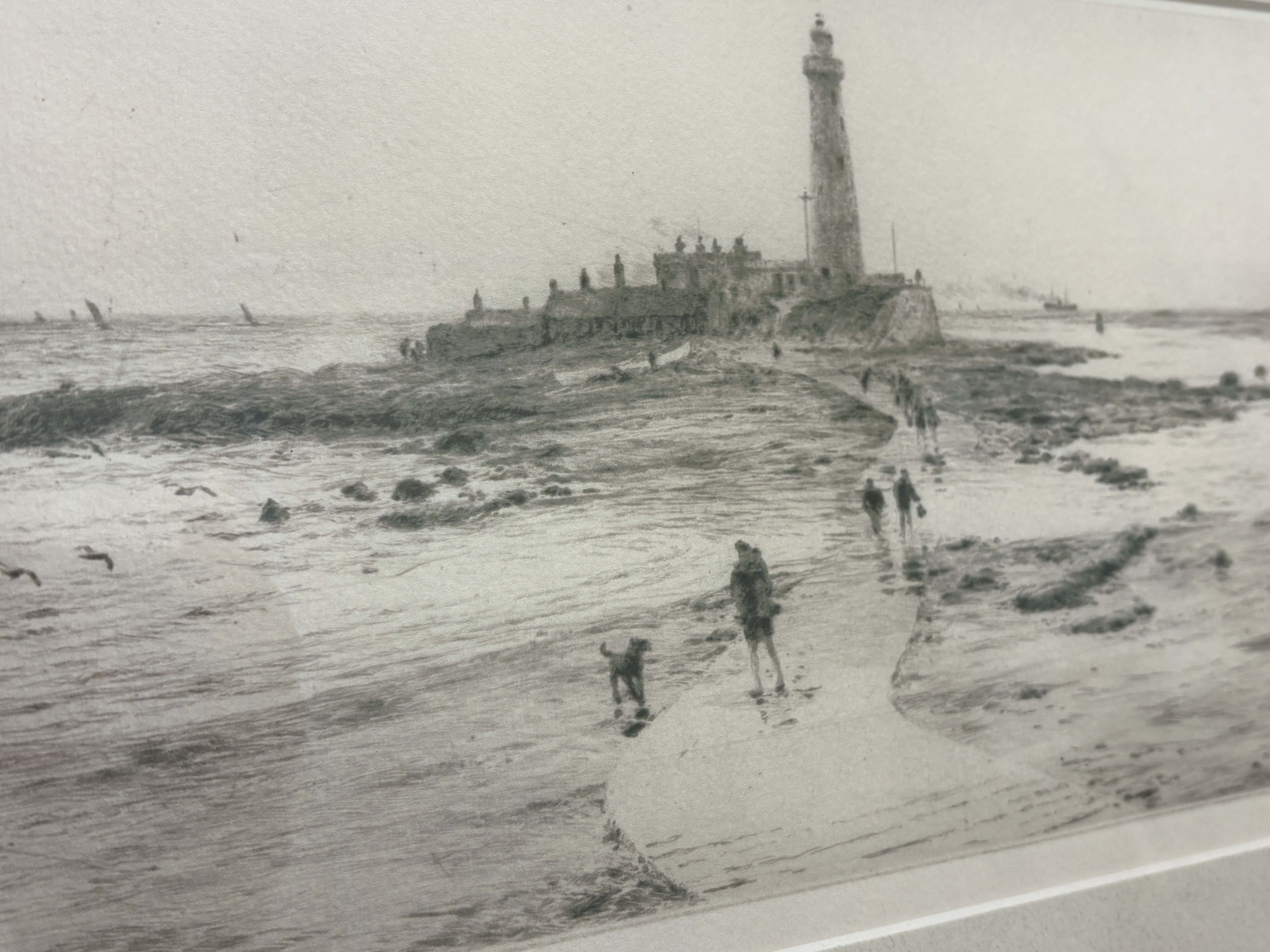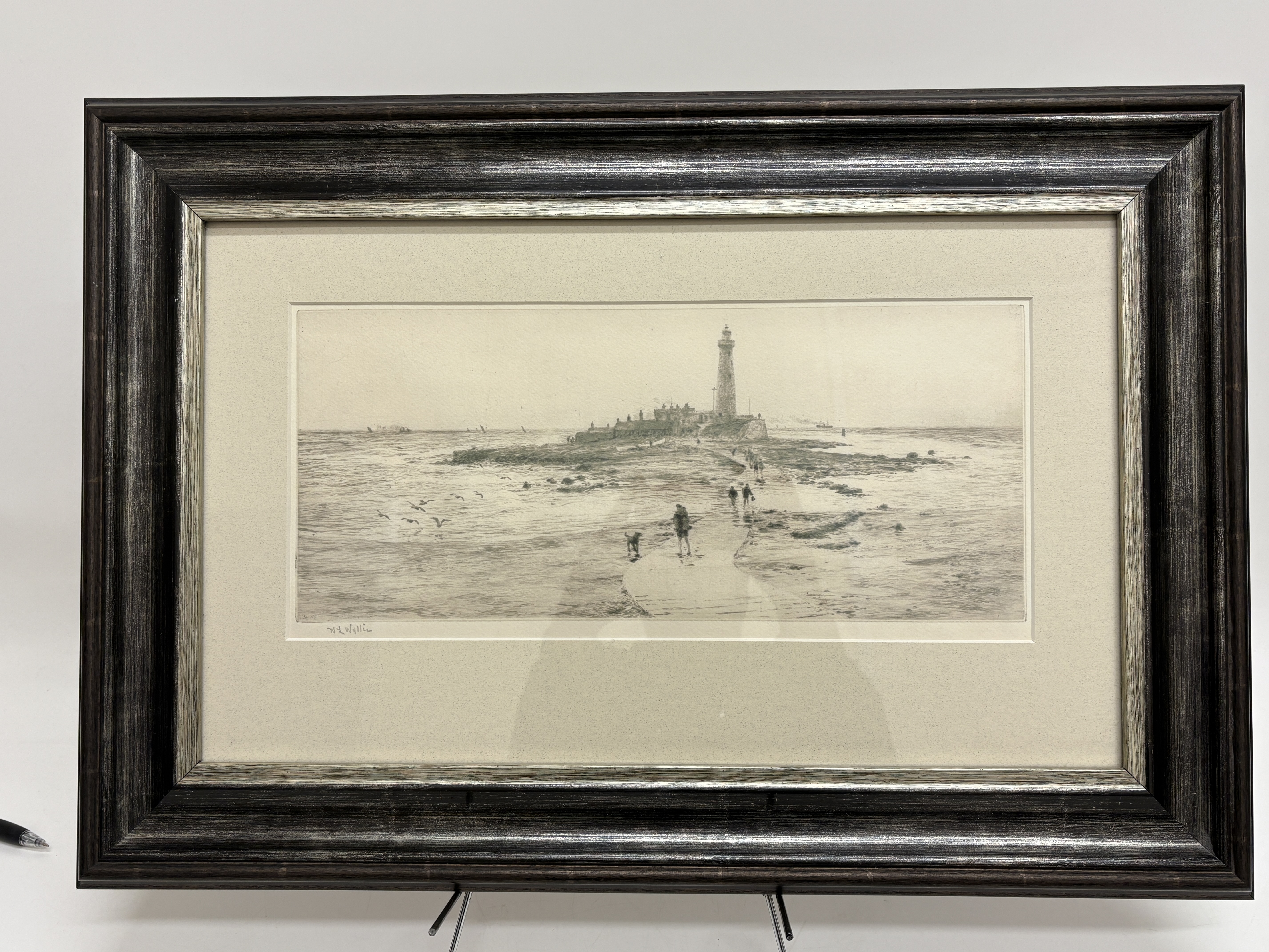 A etching by the renound British maritime artist William Lionel Wyllie (1851-1931), depicting a coastal scene of St Mary’s Lighthouse at Whitley Bay. The composition features figures and a dog traversing the wet sands in the foreground, with seagulls in flight and distant ships on the horizon. The work is executed with the soft, burry lines characteristic of the drypoint technique, creating subtle tonal variations across the seascape. The print is pencil-signed by the artist in the lower left margin and displays clear, rectangular plate marks. It is professionally presented in a contemporary dark-wood frame with a silvered inner slip and a cream mount.