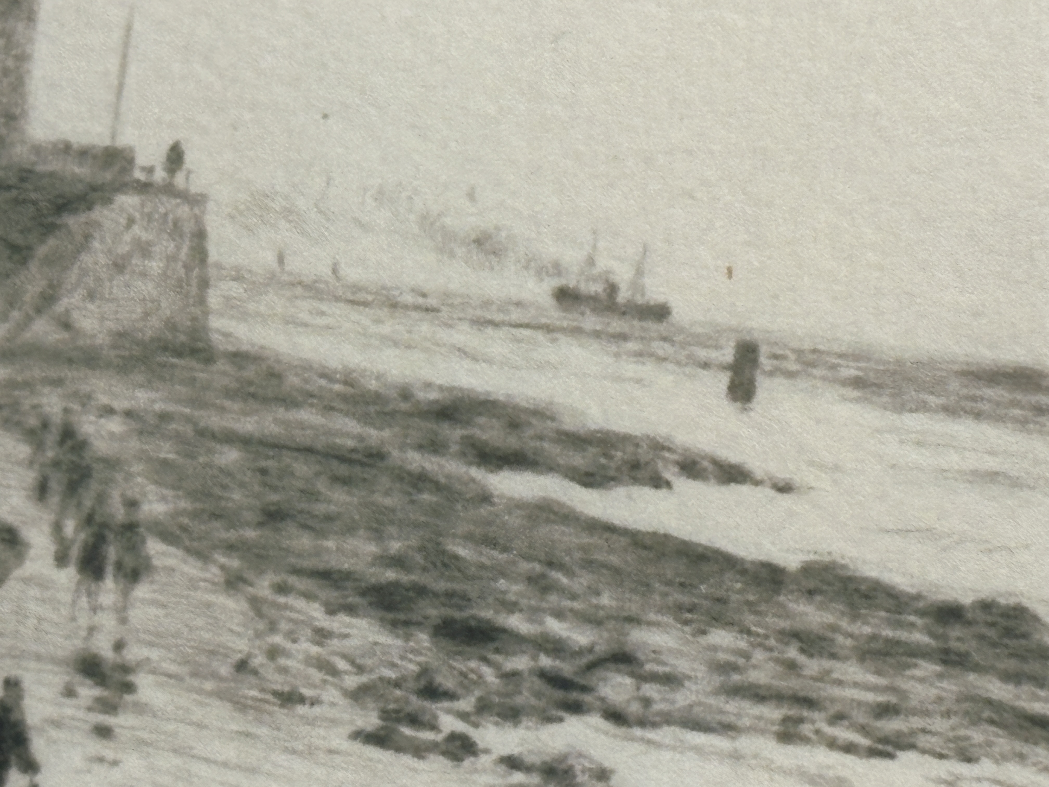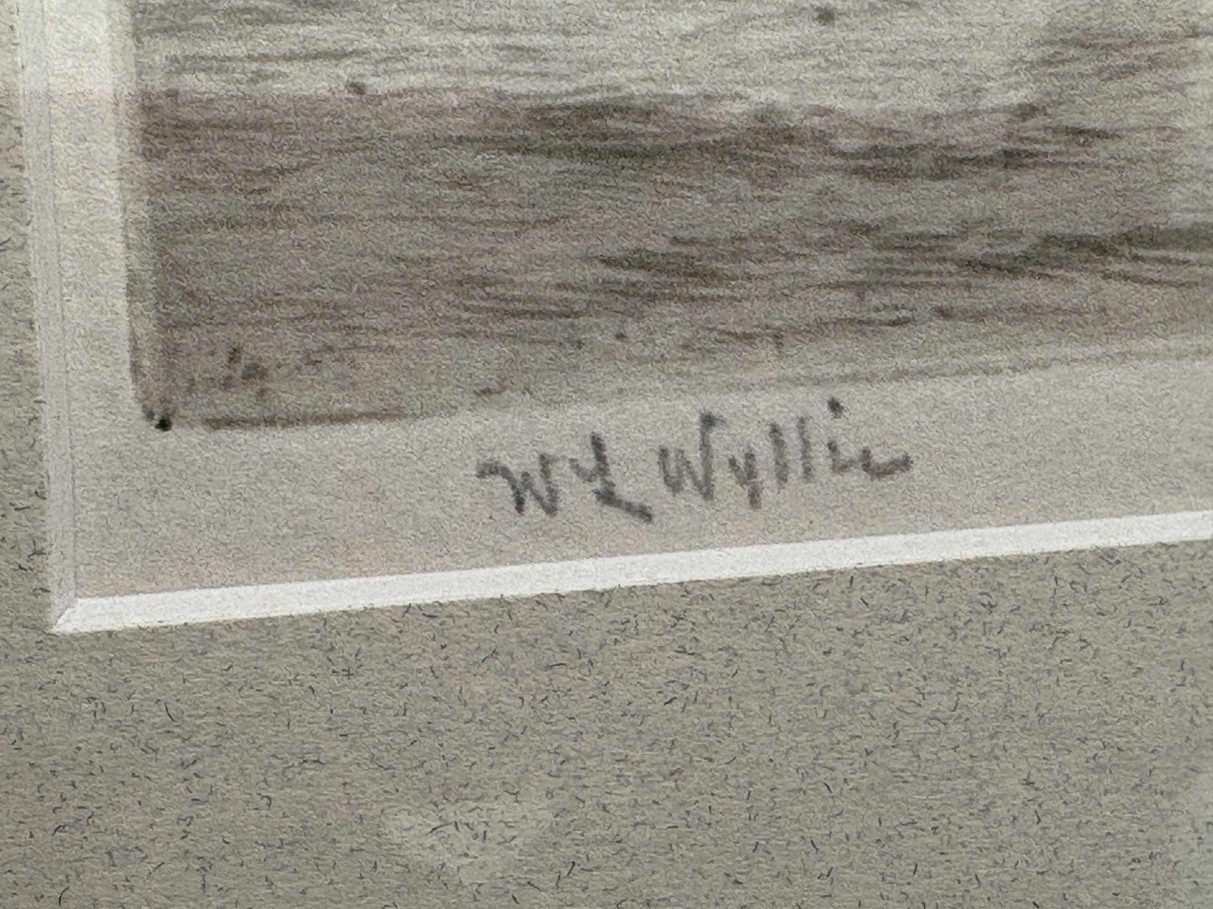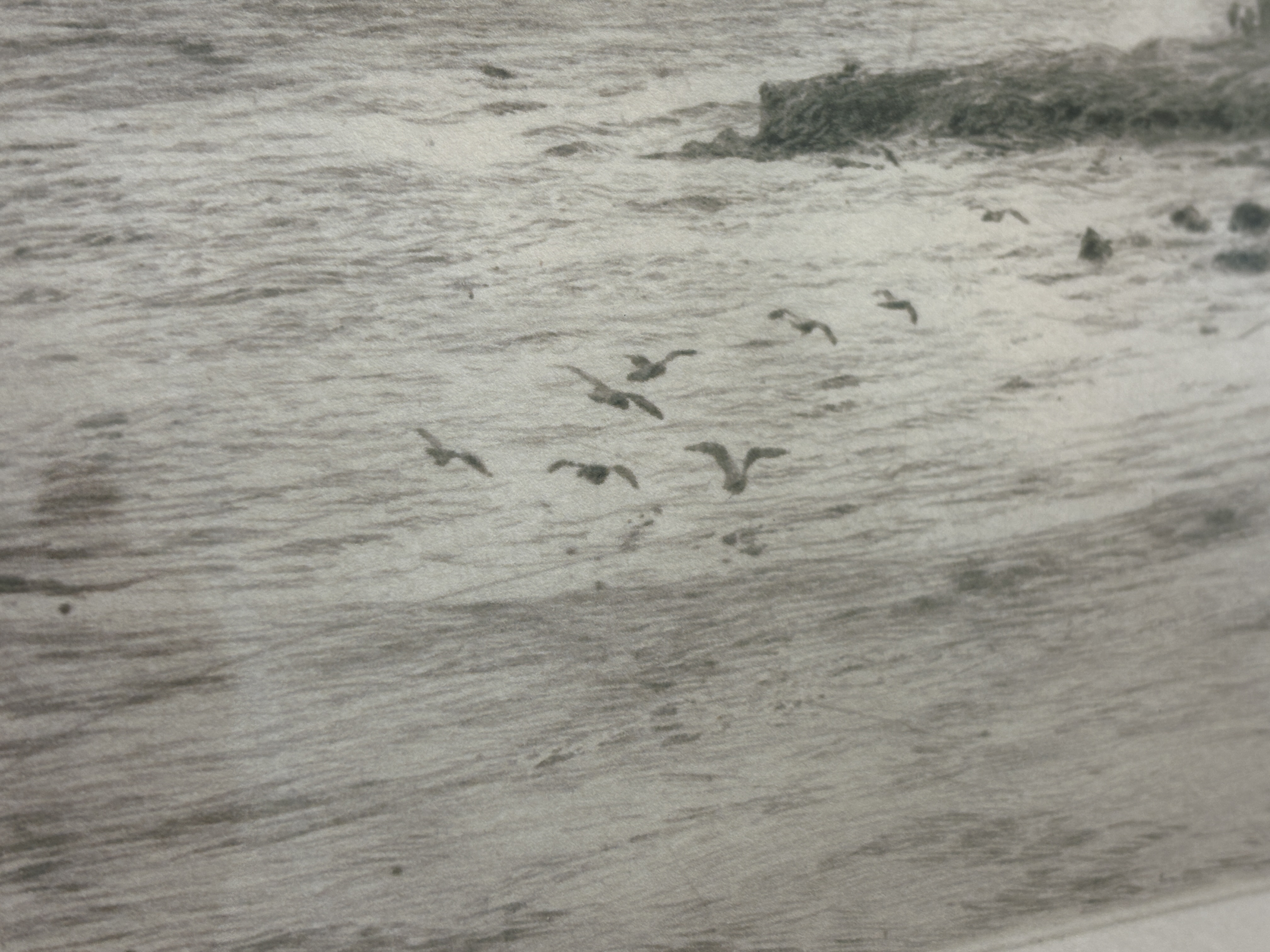 A etching by the renound British maritime artist William Lionel Wyllie (1851-1931), depicting a coastal scene of St Mary’s Lighthouse at Whitley Bay. The composition features figures and a dog traversing the wet sands in the foreground, with seagulls in flight and distant ships on the horizon. The work is executed with the soft, burry lines characteristic of the drypoint technique, creating subtle tonal variations across the seascape. The print is pencil-signed by the artist in the lower left margin and displays clear, rectangular plate marks. It is professionally presented in a contemporary dark-wood frame with a silvered inner slip and a cream mount.