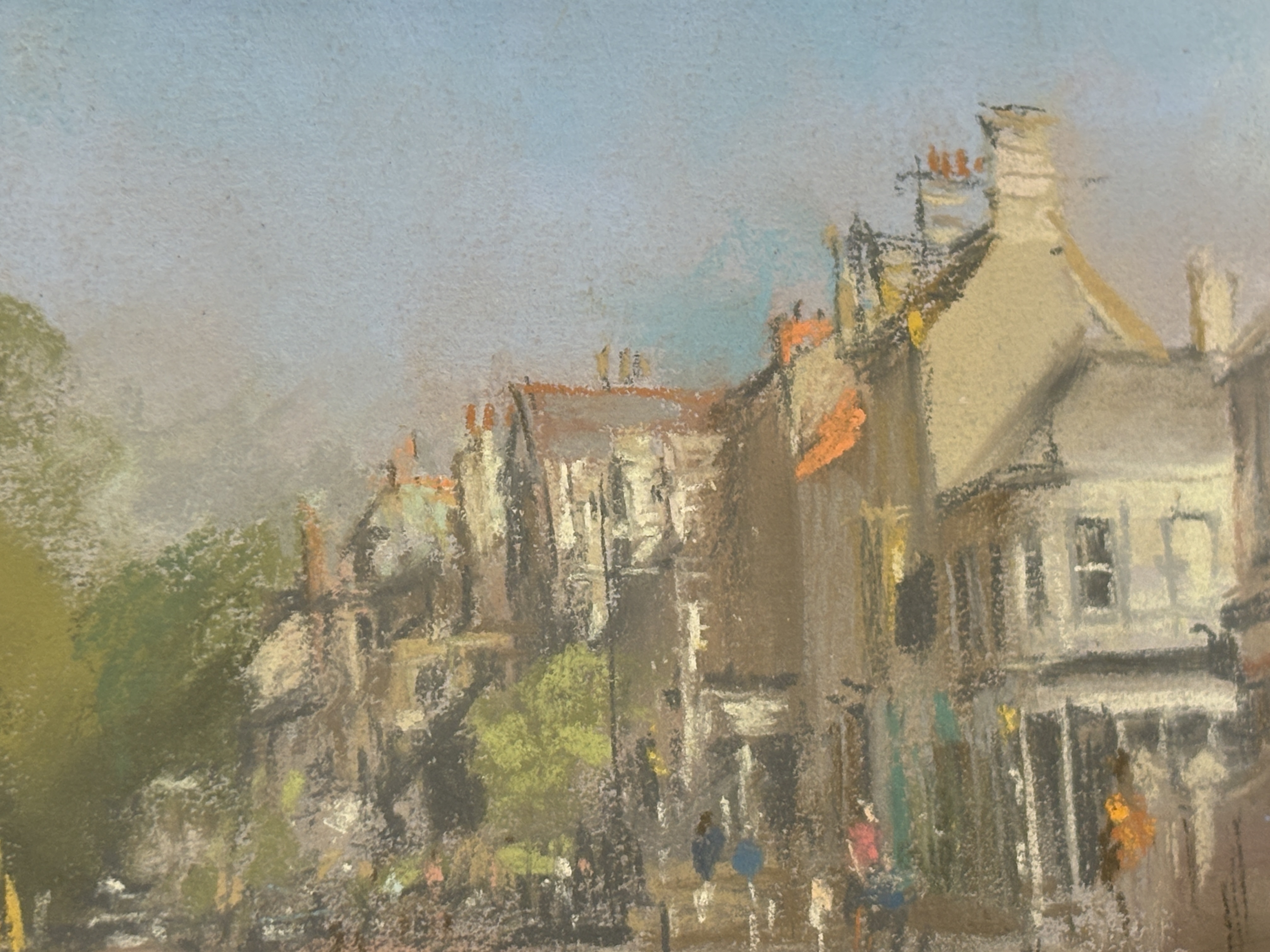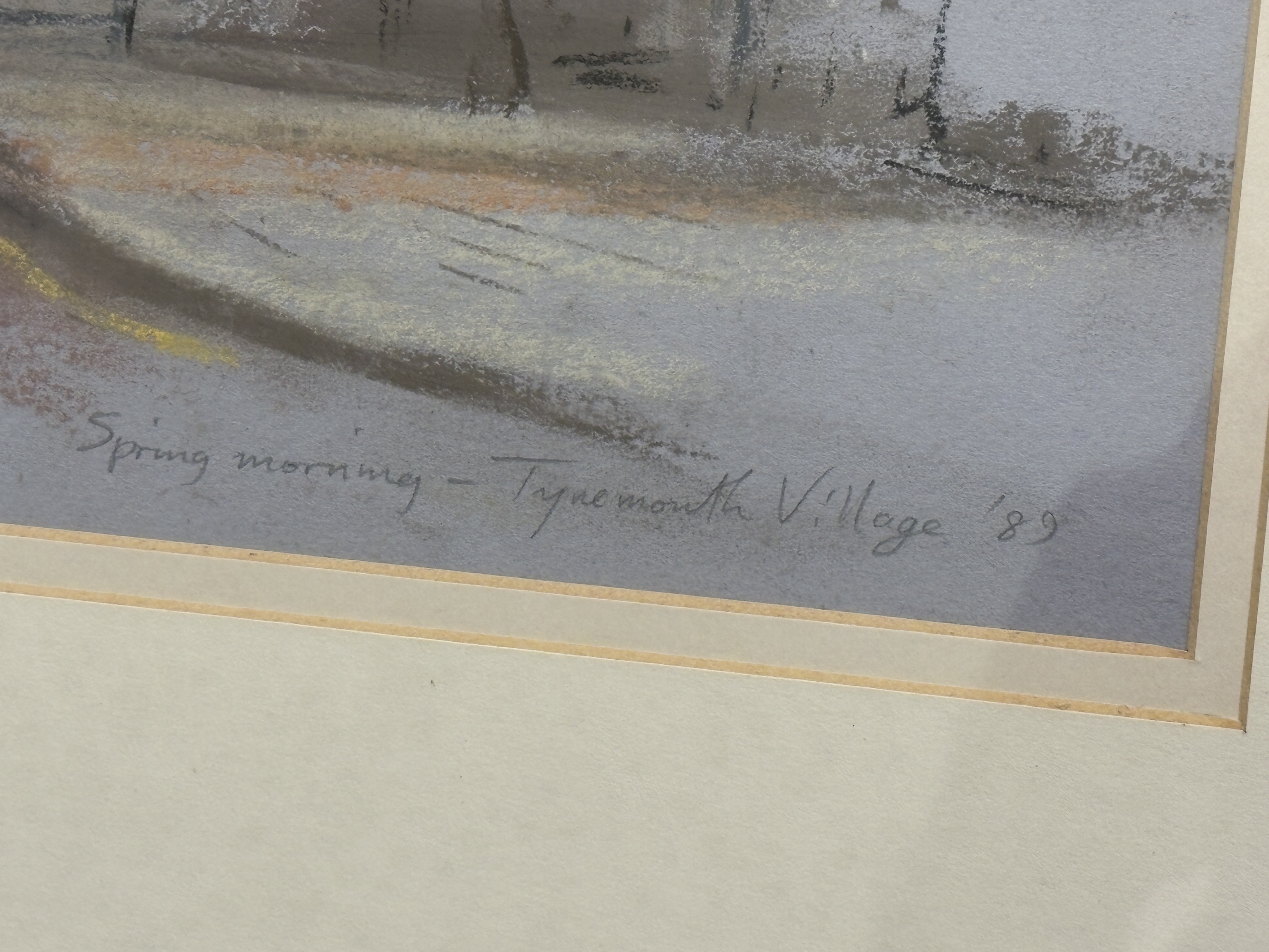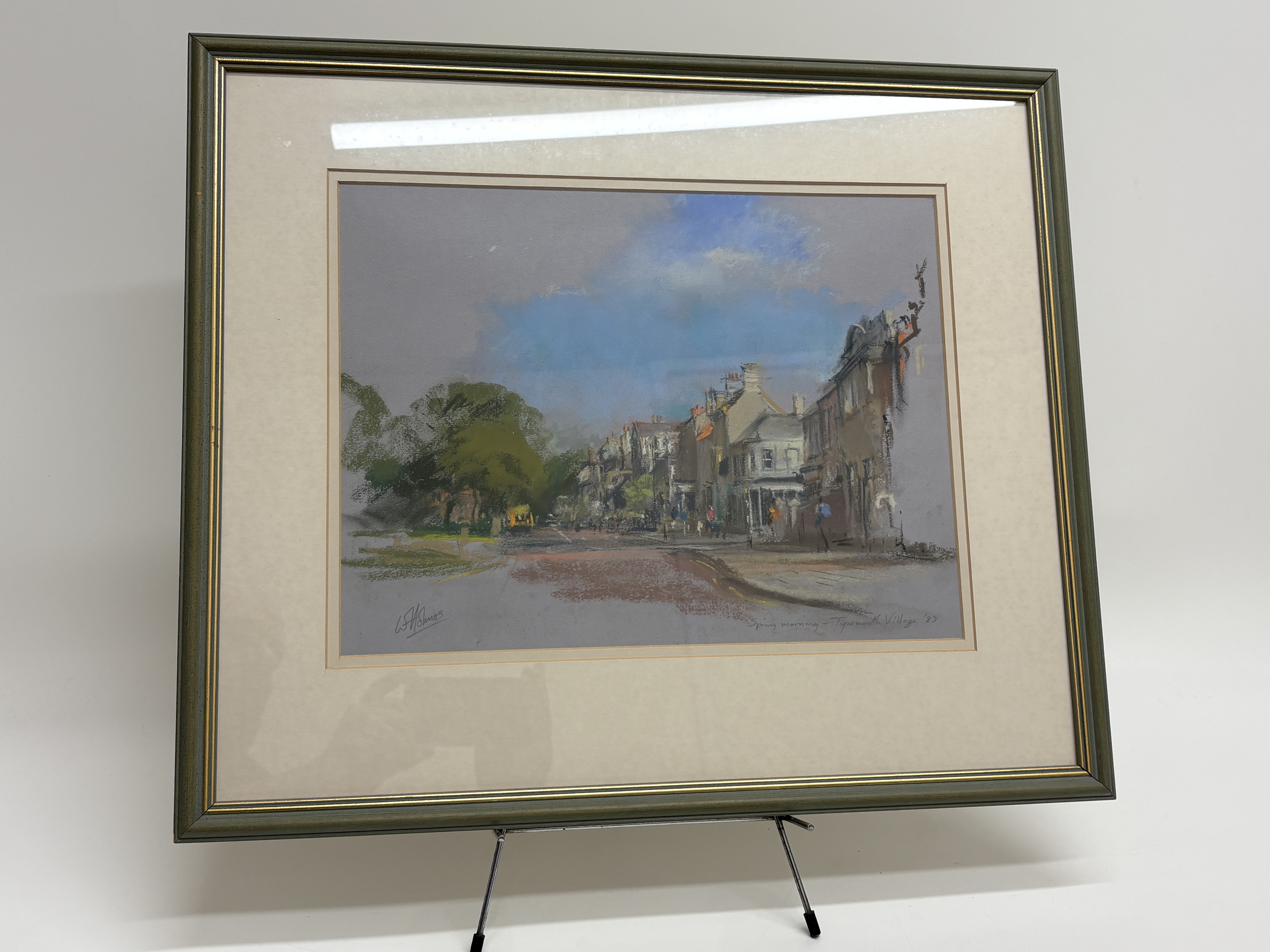 An impressionistic street scene rendered in pastel and chalk on grey toned wove paper. The work depicts a row of village buildings and storefronts in Tynemouth, balanced by mature greenery to the left. The artist has effectively utilised the natural grey tone of the paper to anchor the composition. Signed lower left: W H Johns. Titled and dated lower right: Spring morning – Tynemouth Village ’89. Housed in a contemporary dark green and gilt-accented frame with a layered cream mat.