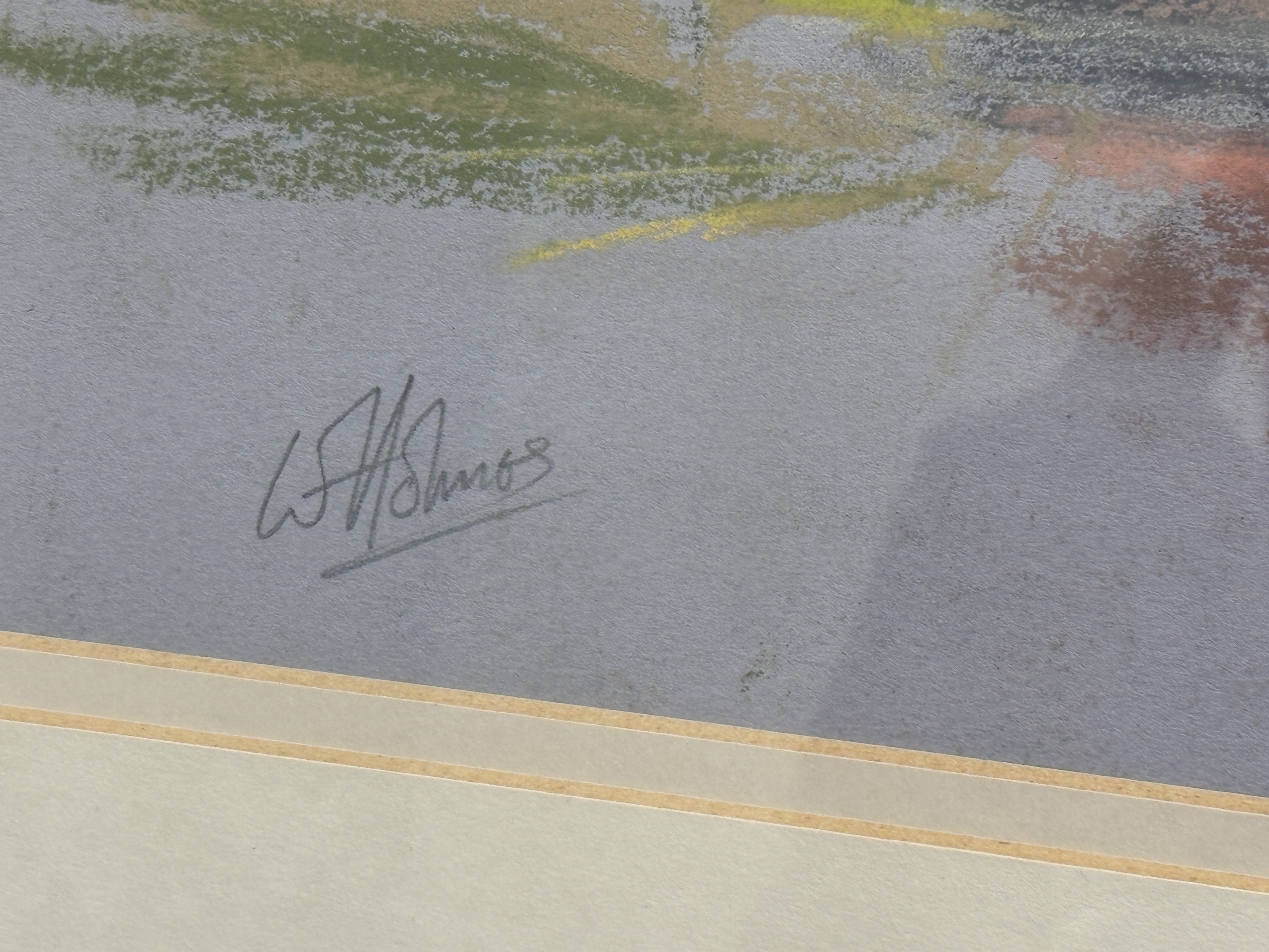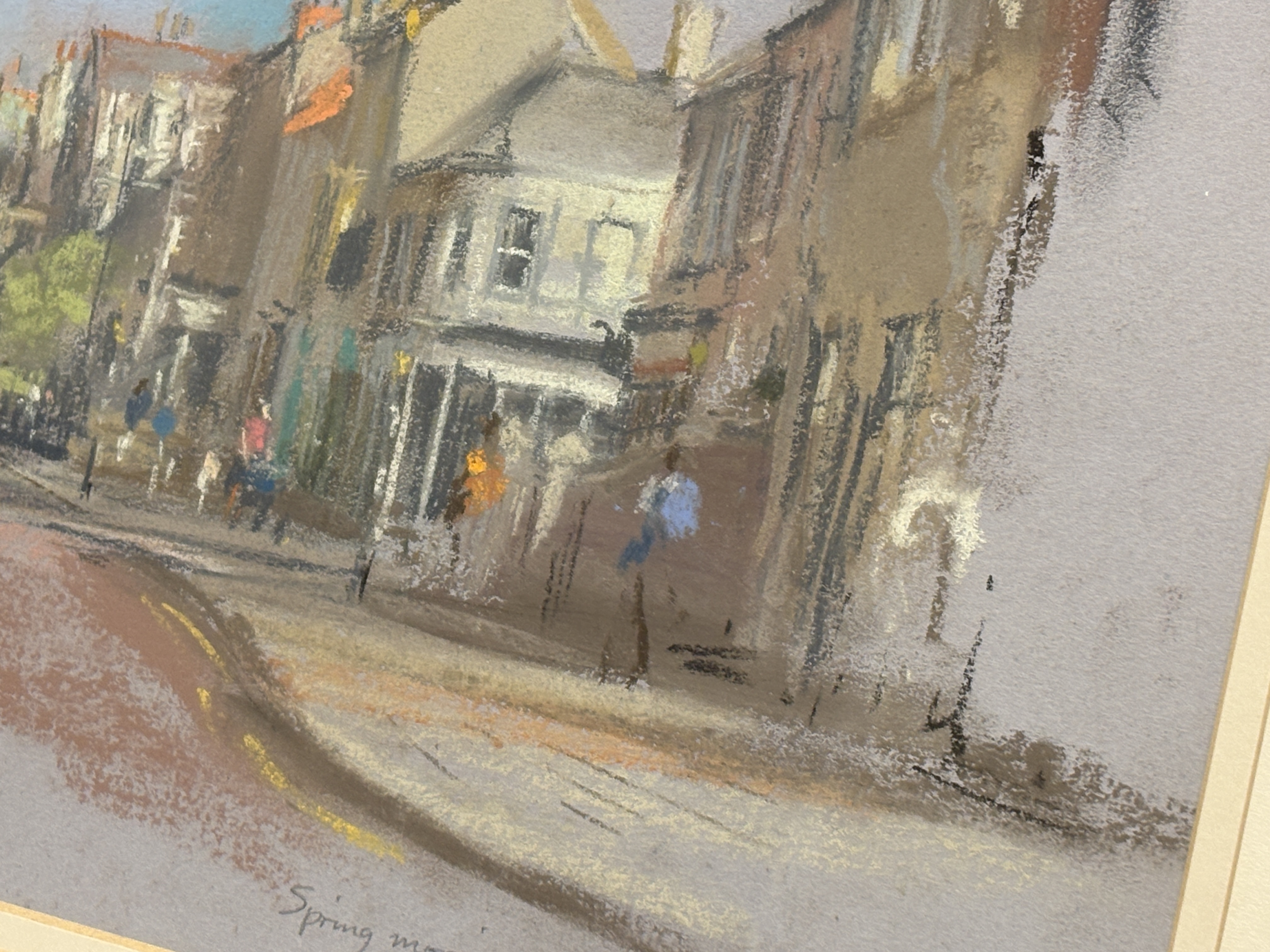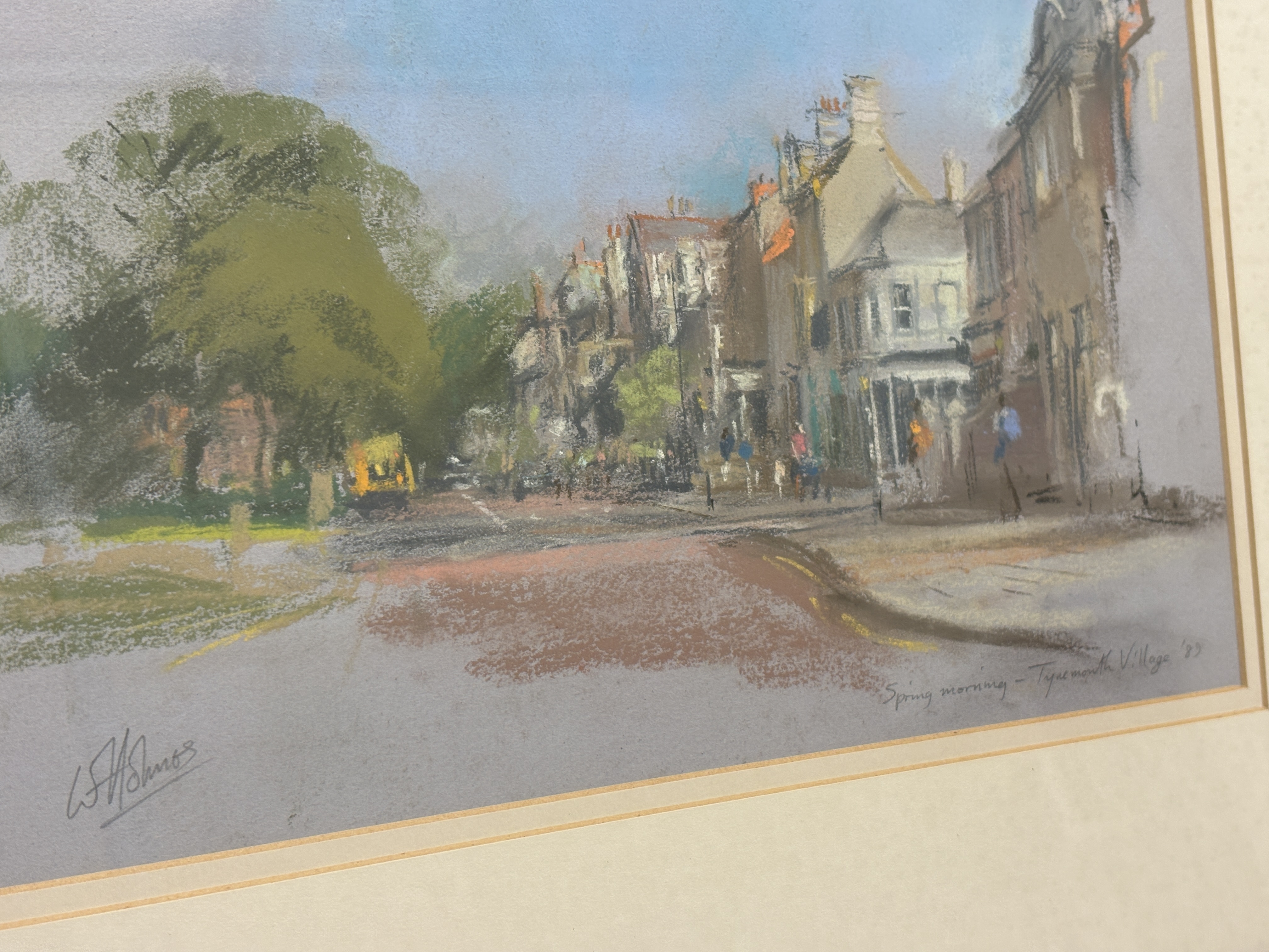An impressionistic street scene rendered in pastel and chalk on grey toned wove paper. The work depicts a row of village buildings and storefronts in Tynemouth, balanced by mature greenery to the left. The artist has effectively utilised the natural grey tone of the paper to anchor the composition. Signed lower left: W H Johns. Titled and dated lower right: Spring morning – Tynemouth Village ’89. Housed in a contemporary dark green and gilt-accented frame with a layered cream mat.