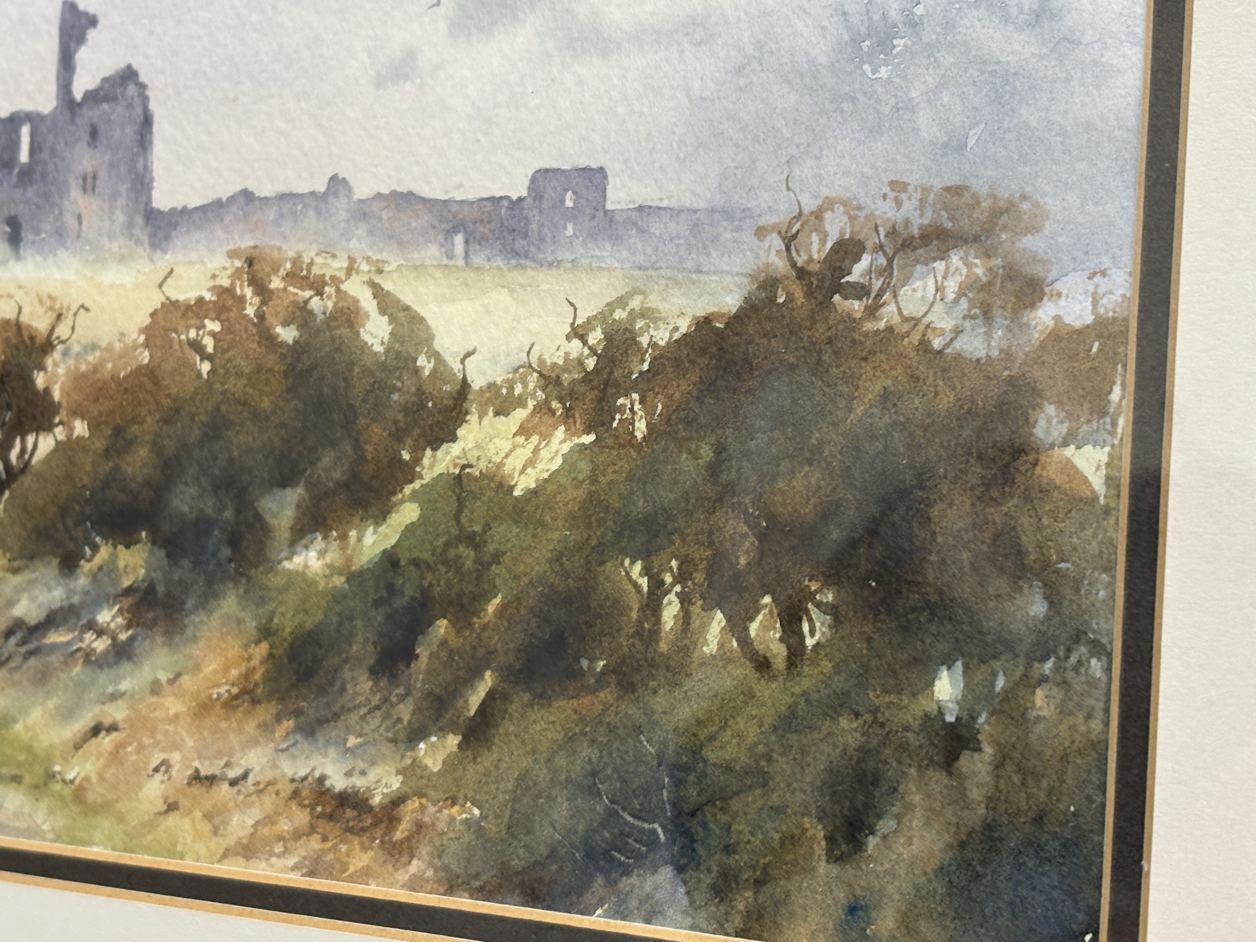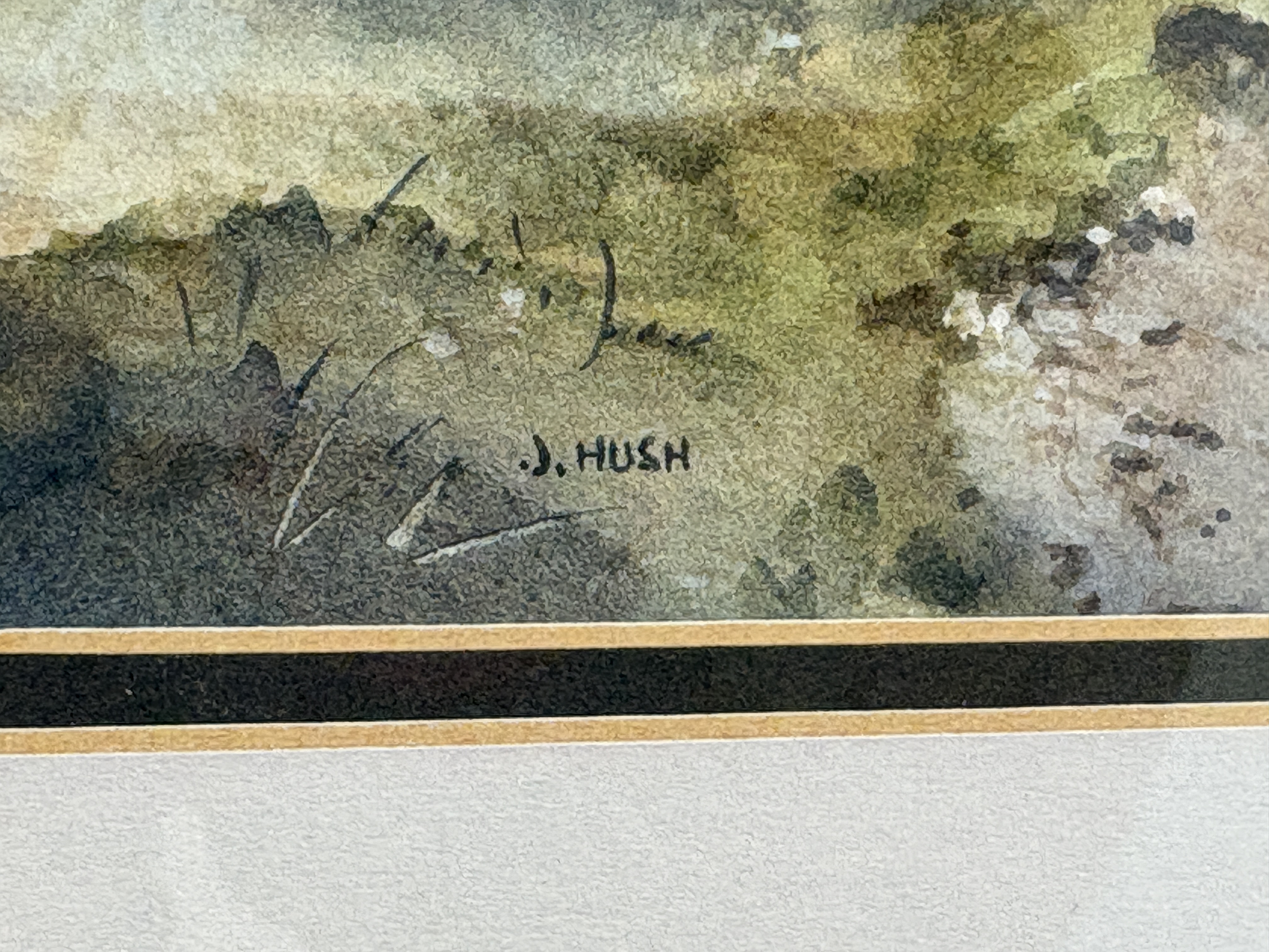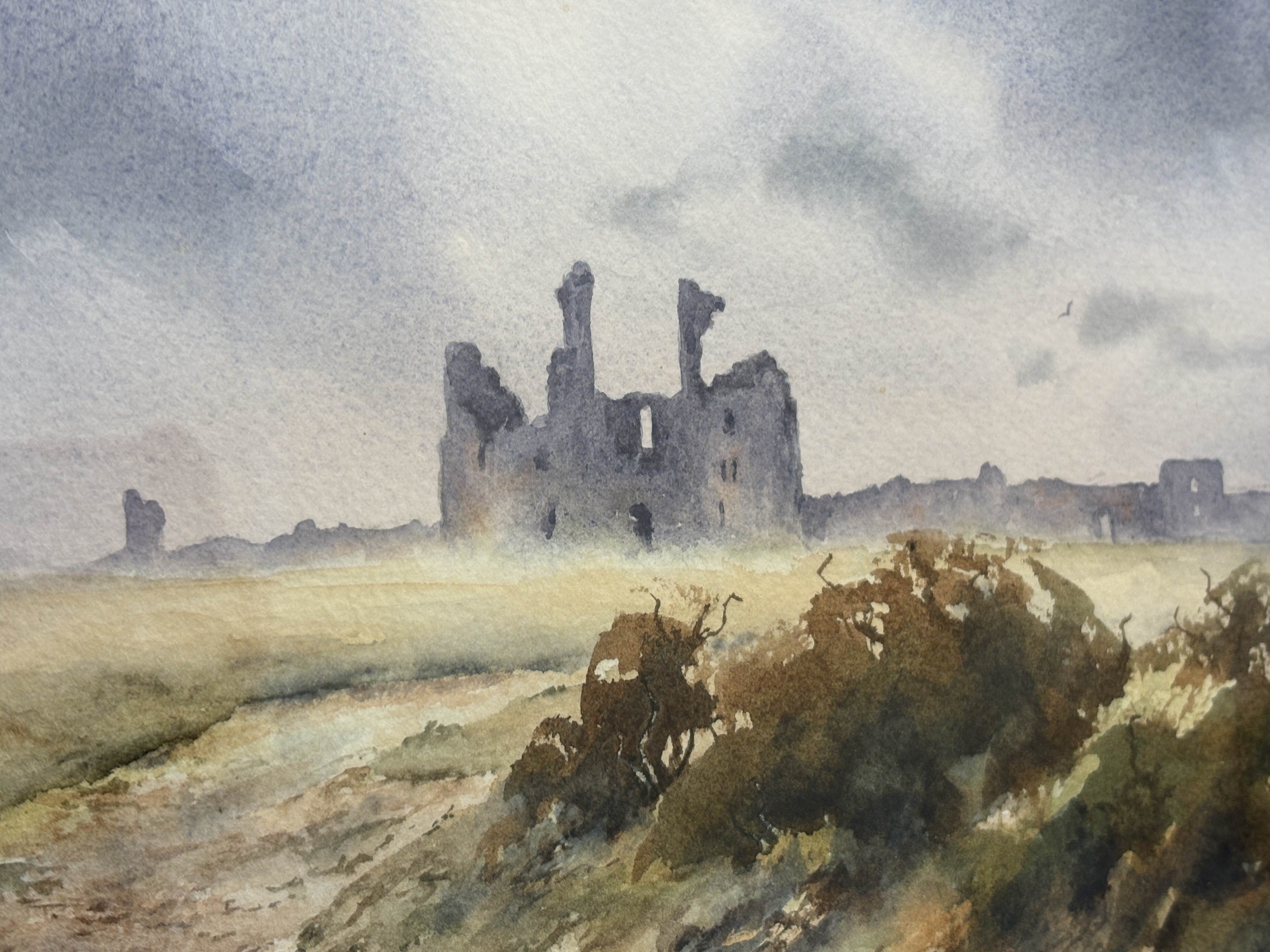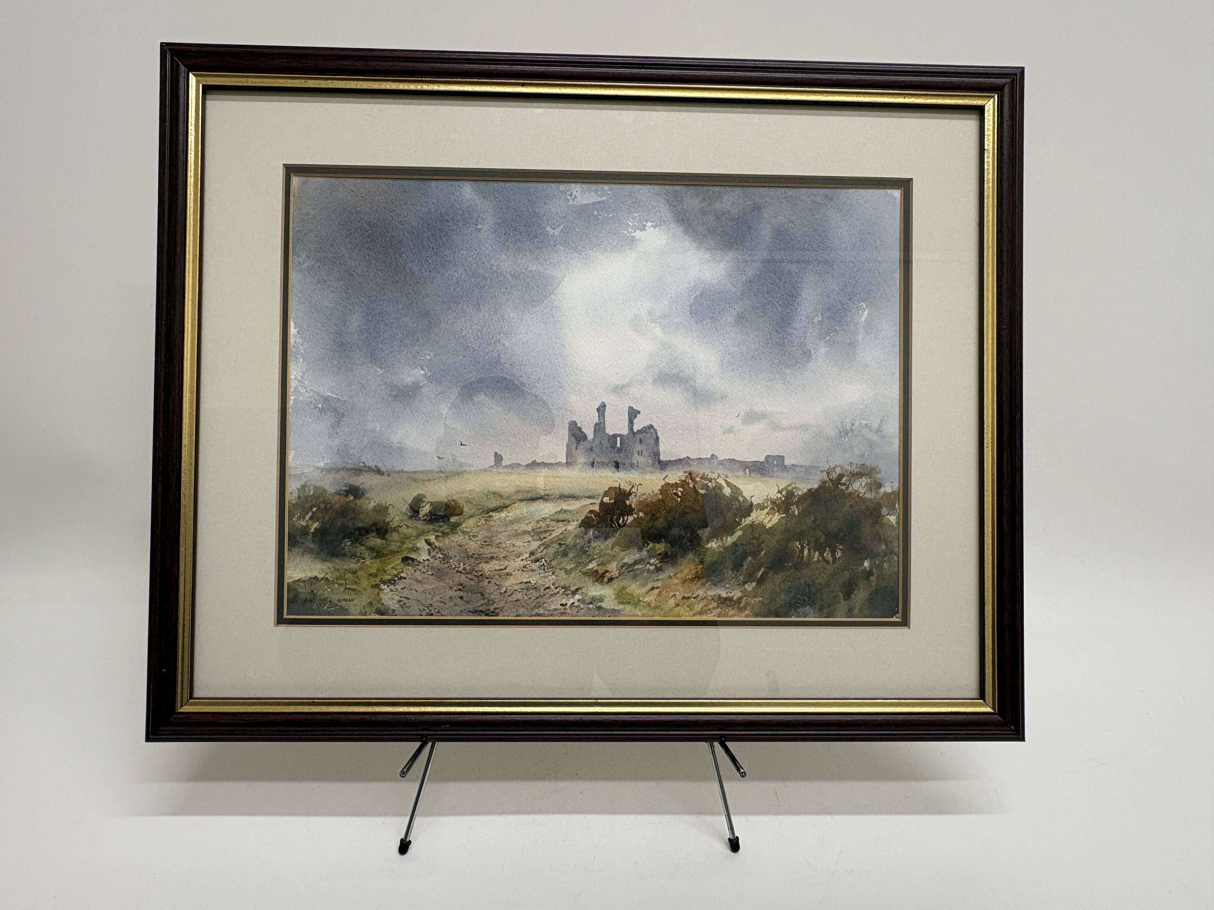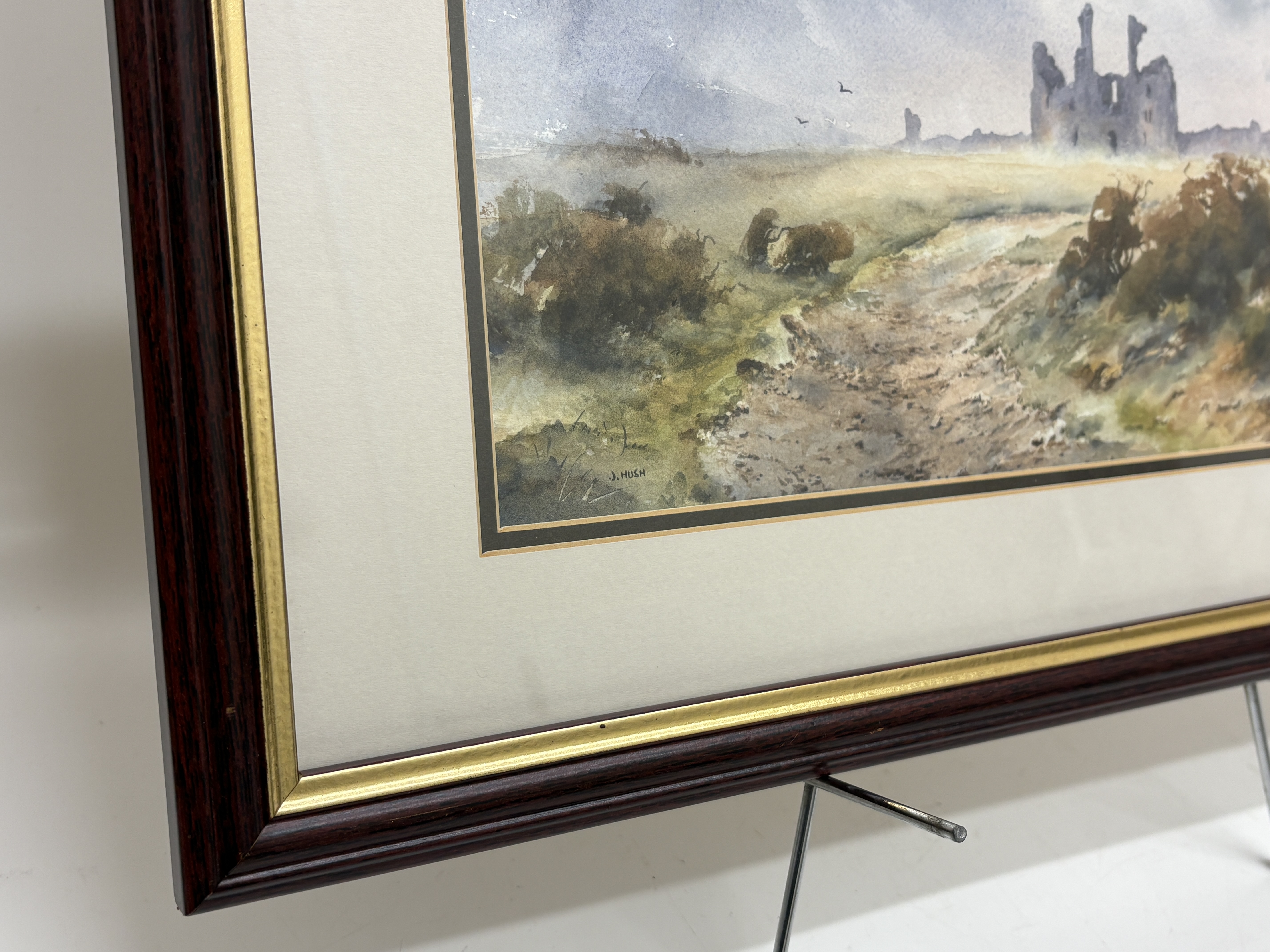 A watercolour on paper by the artist J. Hush, depicting the coastal ruins of Dunstanburgh Castle in Northumberland. The composition features a winding track in the foreground leading through scrubland and gorse towards the distant fortification. The sky is rendered with atmospheric, heavy grey and blue washes, suggesting overcast conditions. The work is signed J. HUSH in the lower left corner. The painting is housed behind glass in a multi-layered cream mount with a decorative double ruled border in black and gold, set within a dark mahogany-toned wood frame with a gilt inner slip.