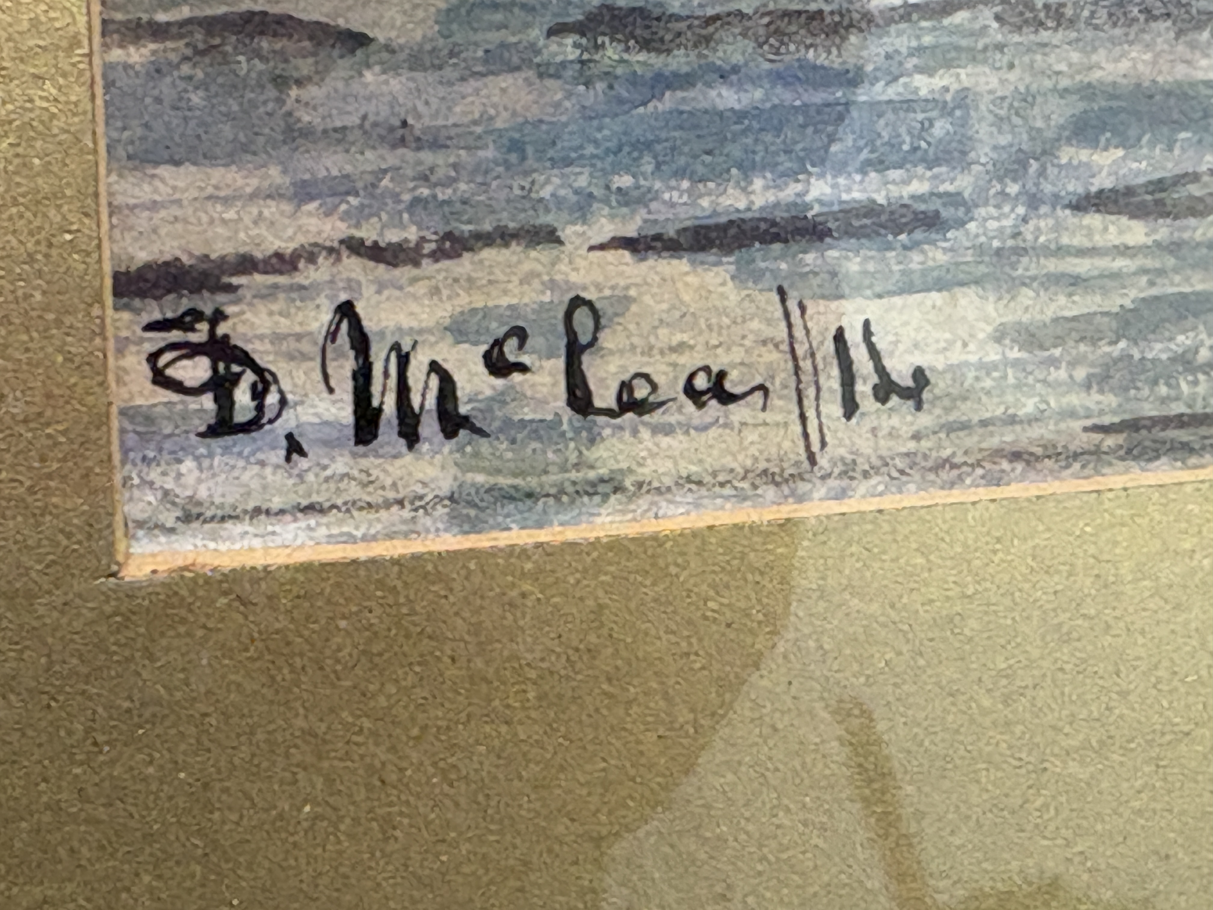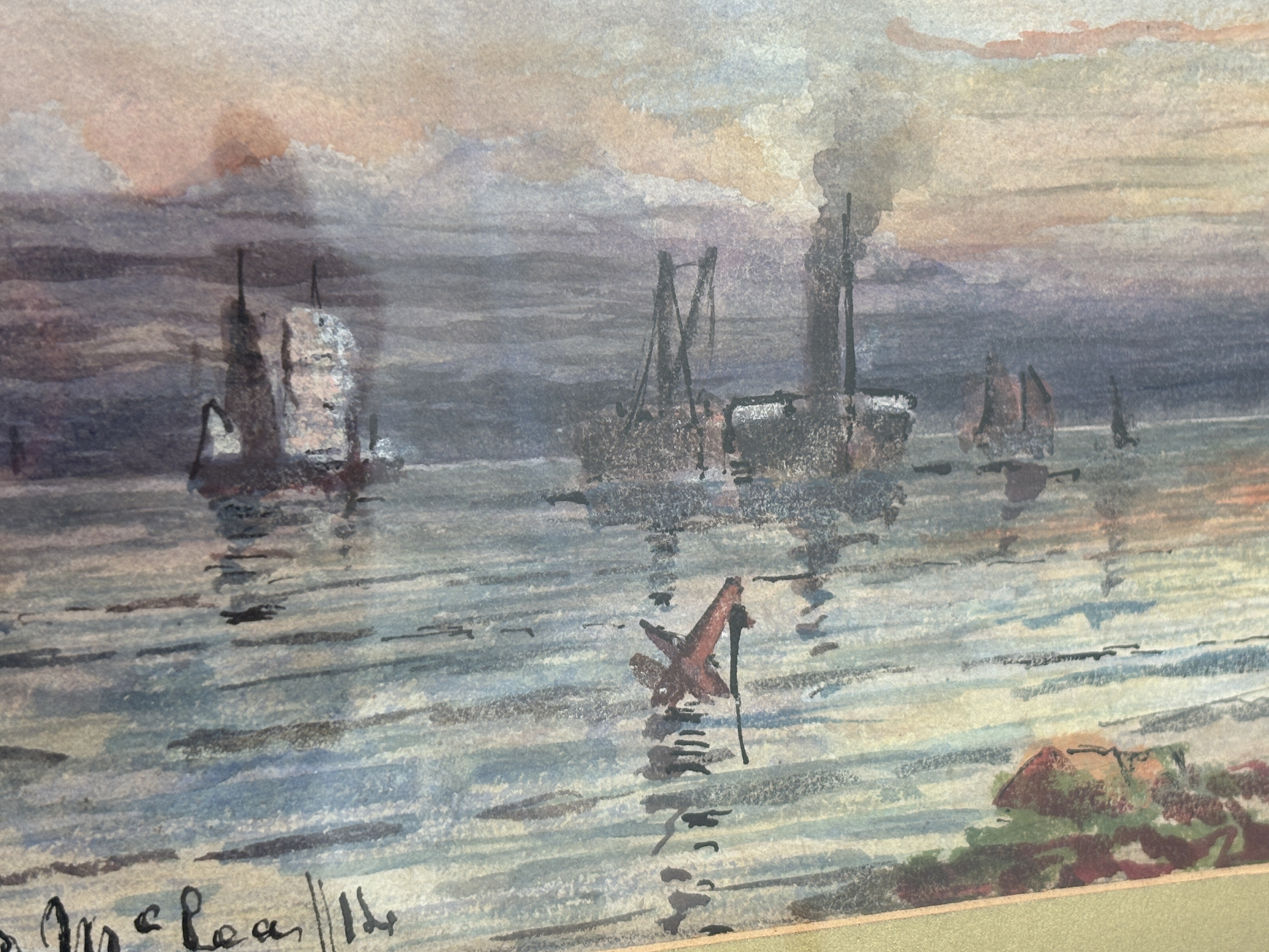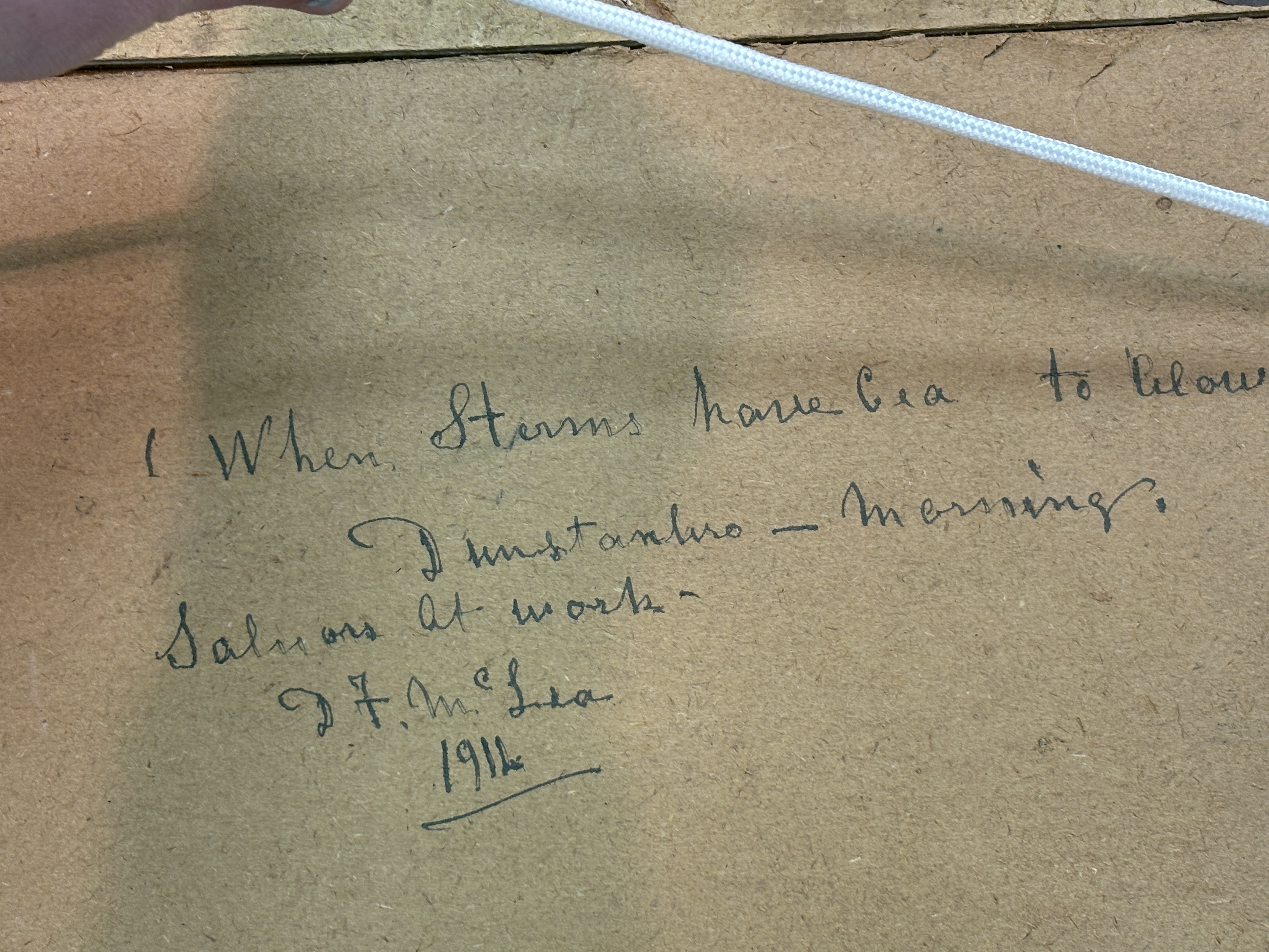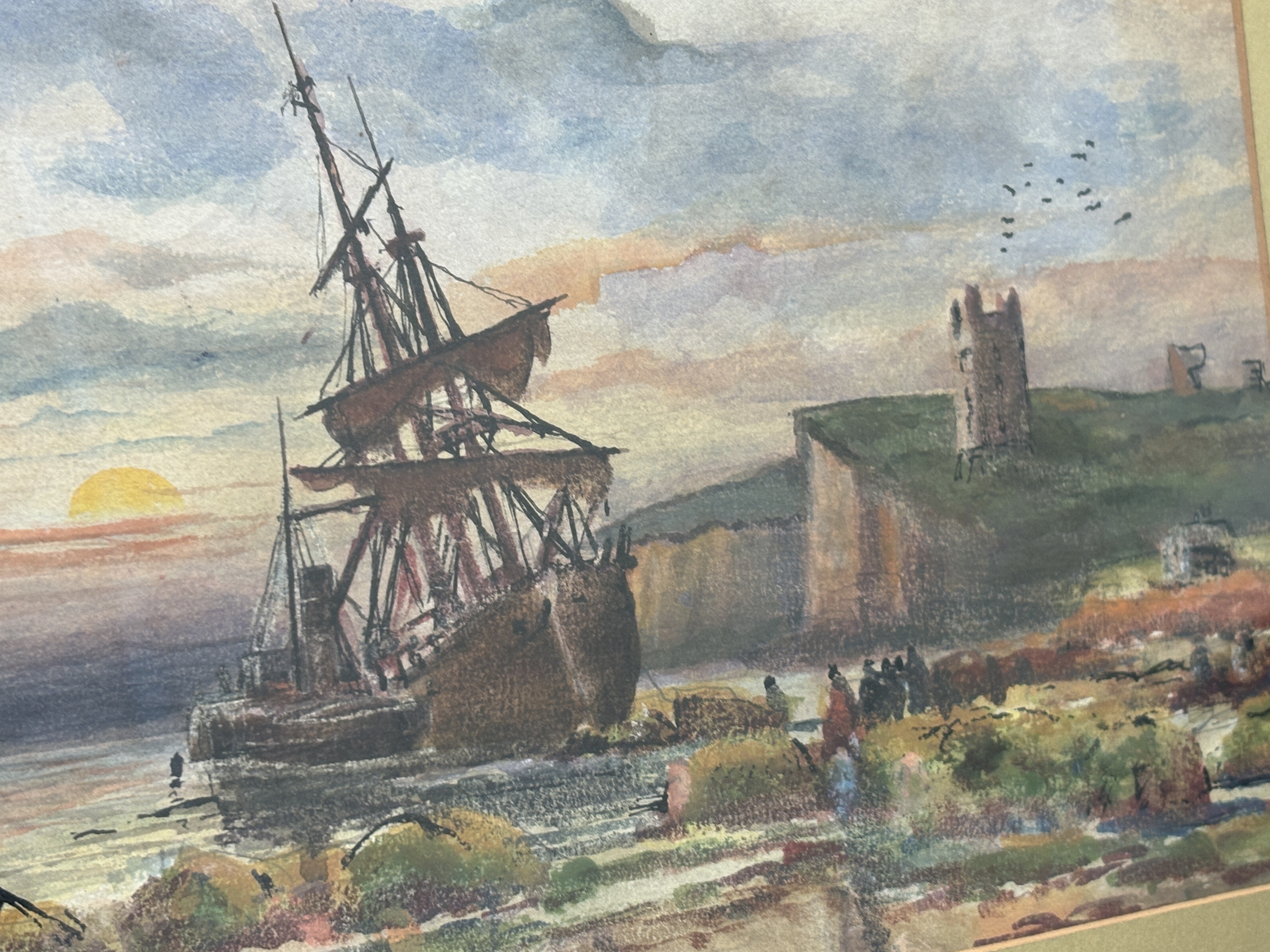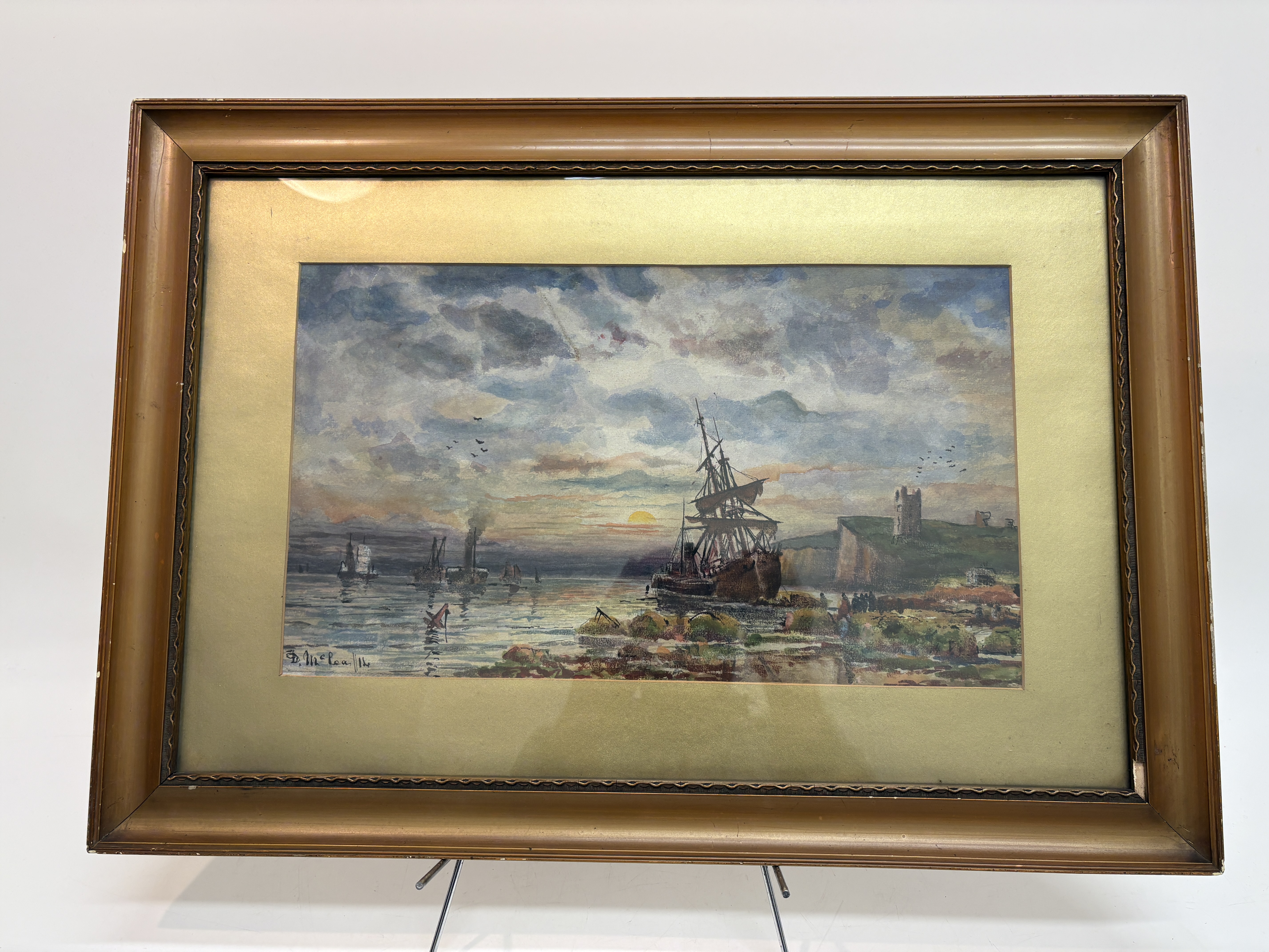 A maritime scene executed in watercolour and gouache on paper by the Scottish artist David Fraser McLea. The work depicts a beached sailing vessel on a rocky shoreline with figures engaged in salvage operations. In the background, the silhouette of Dunstanburgh Castle, specifically the Lilburn Tower, is visible on the cliffs against a sunrise. The middle ground shows further vessels, including a steamship with a smoking funnel. The sky is rendered with atmospheric clouds and a low sun. The work is signed to the lower left. The verso of the backing board bears a handwritten inscription in ink which reads: When Storms have Ceas to blow, Dunstanbro – morning., Sailors at work-, D.F. McLea, 1914. The painting is housed in a period molded gilt frame with a textured gold-toned mount.