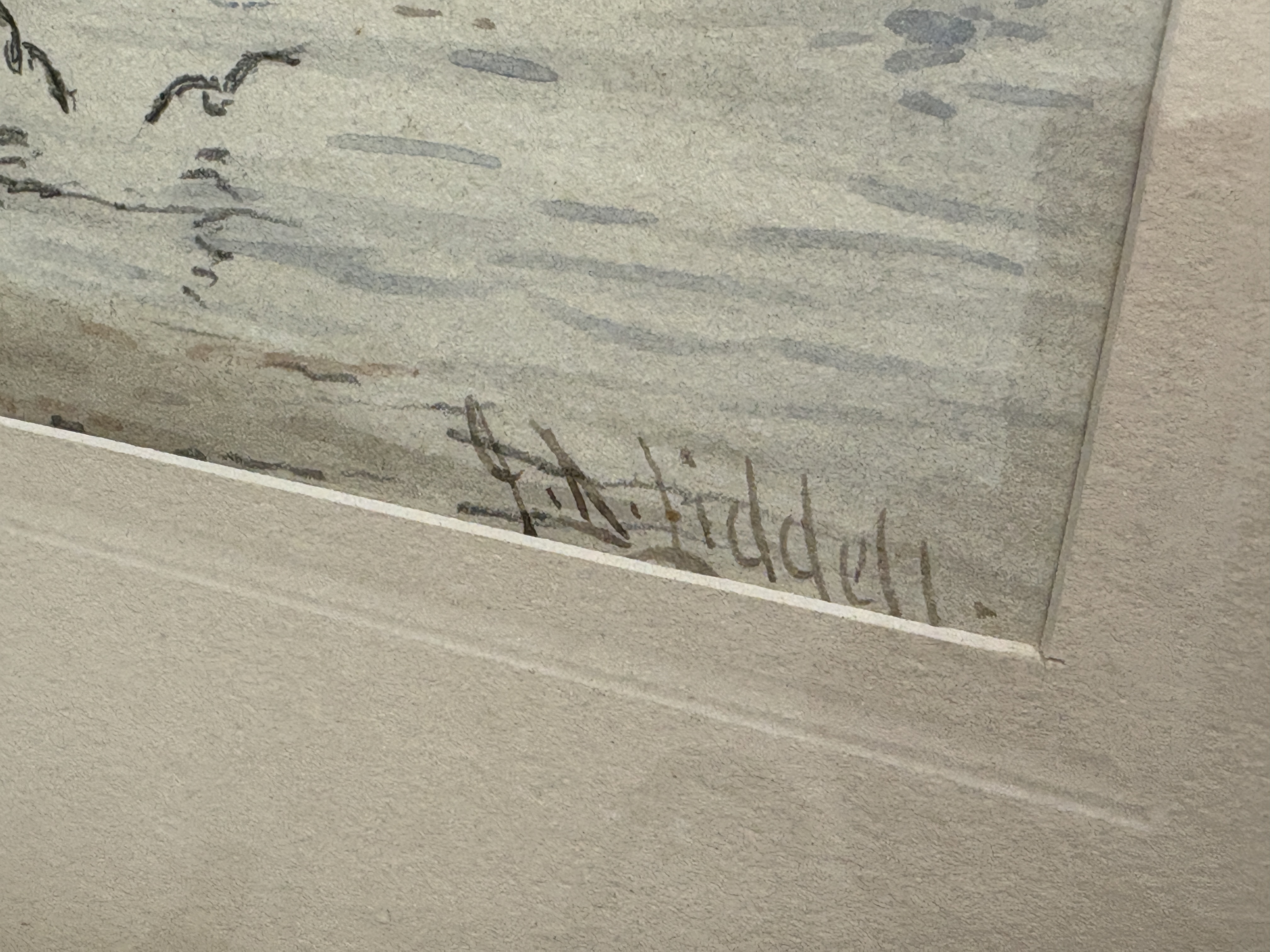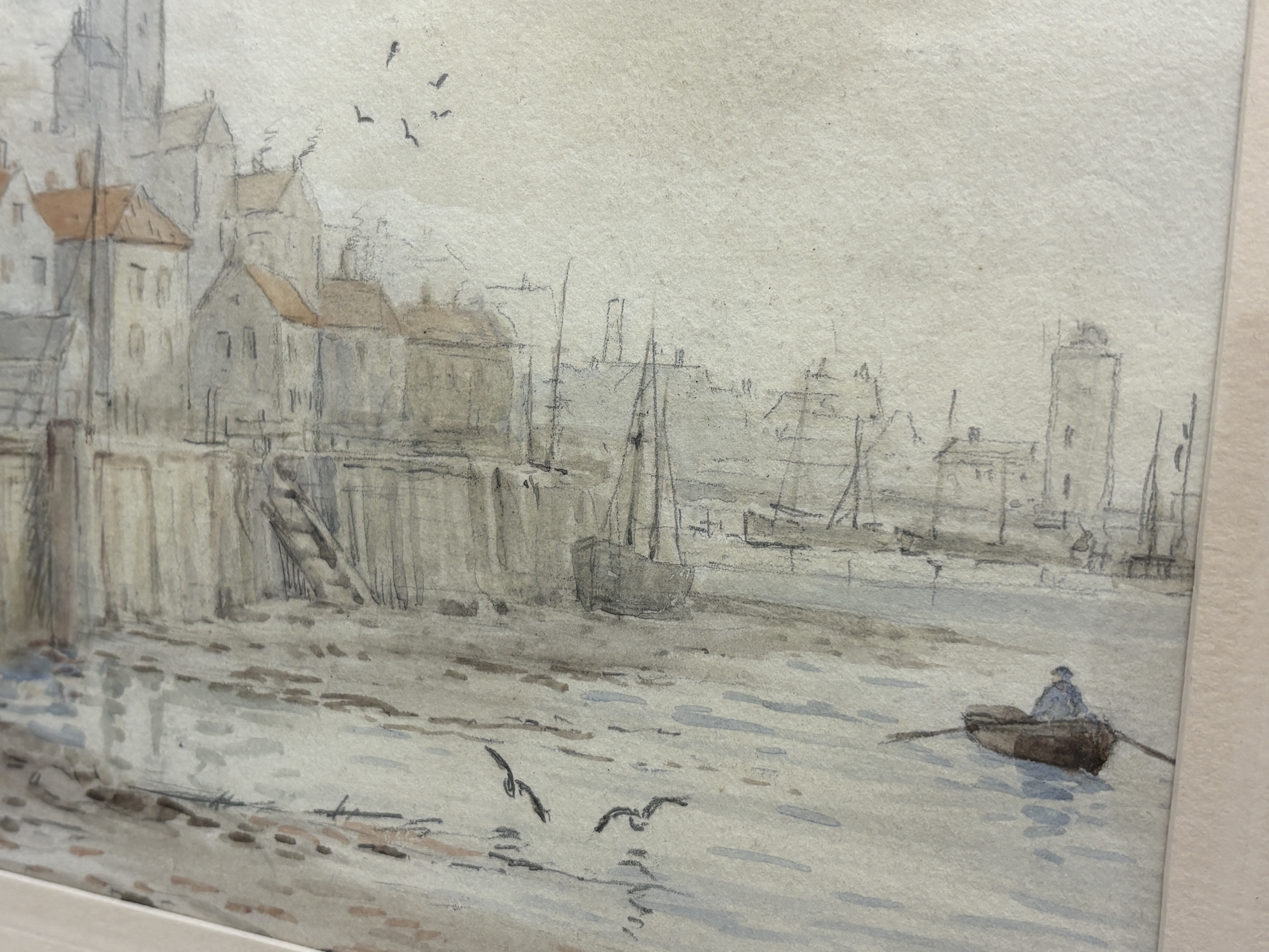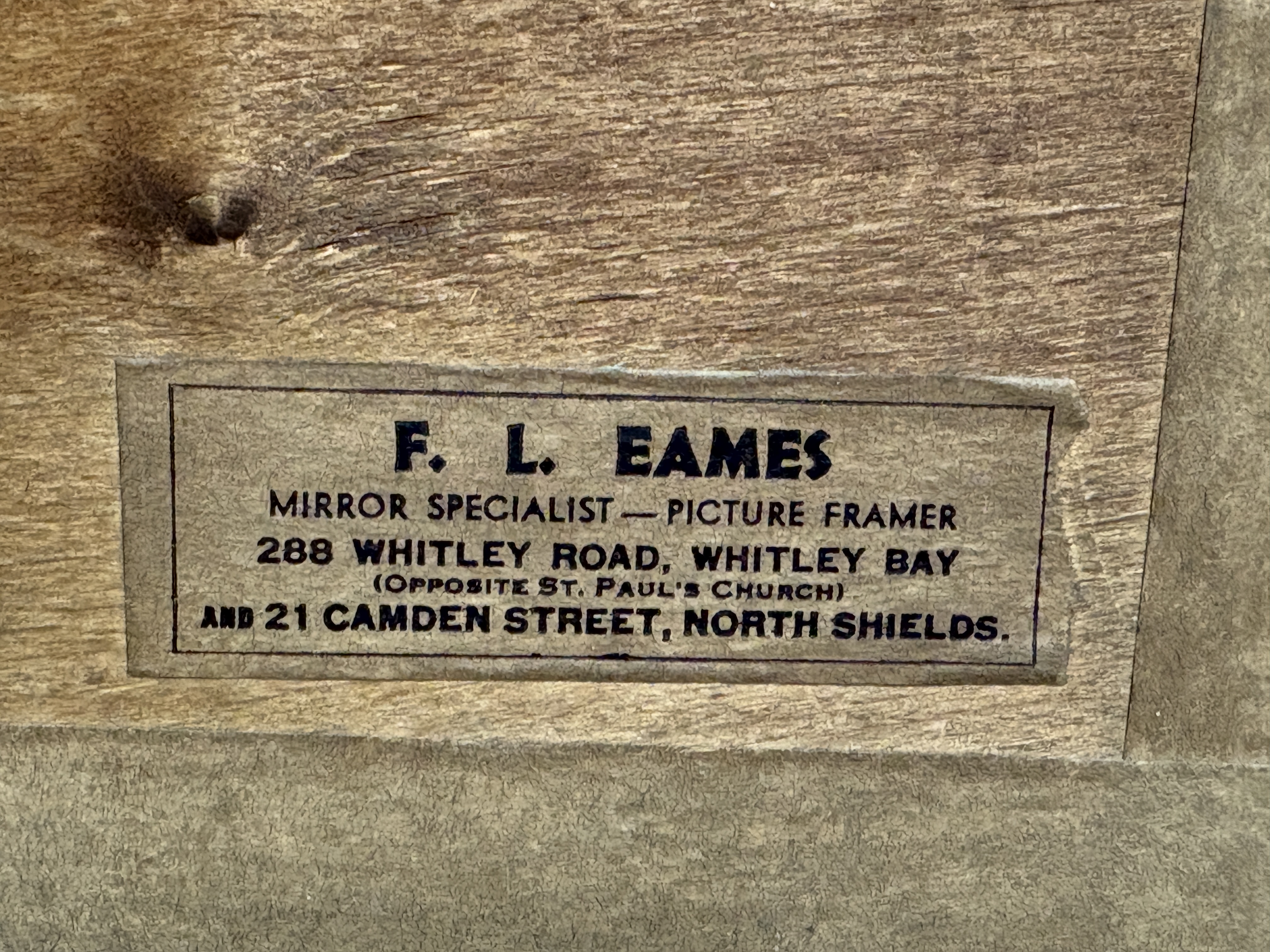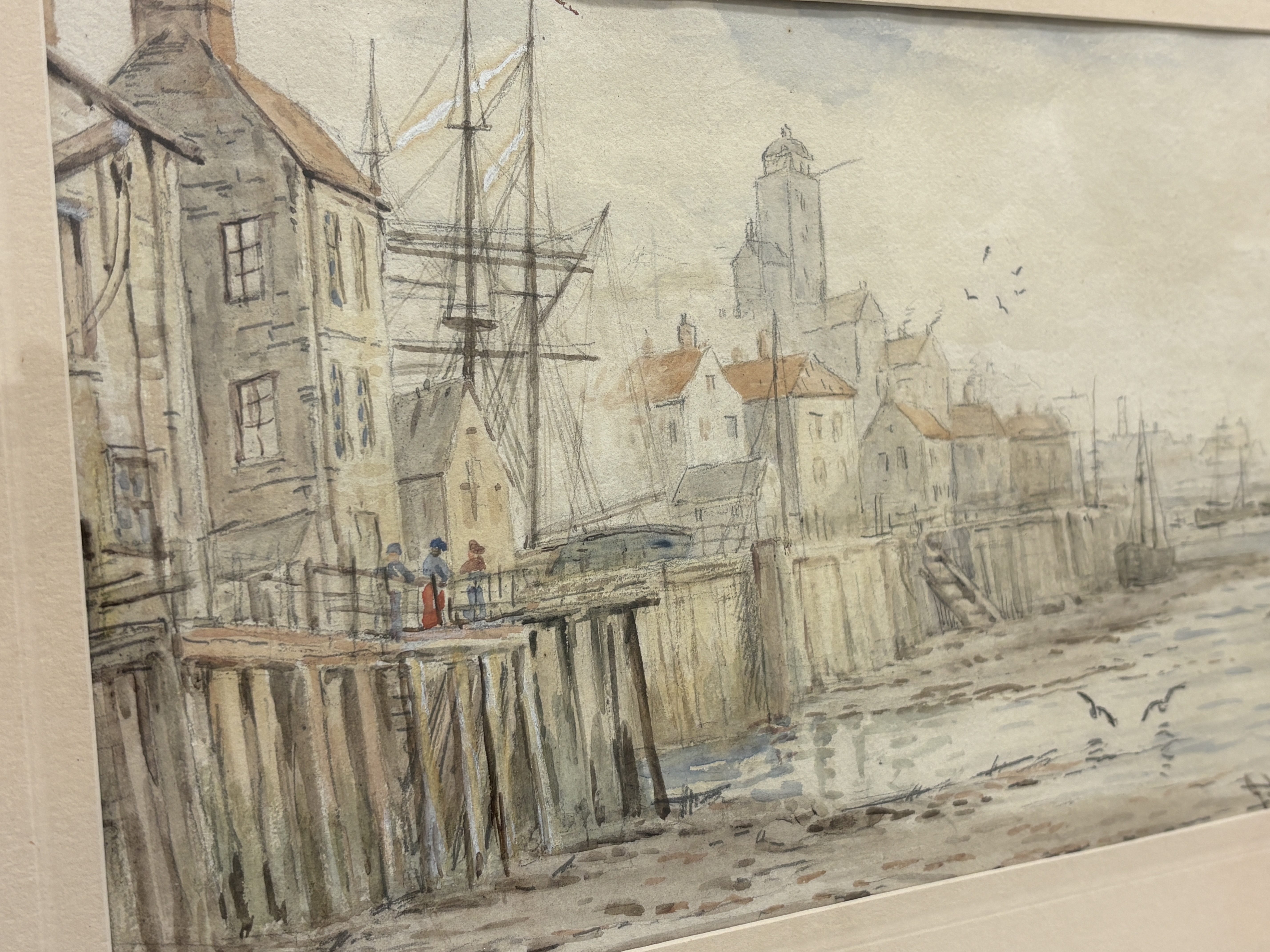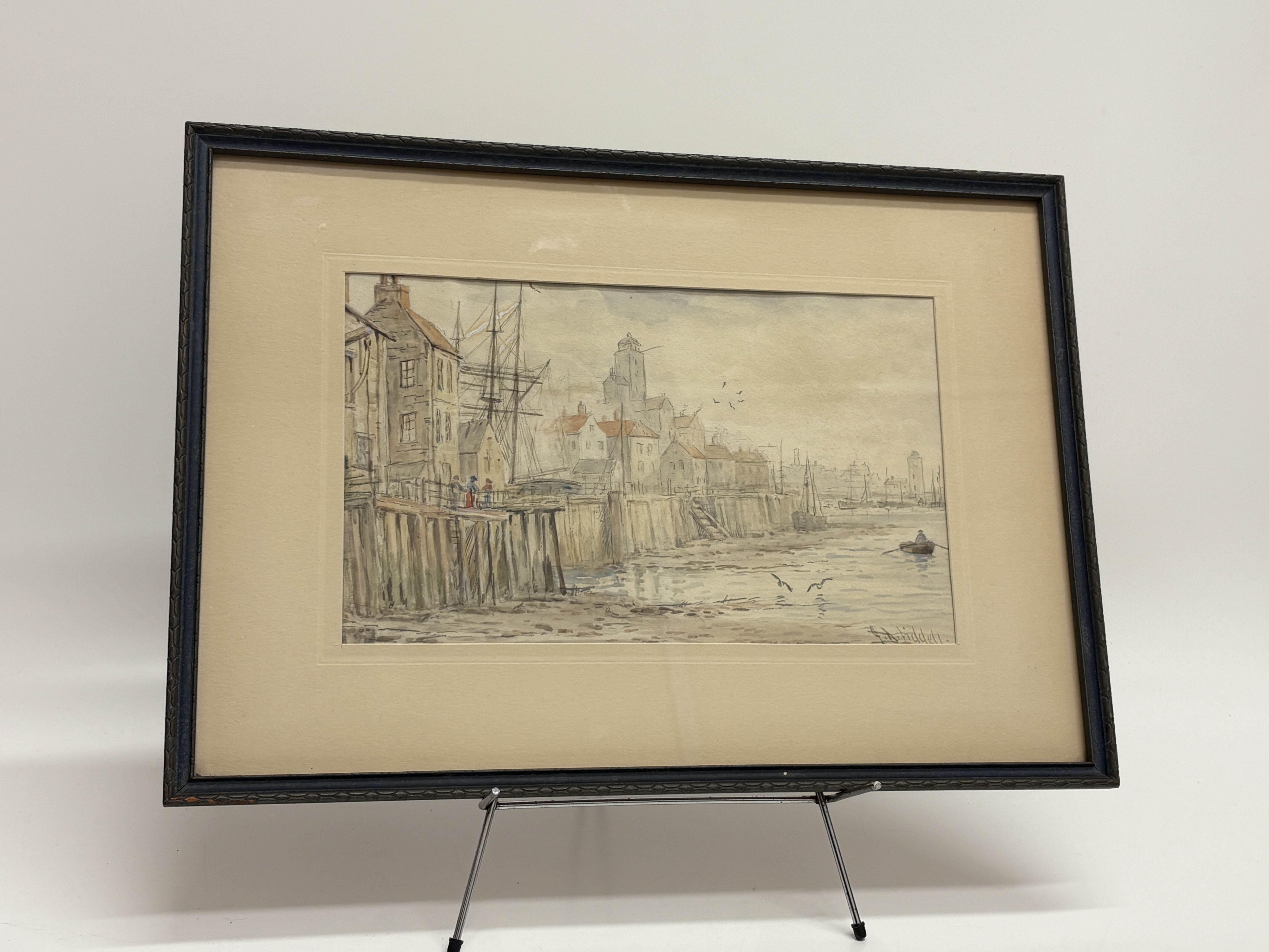 This watercolour and pencil on paper depicts a bustling coastal harbour scene, a topographical view of North Shields. The composition features figures standing upon a weathered wooden pier in the foreground, adjacent to moored sailing vessels, with a row of townhouses and a prominent watchtower or lighthouse, potentially the High Light, rising in the misty background. Signed Liddell  in the lower right corner. The piece is housed in a dark-stained moulded wooden frame under a mount. The verso bears a printed label for F. L. Eames, Mirror Specialist — Picture Framer, with addresses at 288 Whitley Road, Whitley Bay and 21 Camden Street, North Shields.