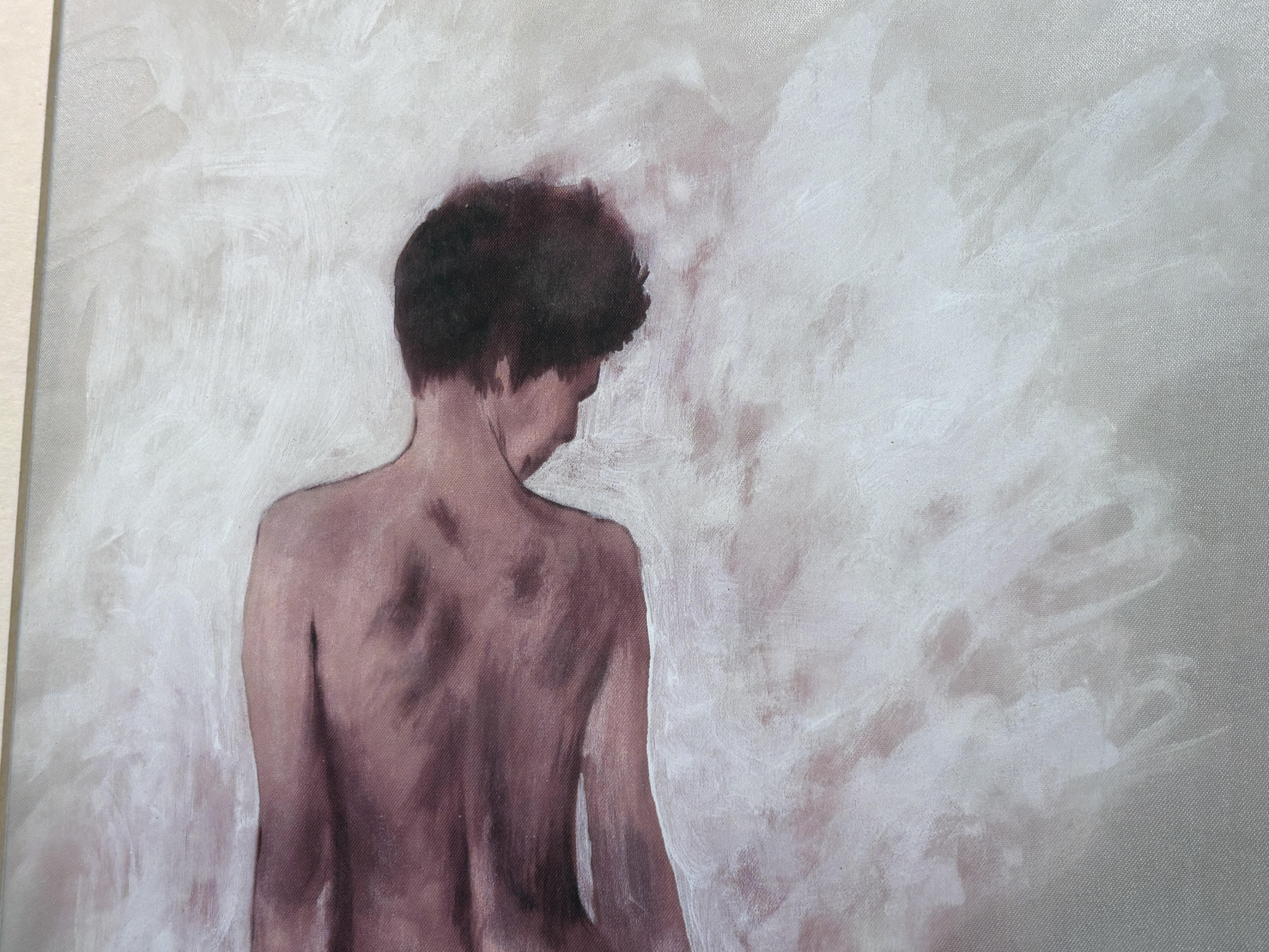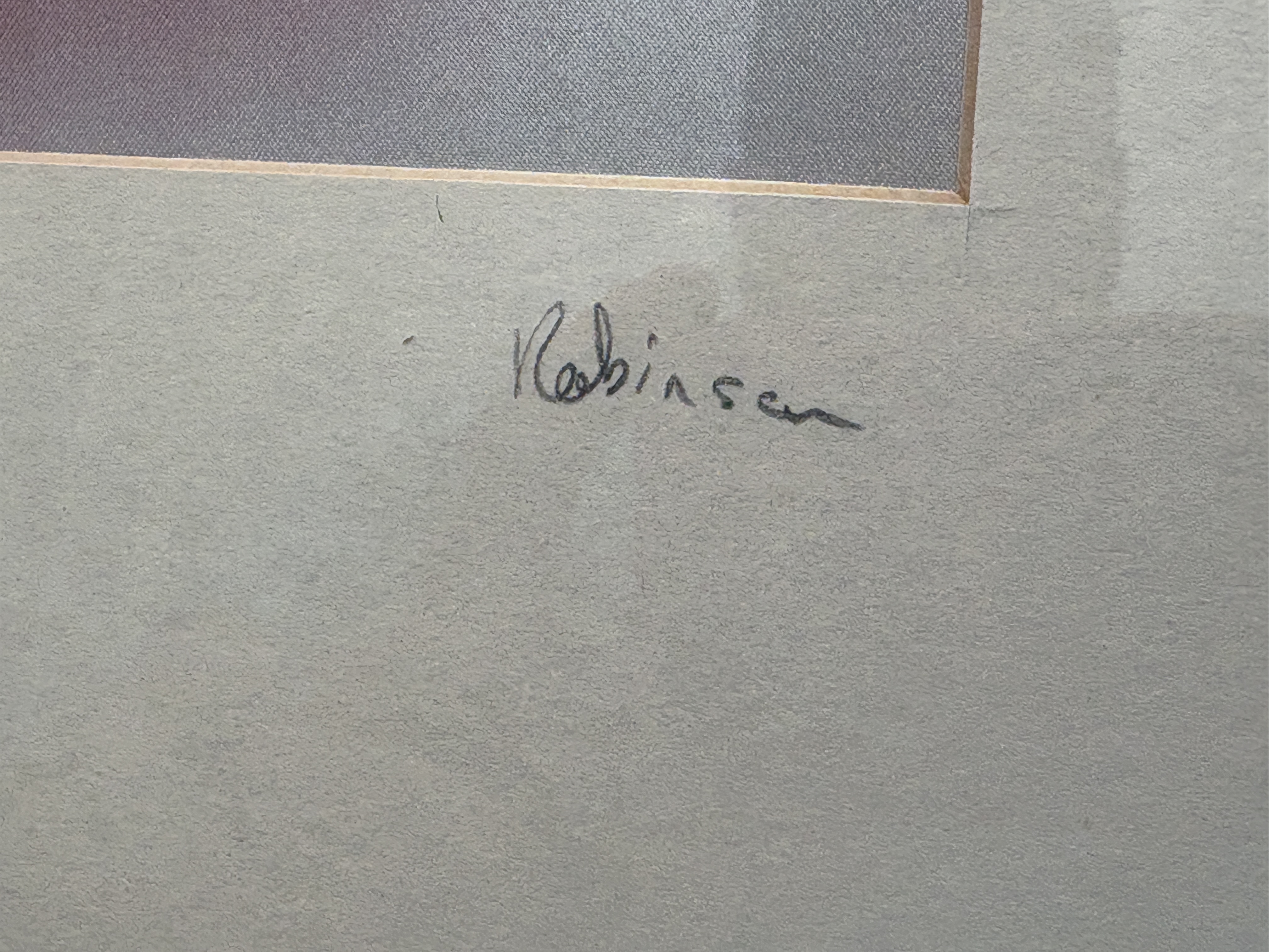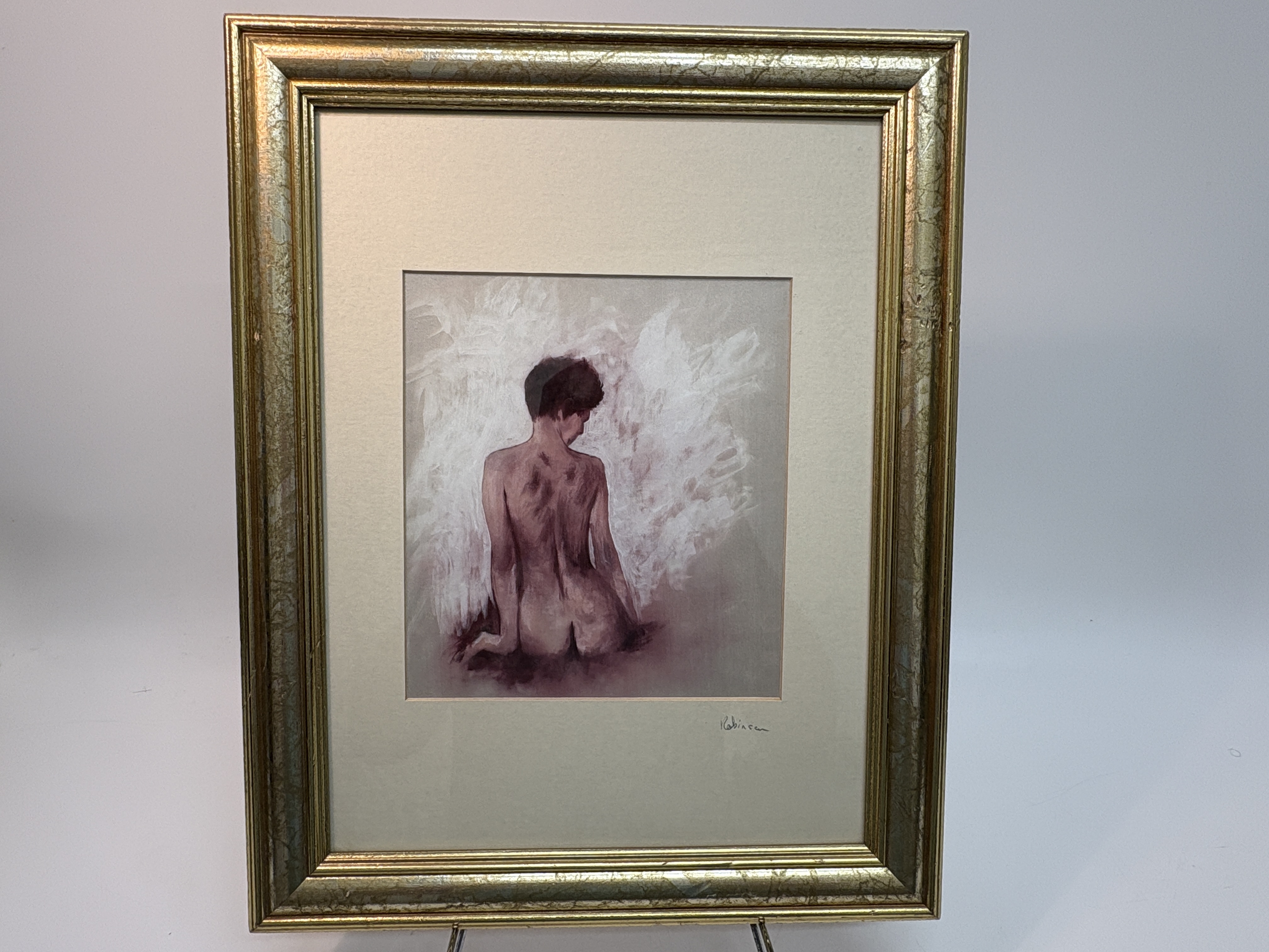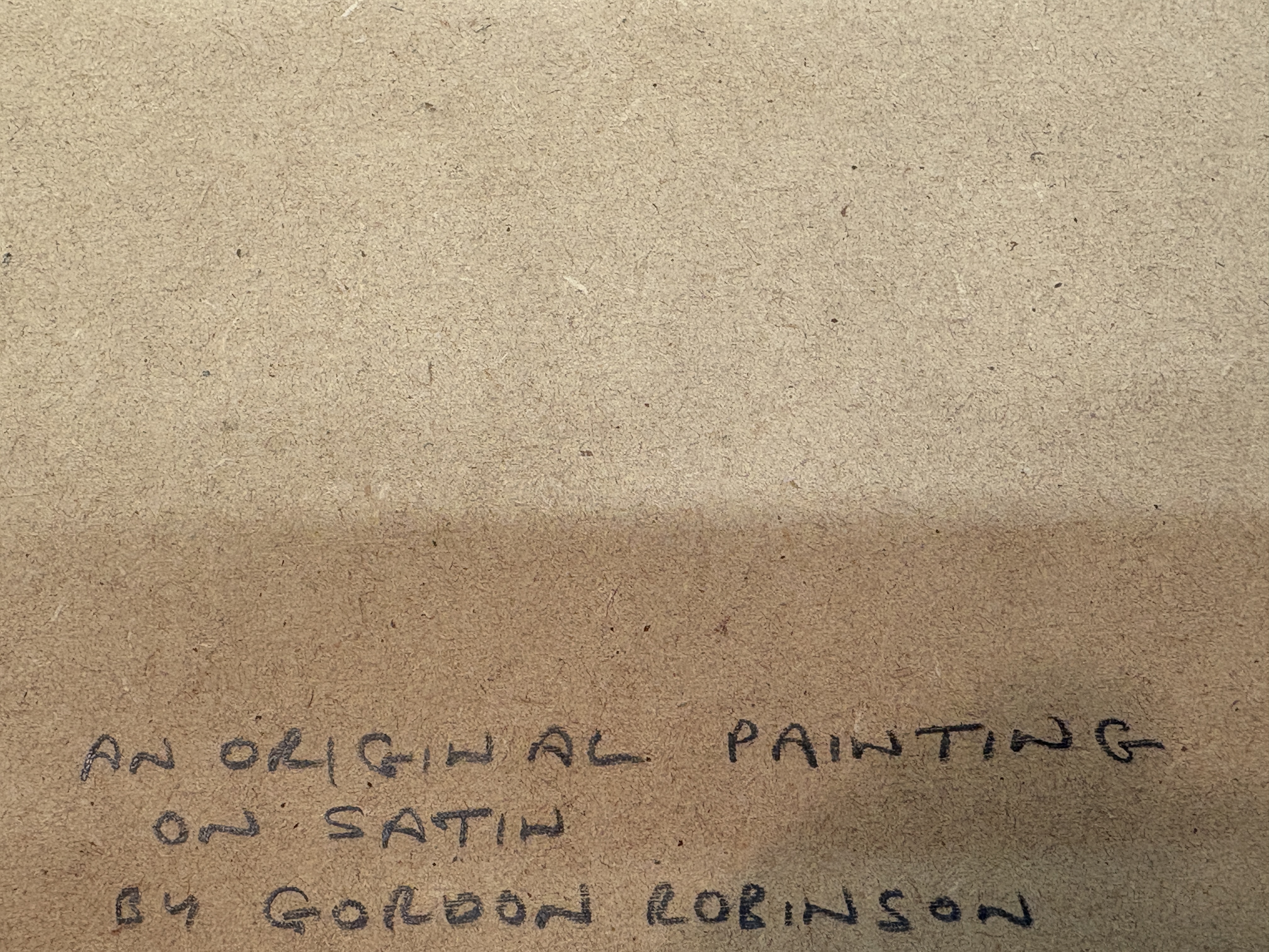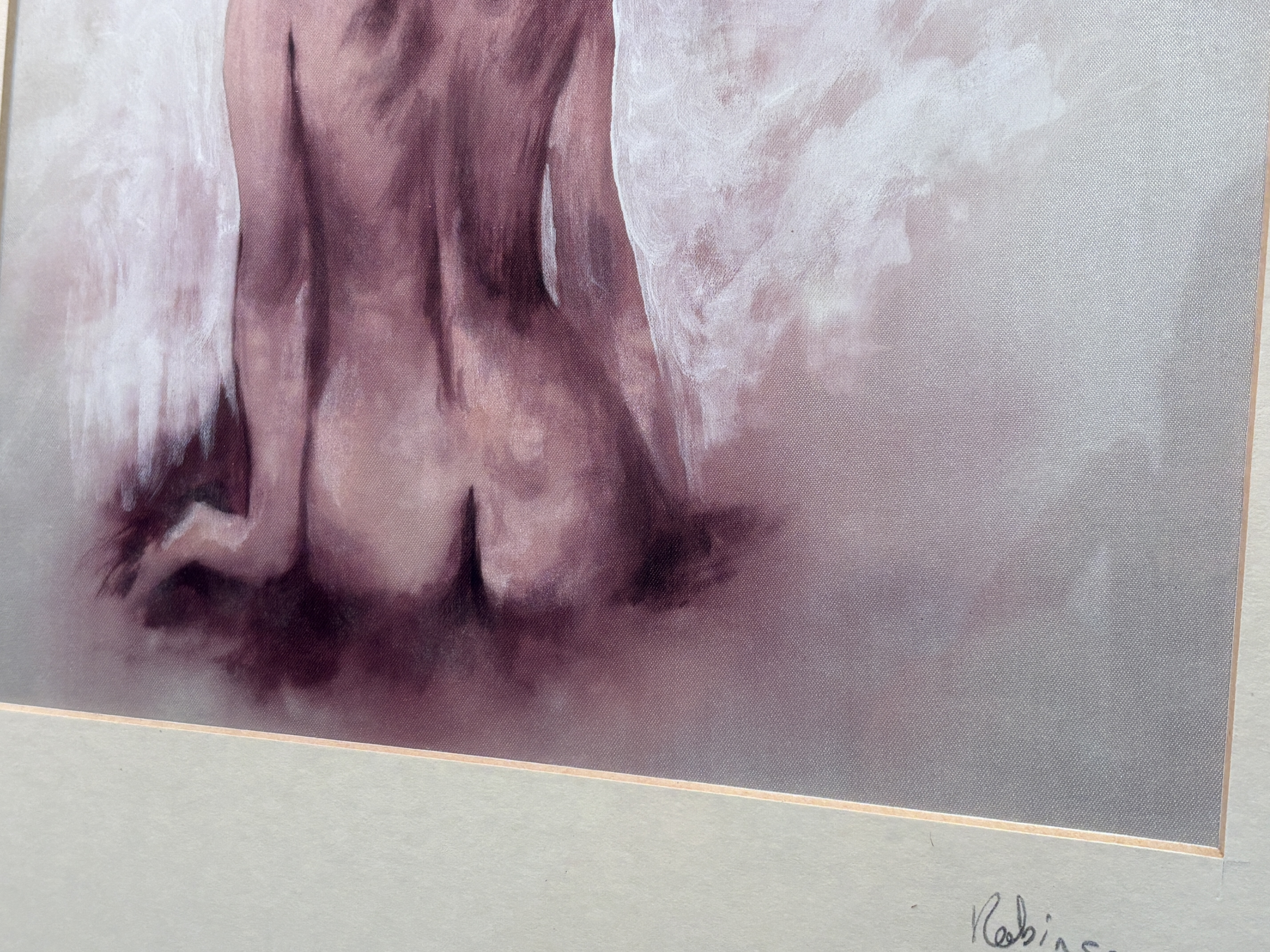 A contemporary figurative study by Gordon Robinson depicting a seated nude figure from behind. The work is executed in a muted monochromatic palette of purples, mauves, and whites, with soft, atmospheric brushwork that blends the subject into a hazy background. The distinct woven texture of the satin substrate is visible through the thin applications of paint. The painting is signed Robinson on the cream-coloured mount below the image. To the verso, a handwritten inscription on the backing board reads AN ORIGINAL PAINTING ON SATIN BY GORDON ROBINSON. Presented in an ornate, molded giltwood frame with a broad inner mount.